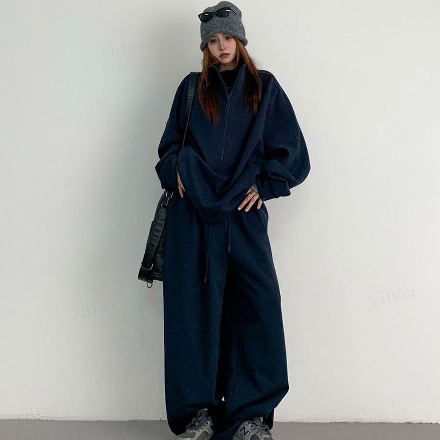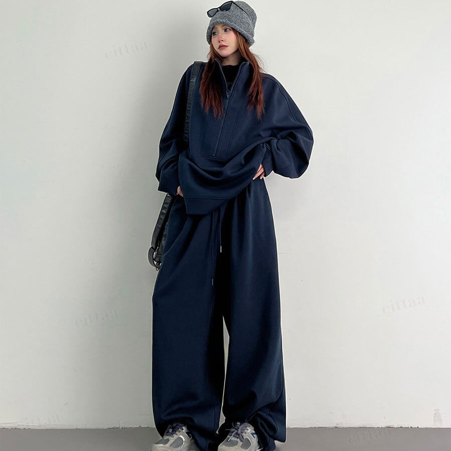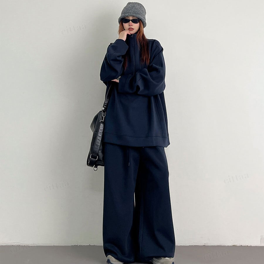 同デザインのハーフジップスウェットとセットアップで着れば、上下そろえるだけでこなれた大人カジュアルスタイルが完成します。