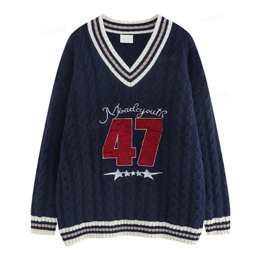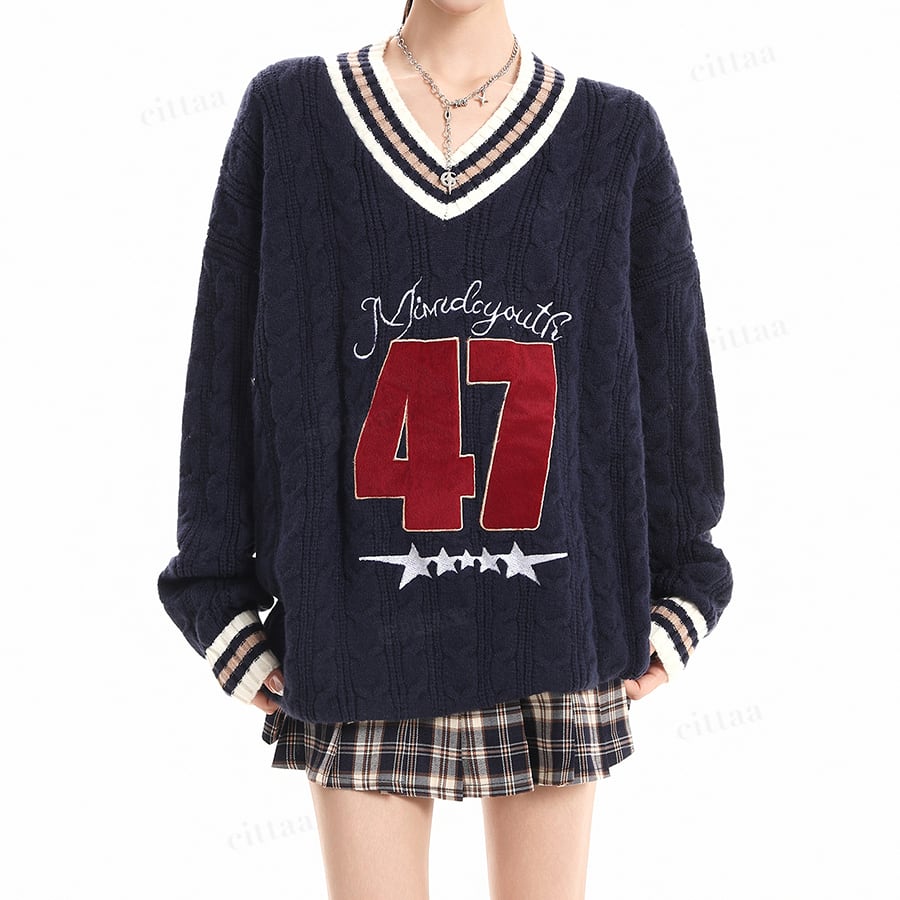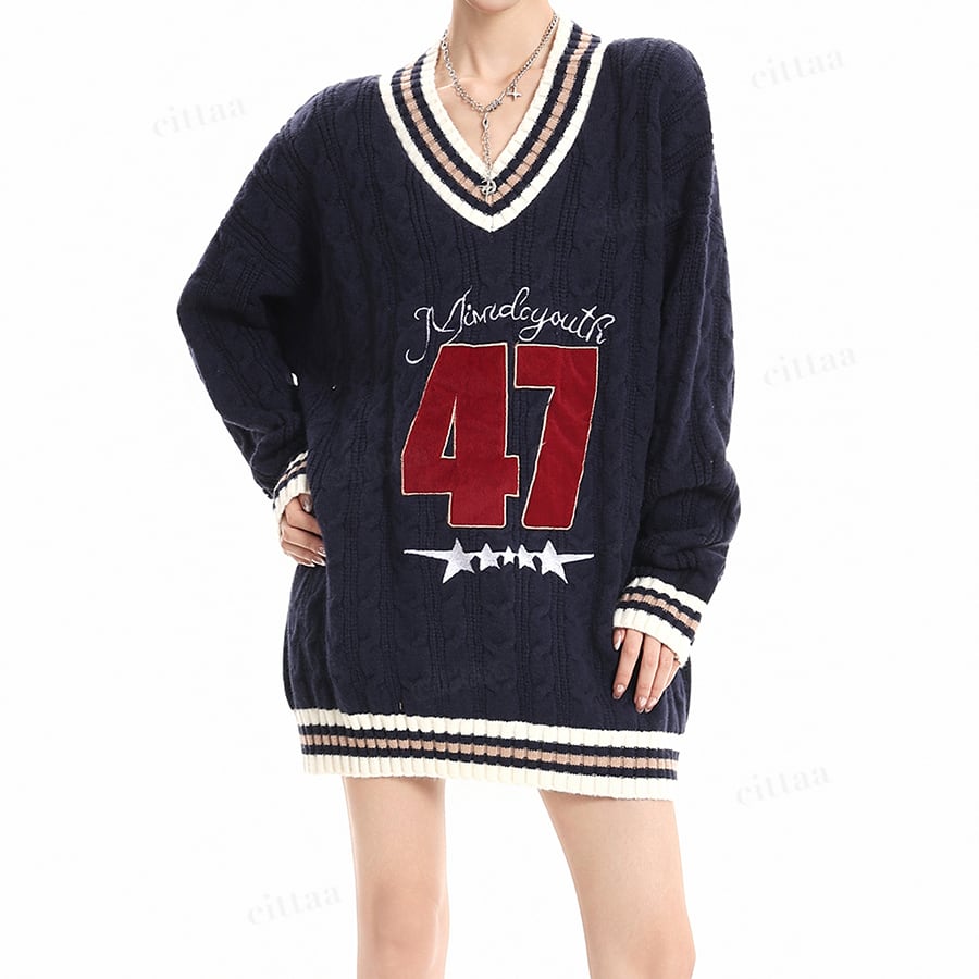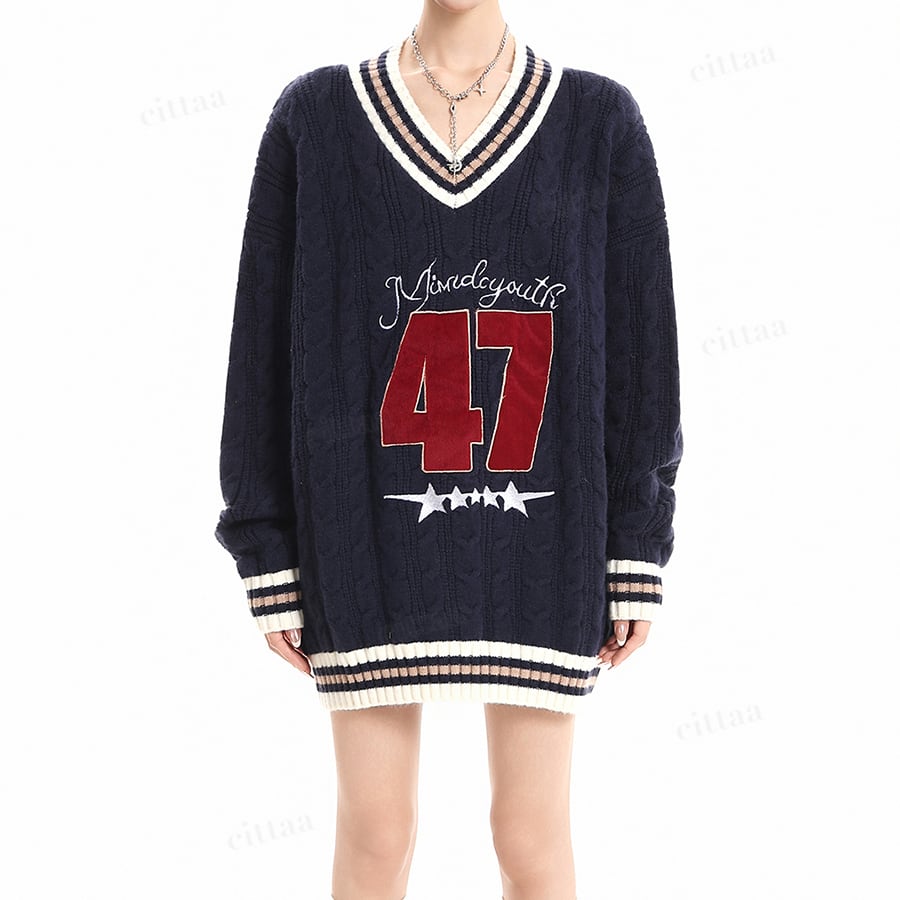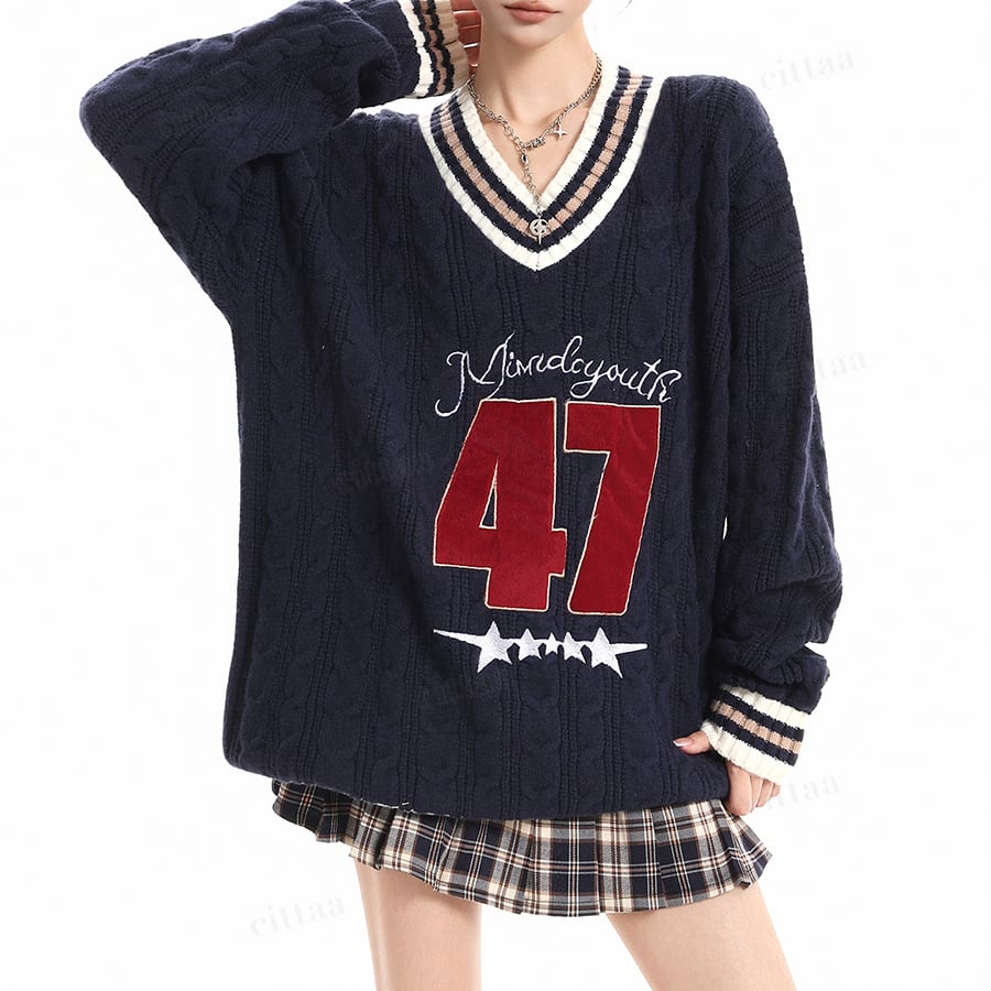 ★予約★D-721 2025秋新作♡47配色ラインVネックケーブルニット ネイビー