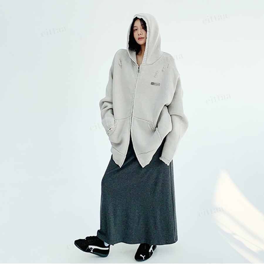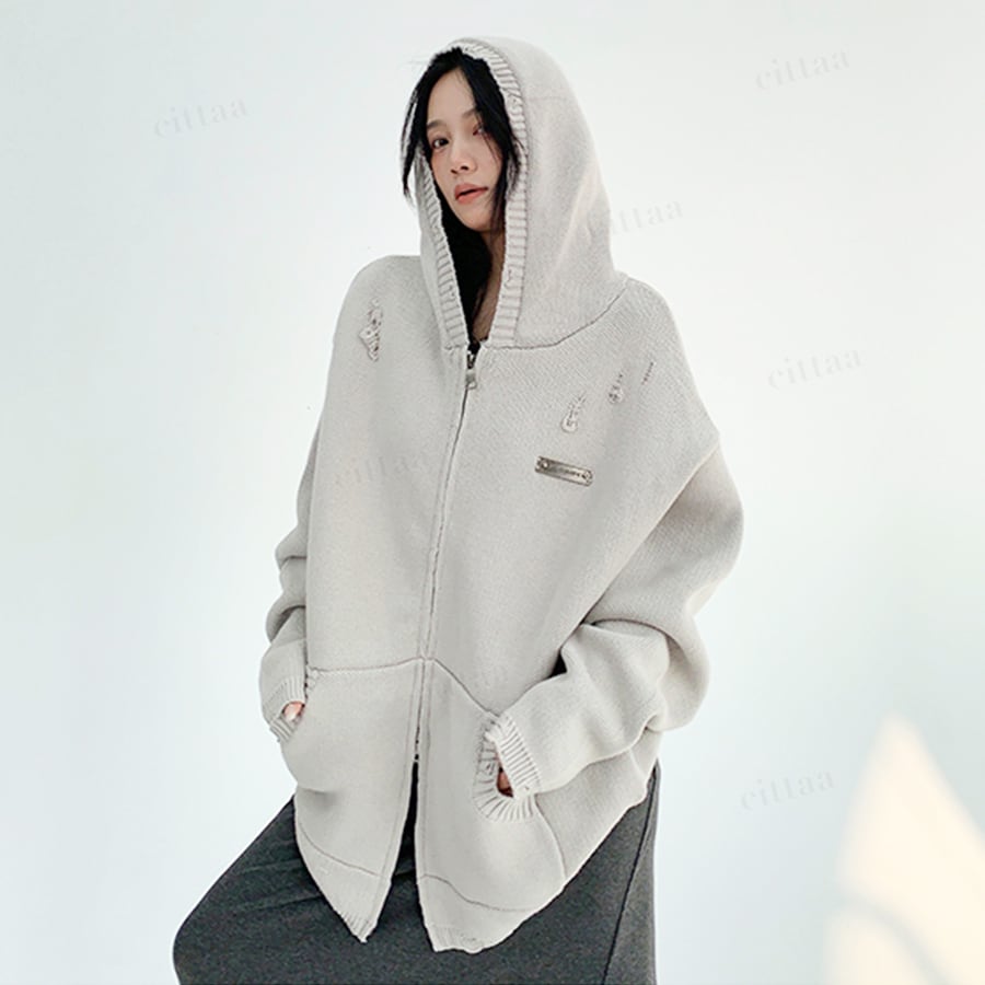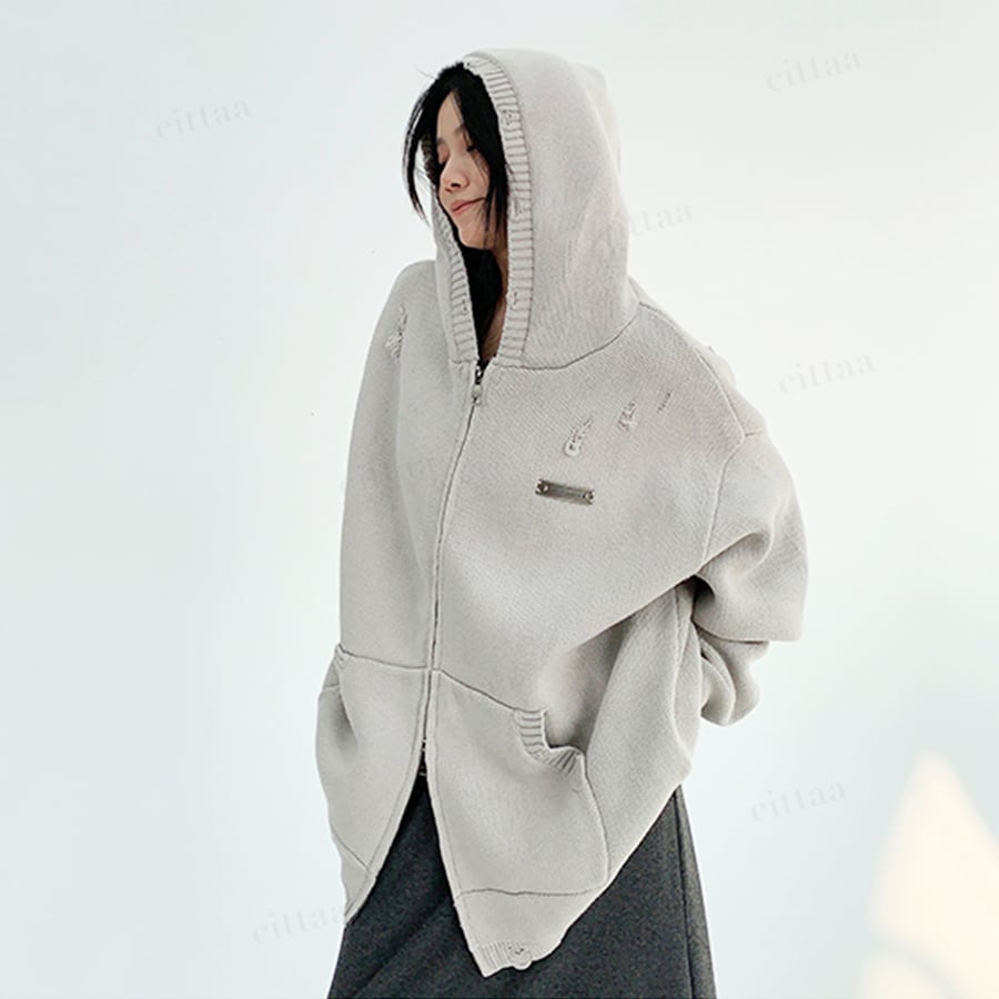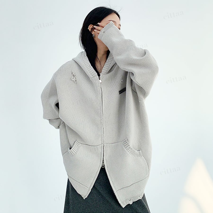 こなれ感たっぷりダメージデザインで差がつくダブルジップニットパーカー♡