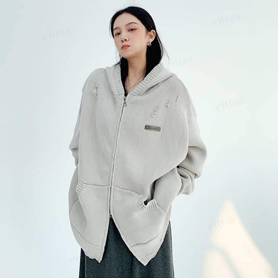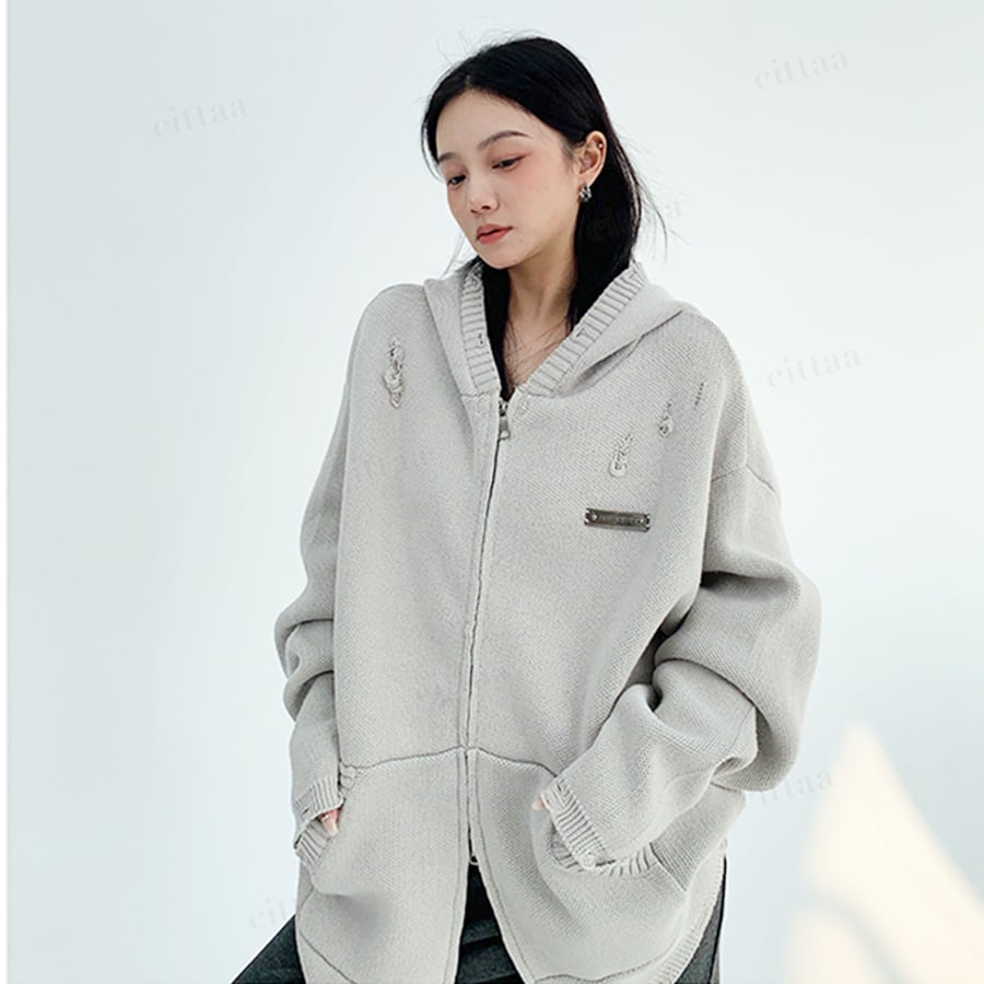 ★予約★D-733 2025秋新作♡メタルタグ付きダメージ加工ダブルジップニット グレー