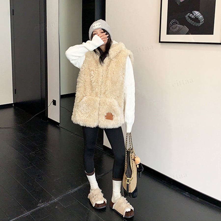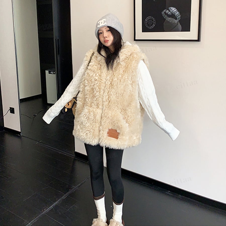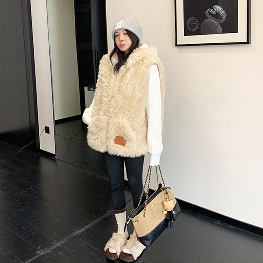 ★予約★D-736 2025秋新作♡フェイクレザーラベル付きフードファーベスト オフホワイト
