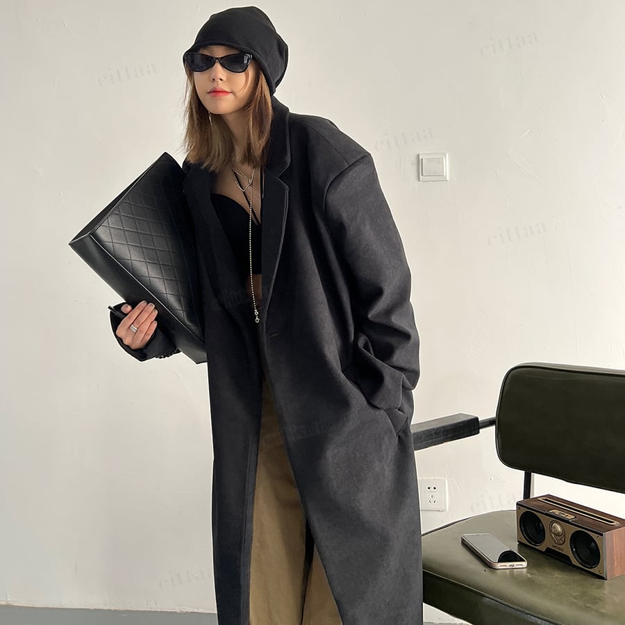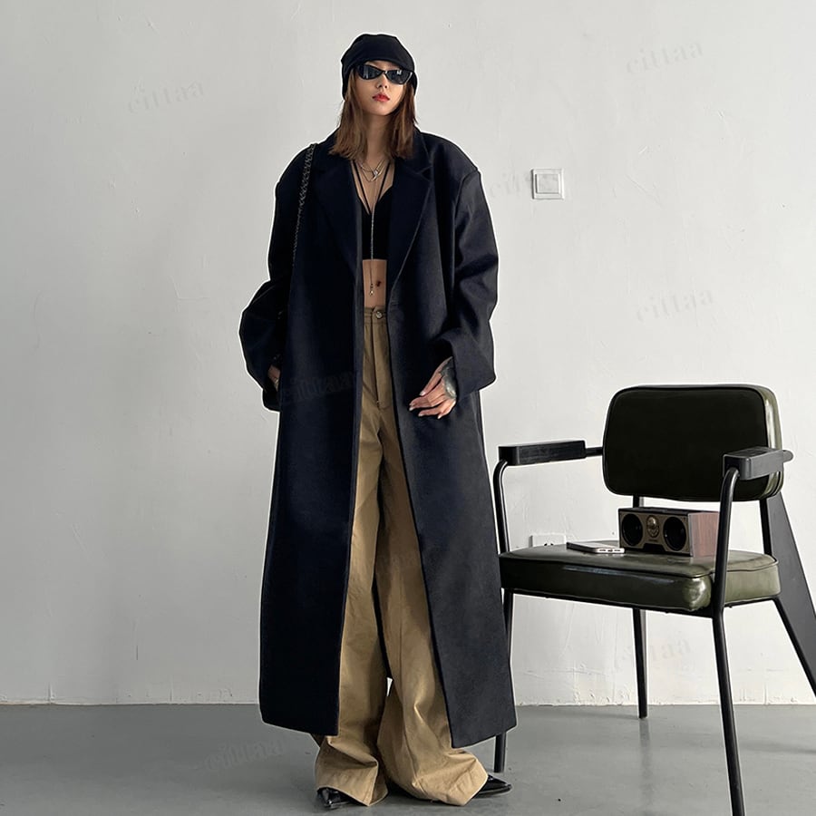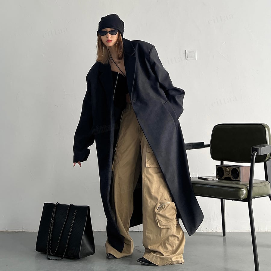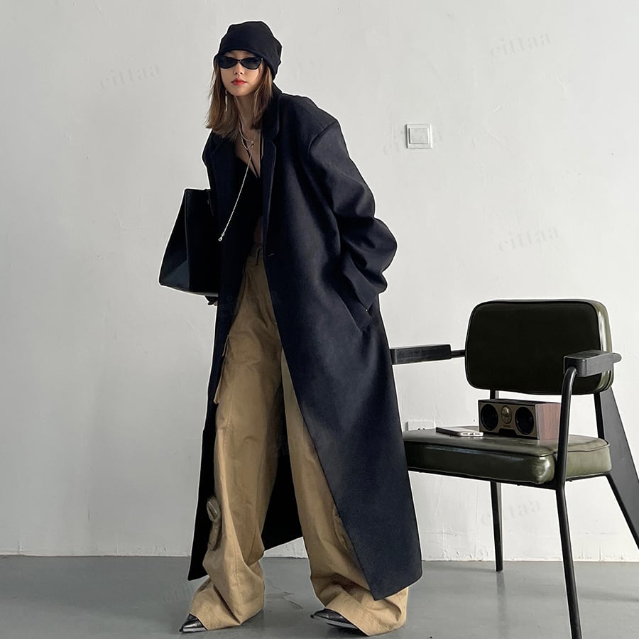 身幅にゆとりがあるので、大きめトップスの上にも羽織りやすく、ロング丈で自然に体型カバーも叶います。