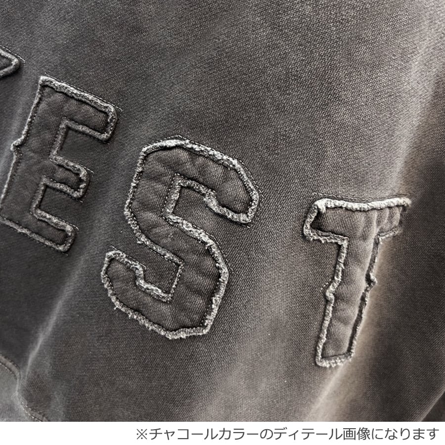 切りっぱなし仕様のワッペンロゴがほどよく辛口なムードをプラス。胸元にも刺繍ロゴをあしらい、どの角度から見てもスタイリッシュに決まります。