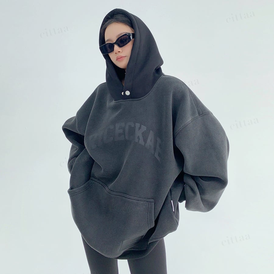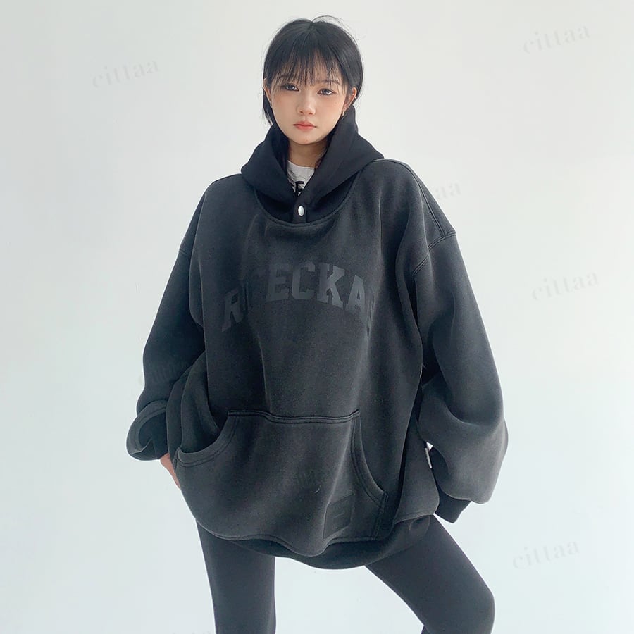 ★予約★D-748 2025秋冬新作♡RICECAKEフェイクレザーラベル付きバイカラーフーディー ブラック