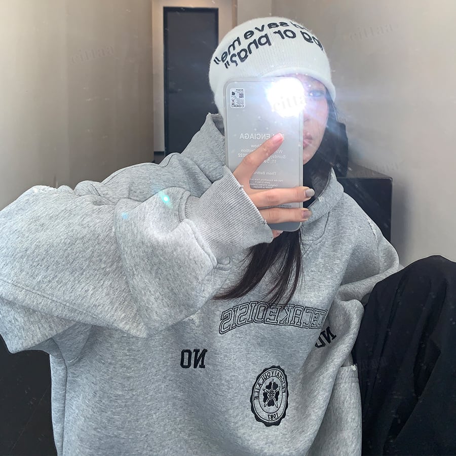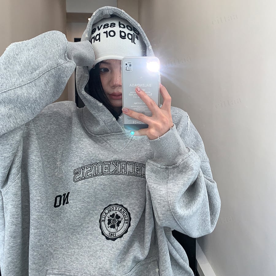 ★予約★D-758 2025秋冬新作♡RICECAKEカレッジロゴダメージ加工フーディー グレー