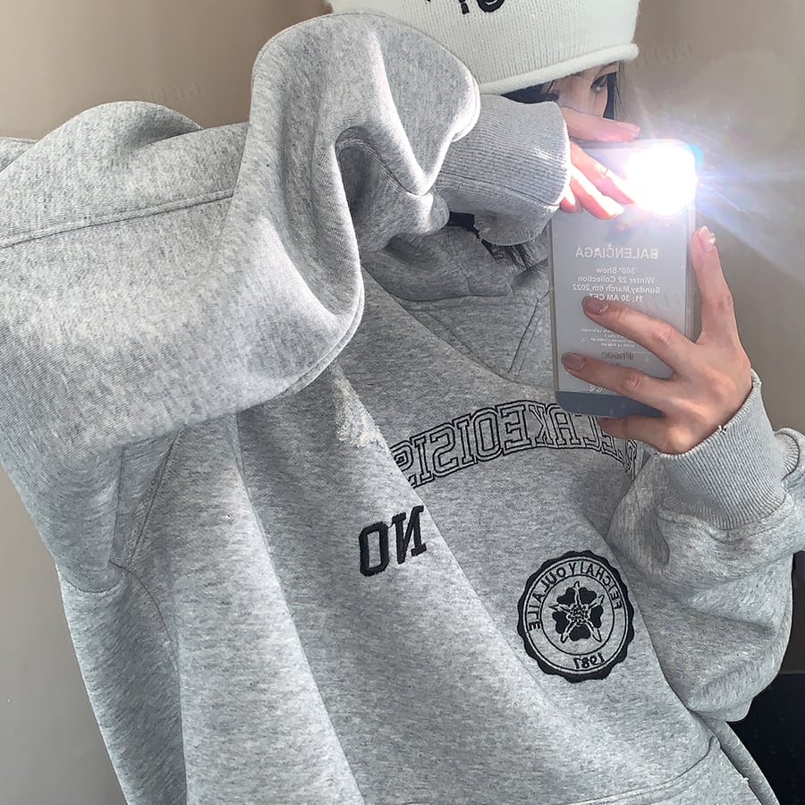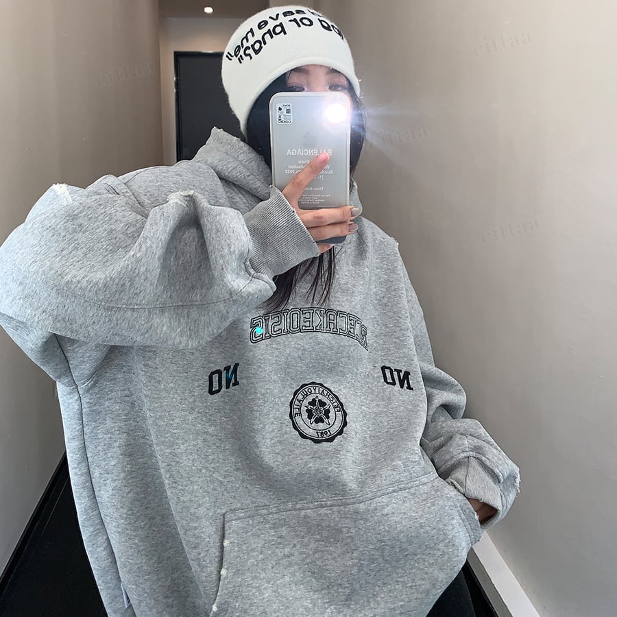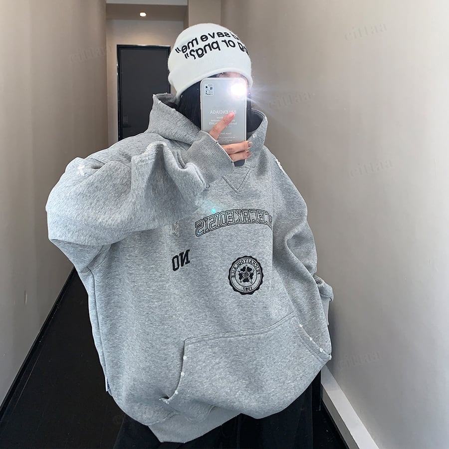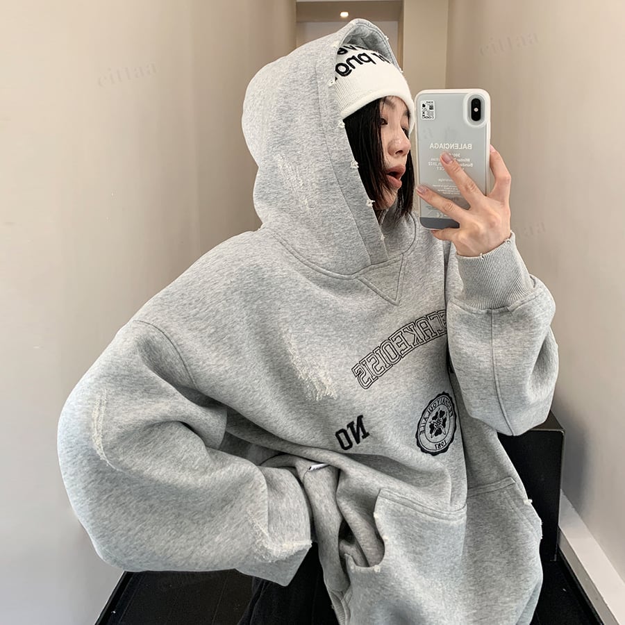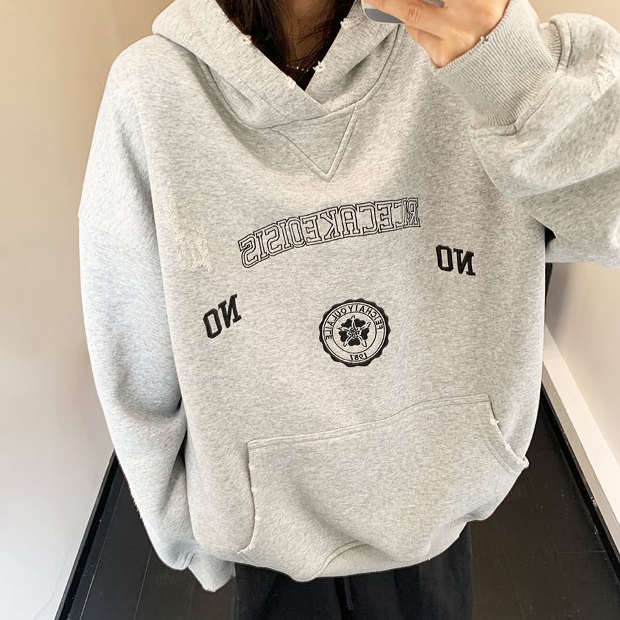 こなれ感たっぷりダメージデザインで差がつくカレッジ刺繍ロゴフーディー♡
