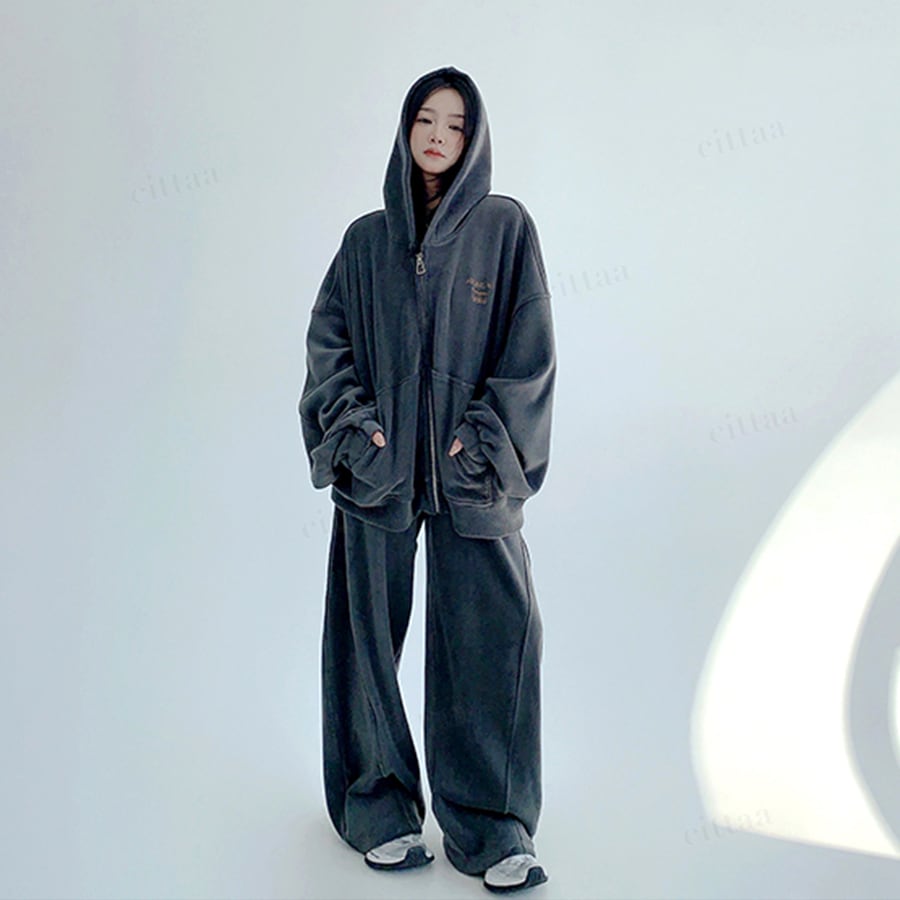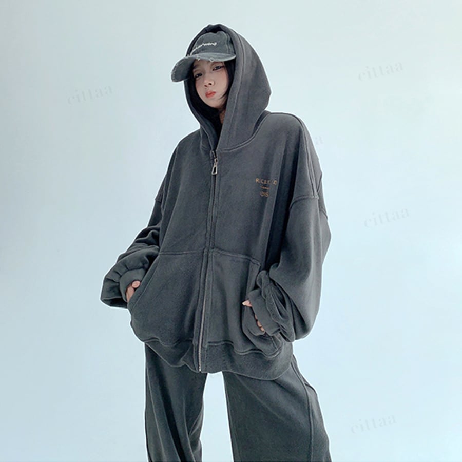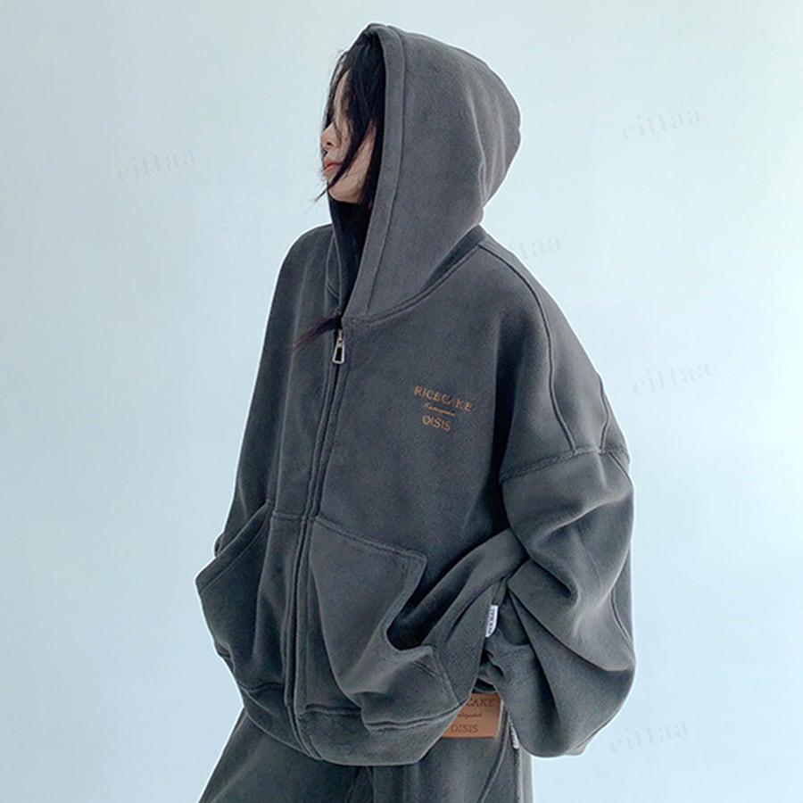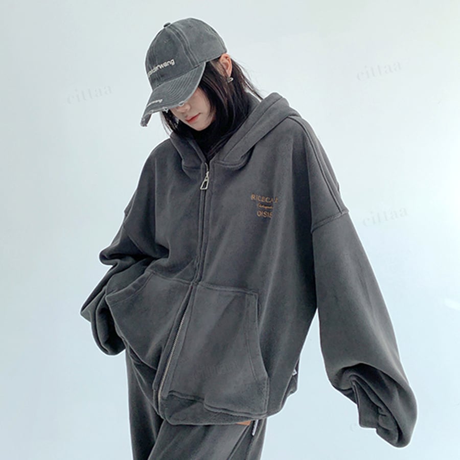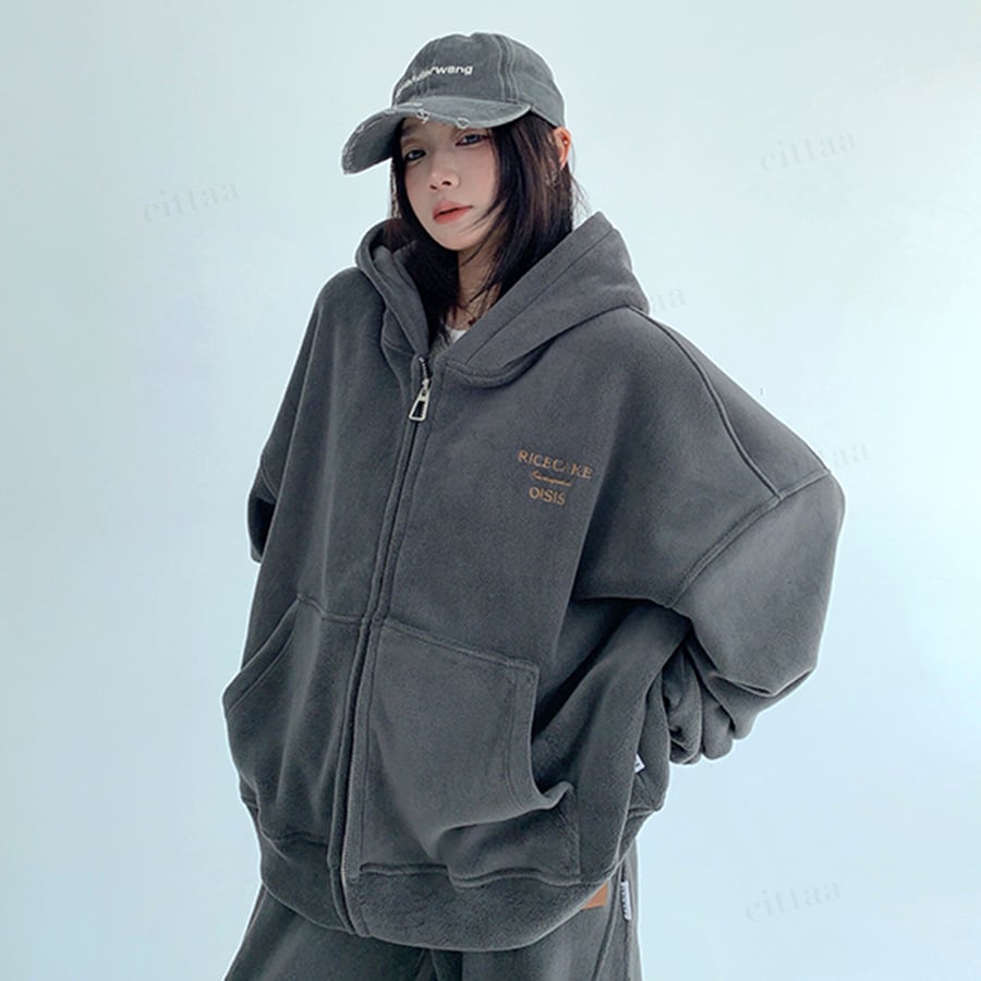 ★予約★D-775 2025秋冬新作♡【セットアップ可能】RICECAKE刺繍ロゴフリースジップアップパーカー ダークグレー