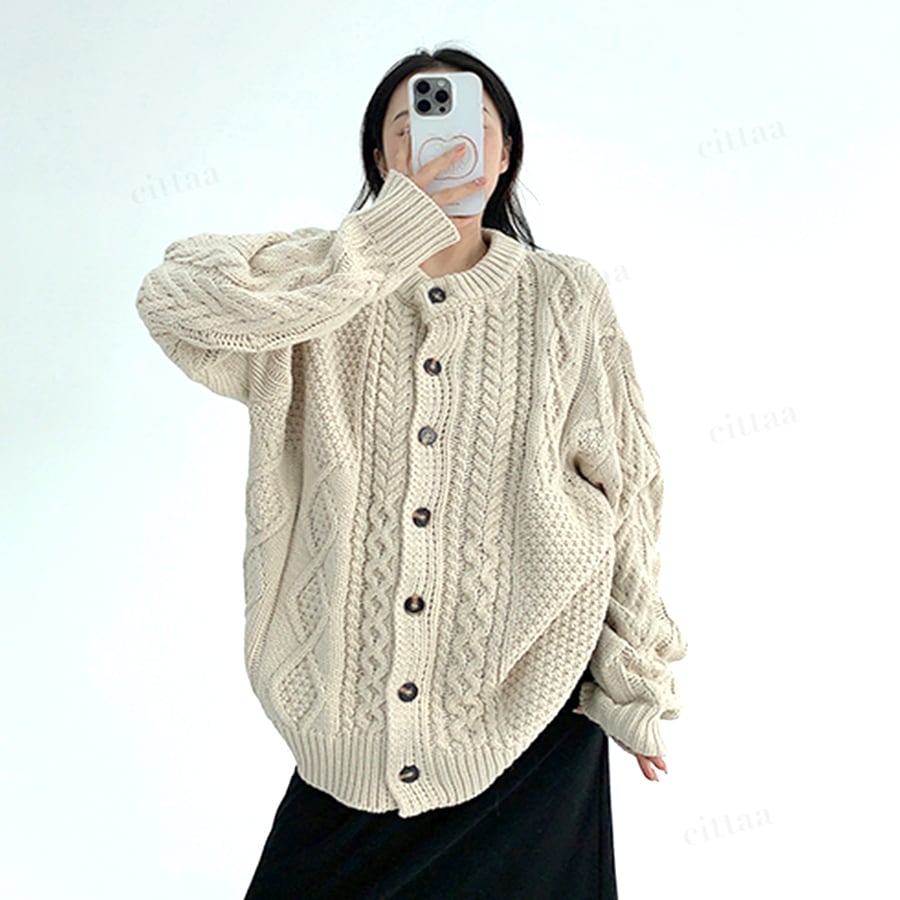 アシンメトリーな編み柄で差がつくケーブル編みニットカーディガン♡