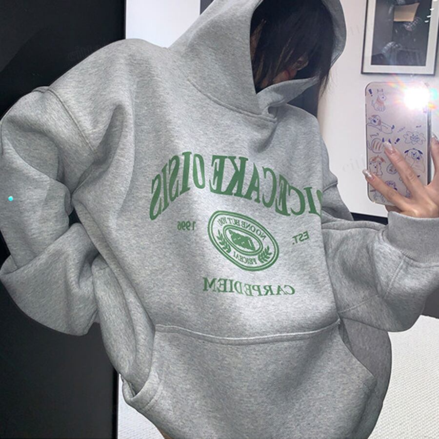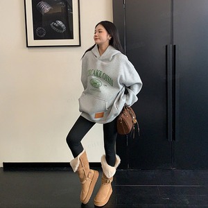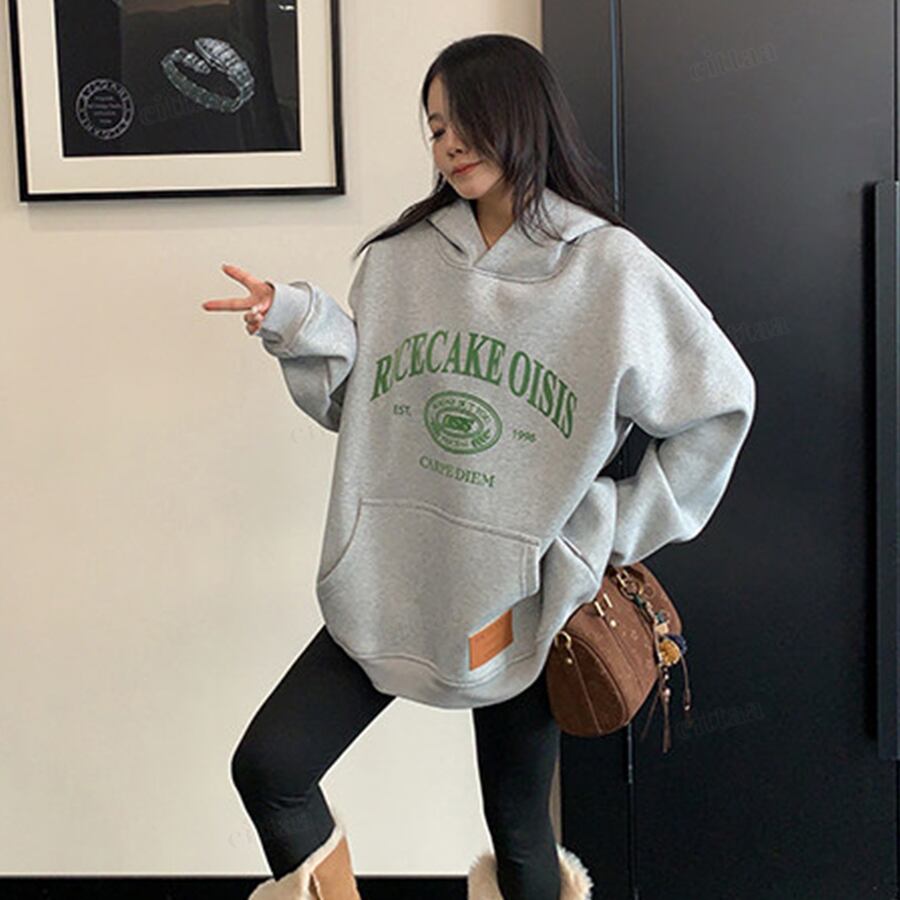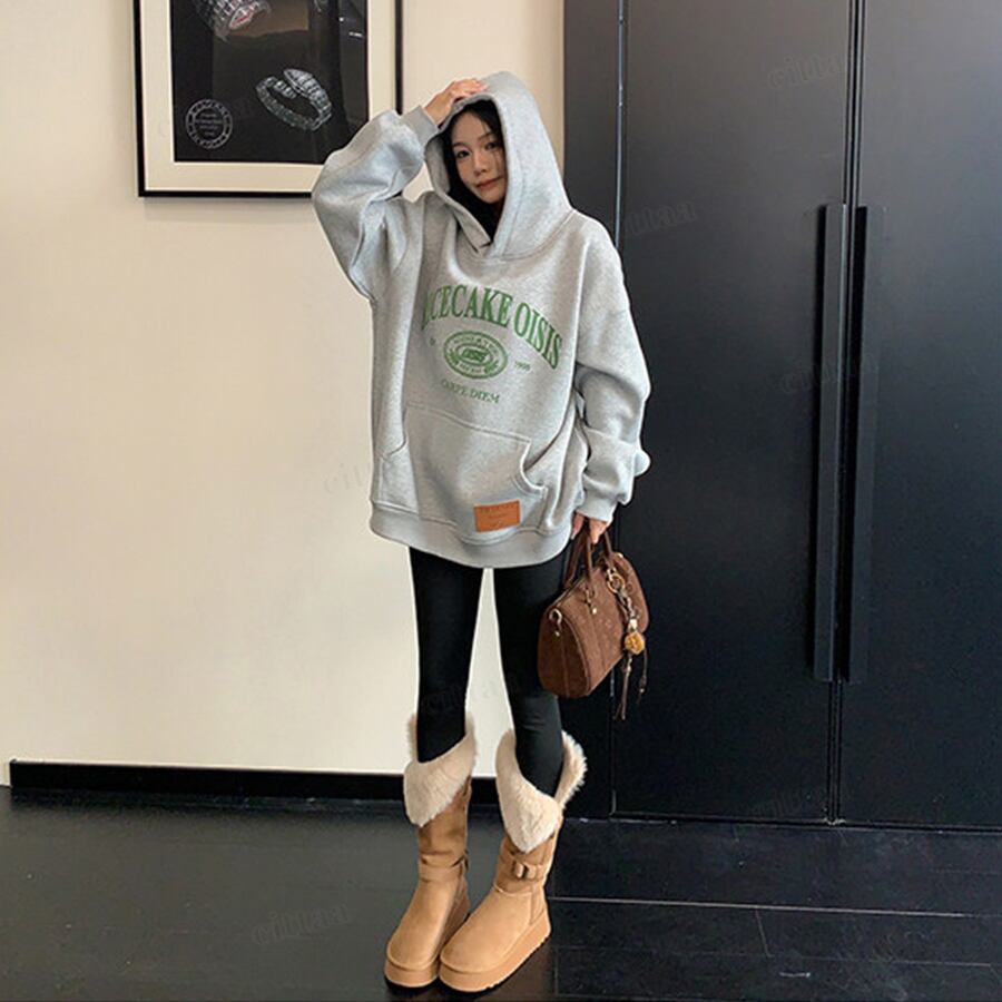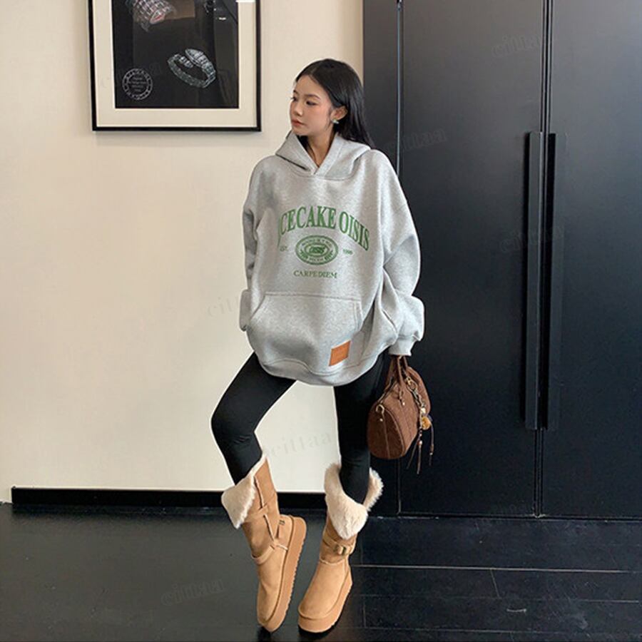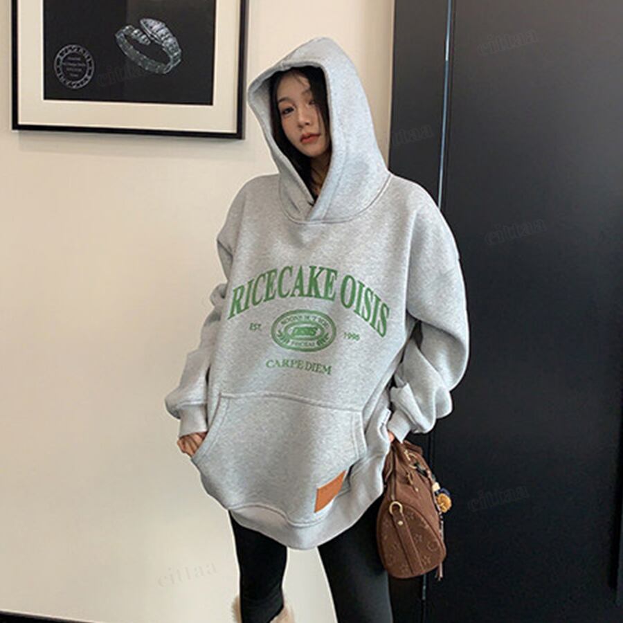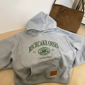 ★予約★D-834 2026新作♡RICECAKEフェイクレザーラベル付きカレッジロゴフーディー グレー