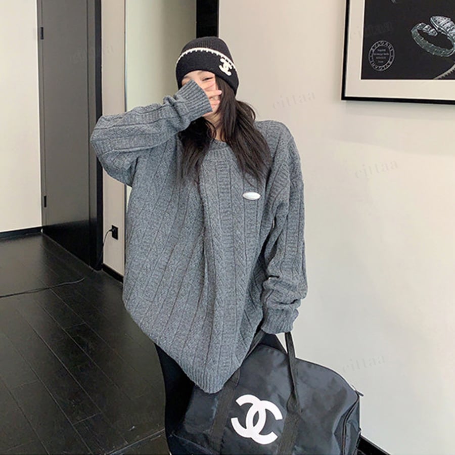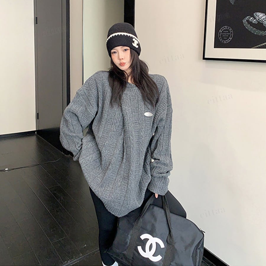 ★予約★D-863 2026新作♡メタルタグ折り目デザインケーブル編みニット グレー