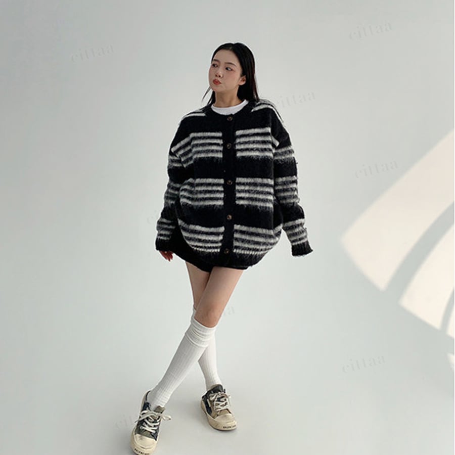 ★予約★D-864 2026新作♡ボーダー柄クルーネックモヘアニットカーディガン ブラック