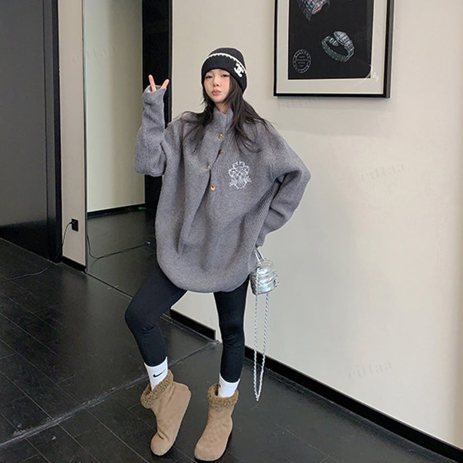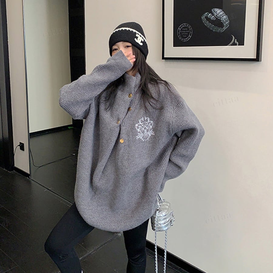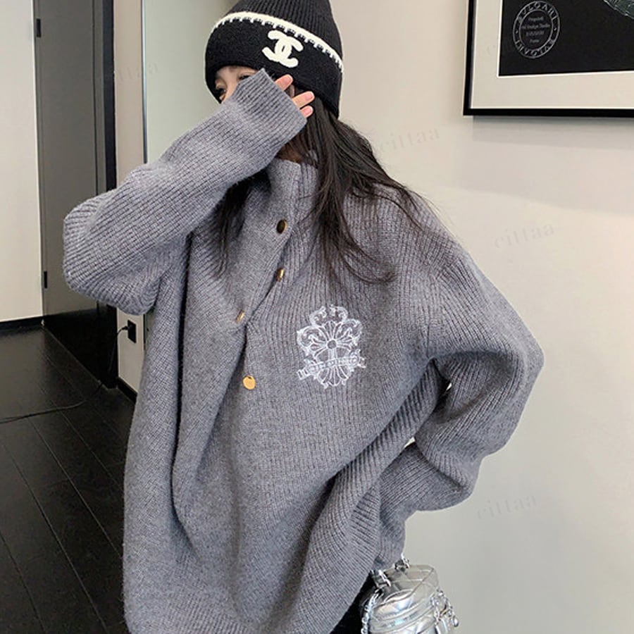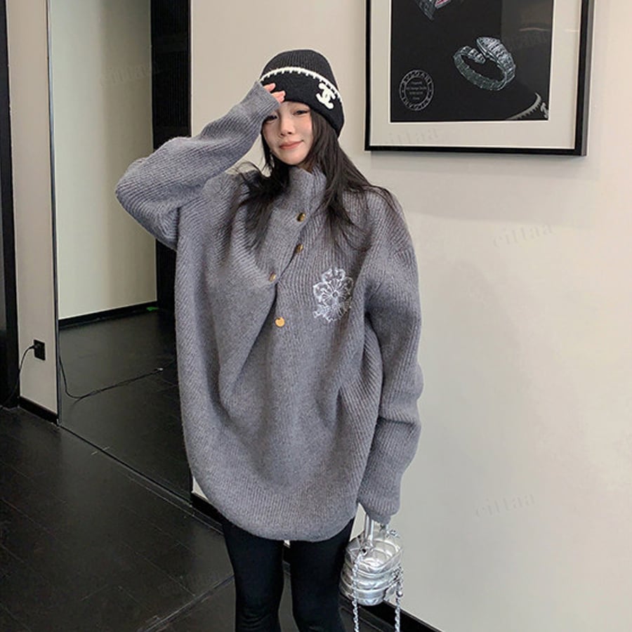 個性的なボタンデザインで差がつく刺繍ハイネックニット