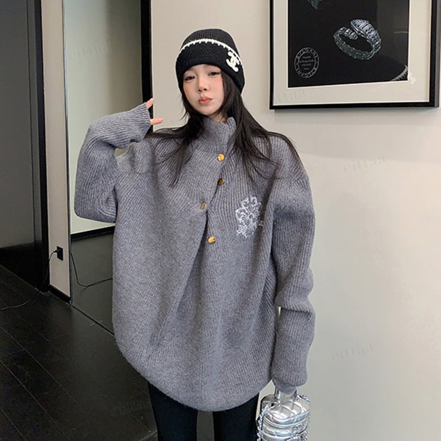 ★予約★D-865 2026新作♡アシンメトリーボタンデザインニット グレー