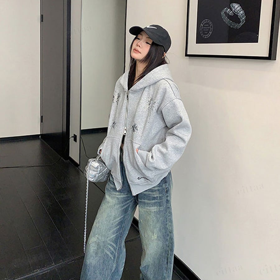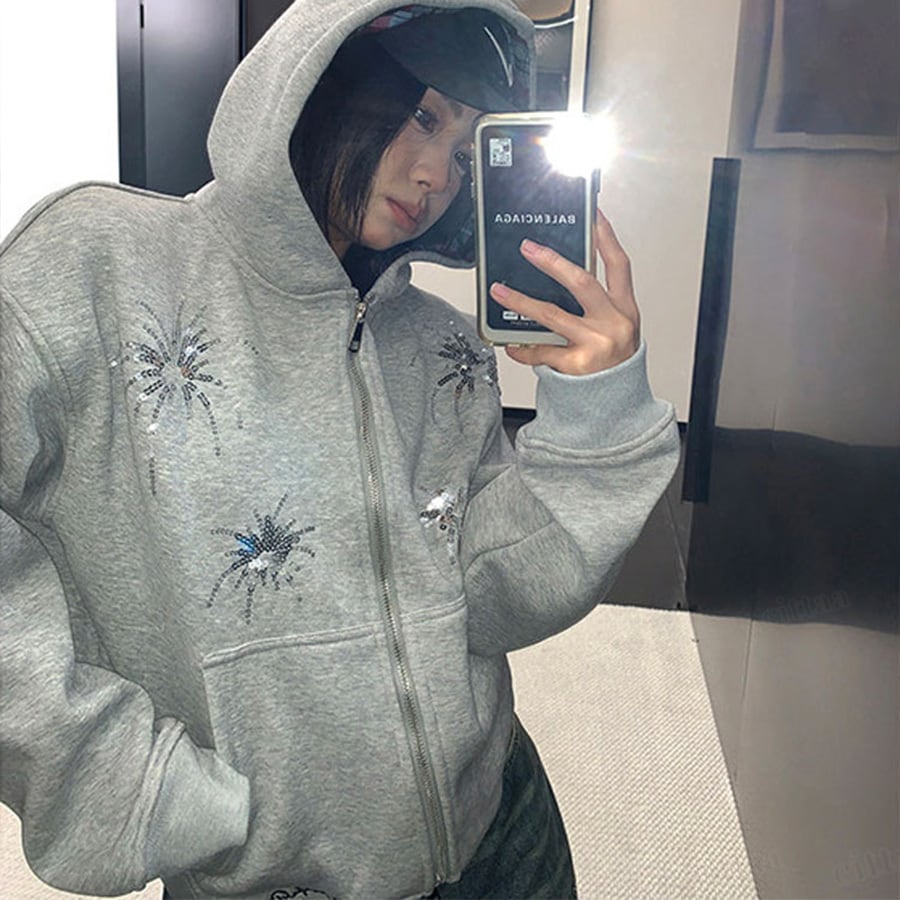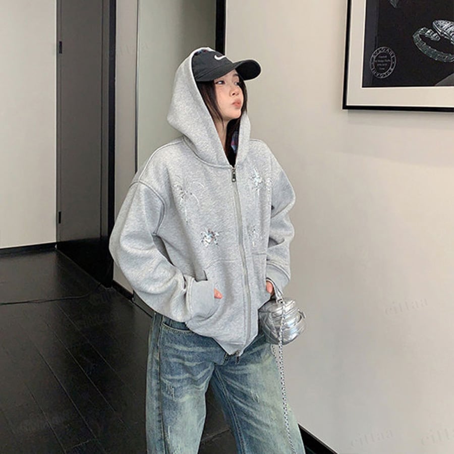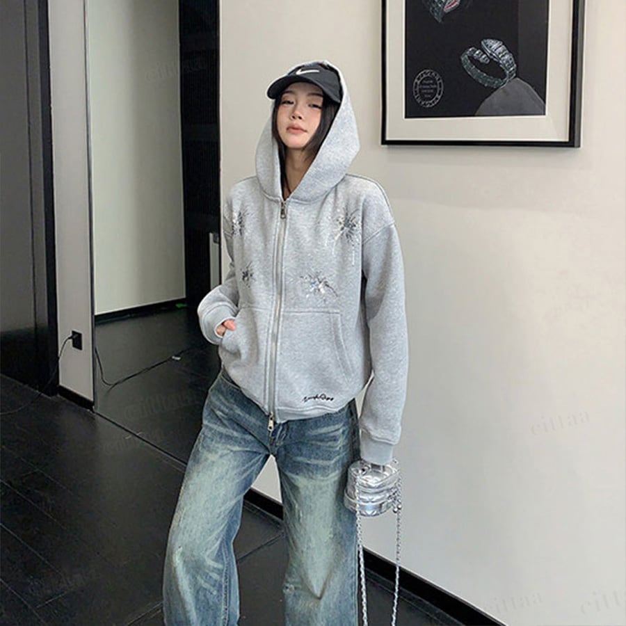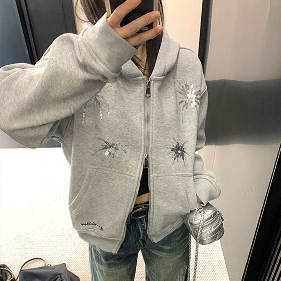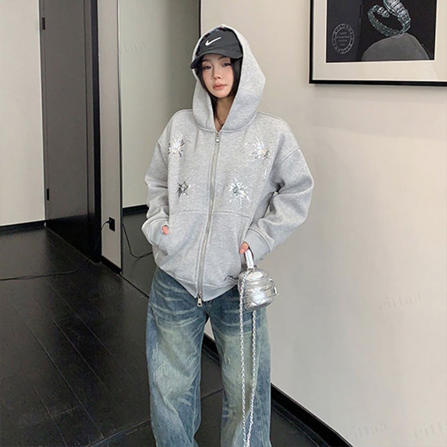 ★予約★D-909 2026新作♡Ricecakeスパンコールデザインダブルジップパーカー グレー