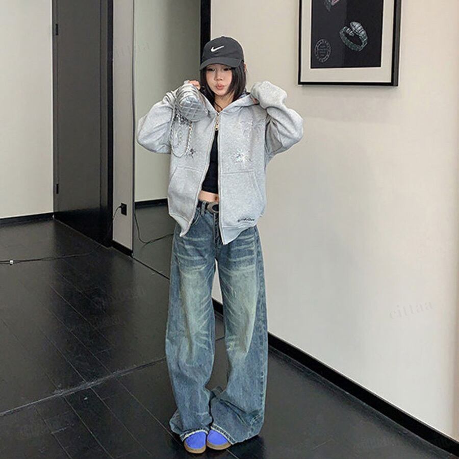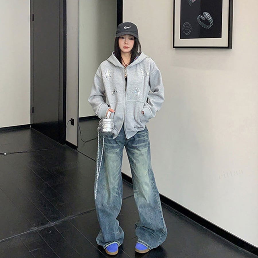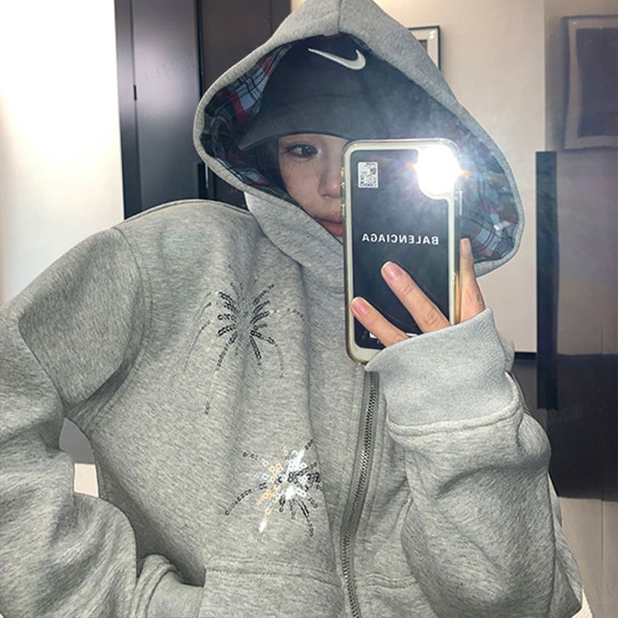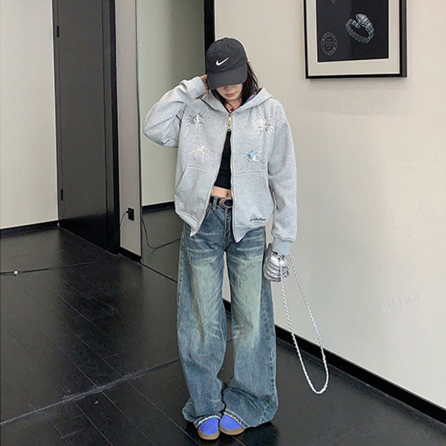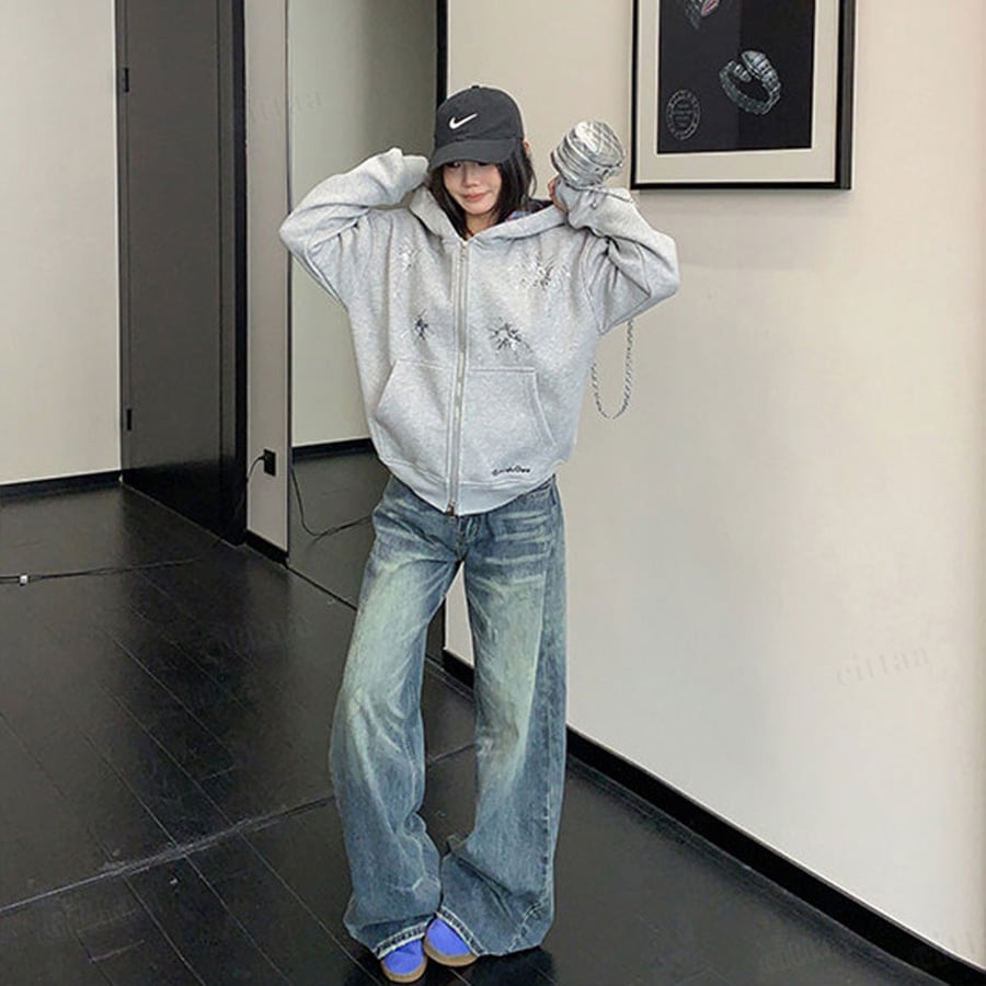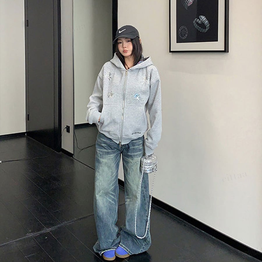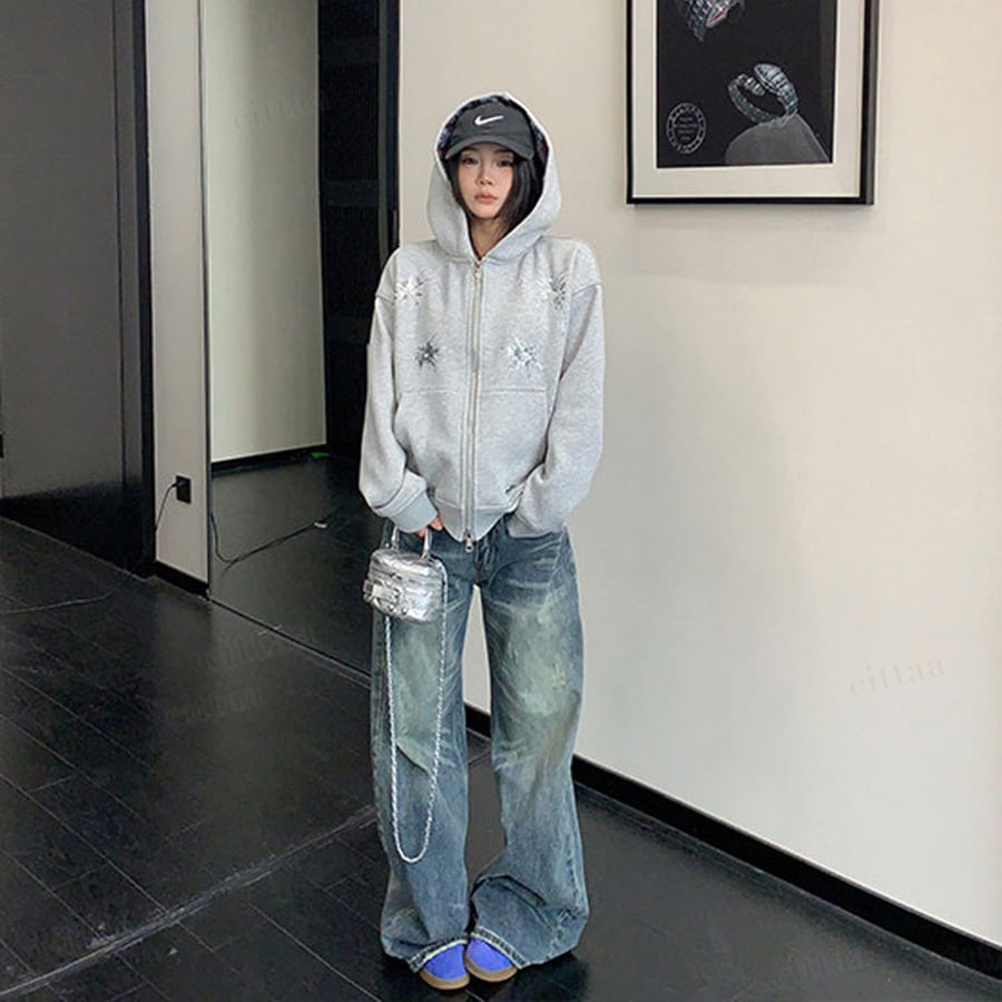 ★予約★D-909 2026新作♡Ricecakeスパンコールデザインダブルジップパーカー グレー