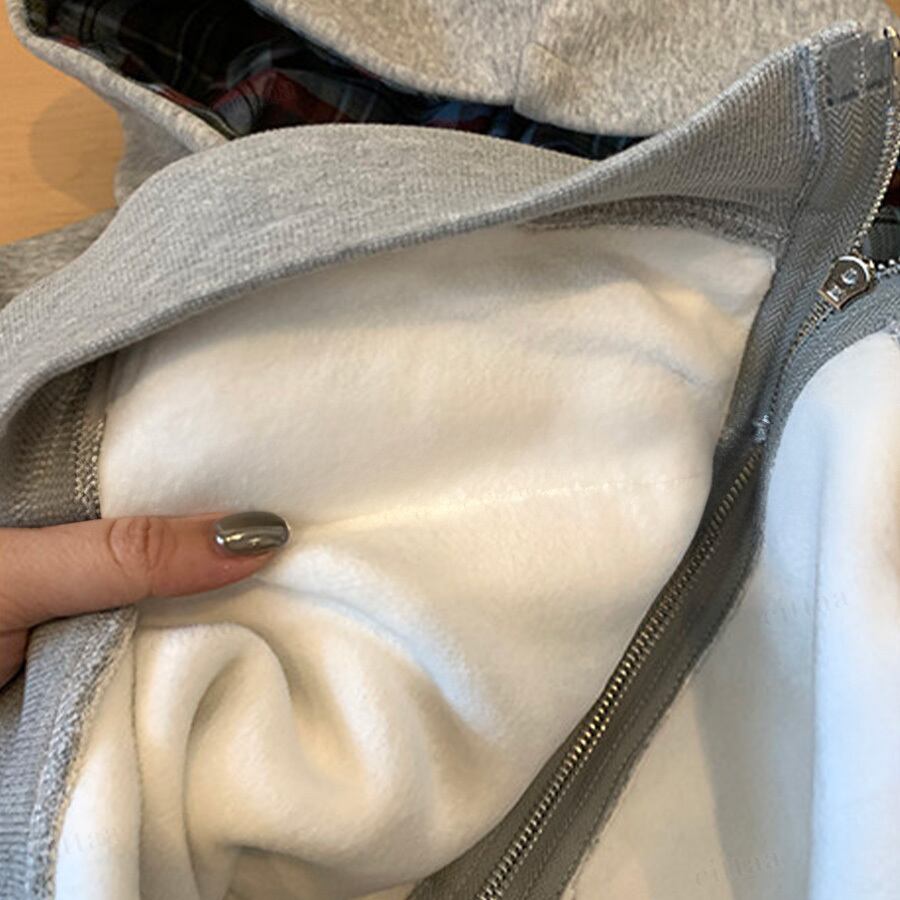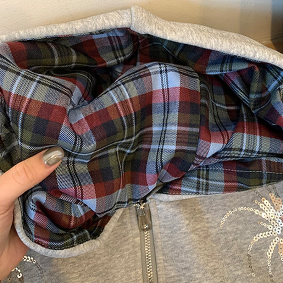 動くたびにキラッと光るスパンコールが、シンプルコーデのアクセントに。さらっと羽織るだけで、カジュアルすぎず女性らしい華やかさをプラスします。フード内側のチェック柄も、見えたときに気分が上がるさりげないポイント。