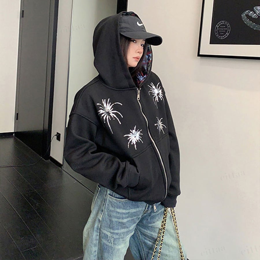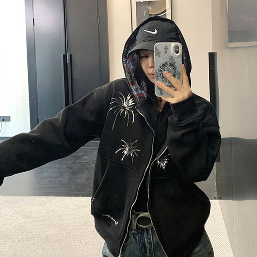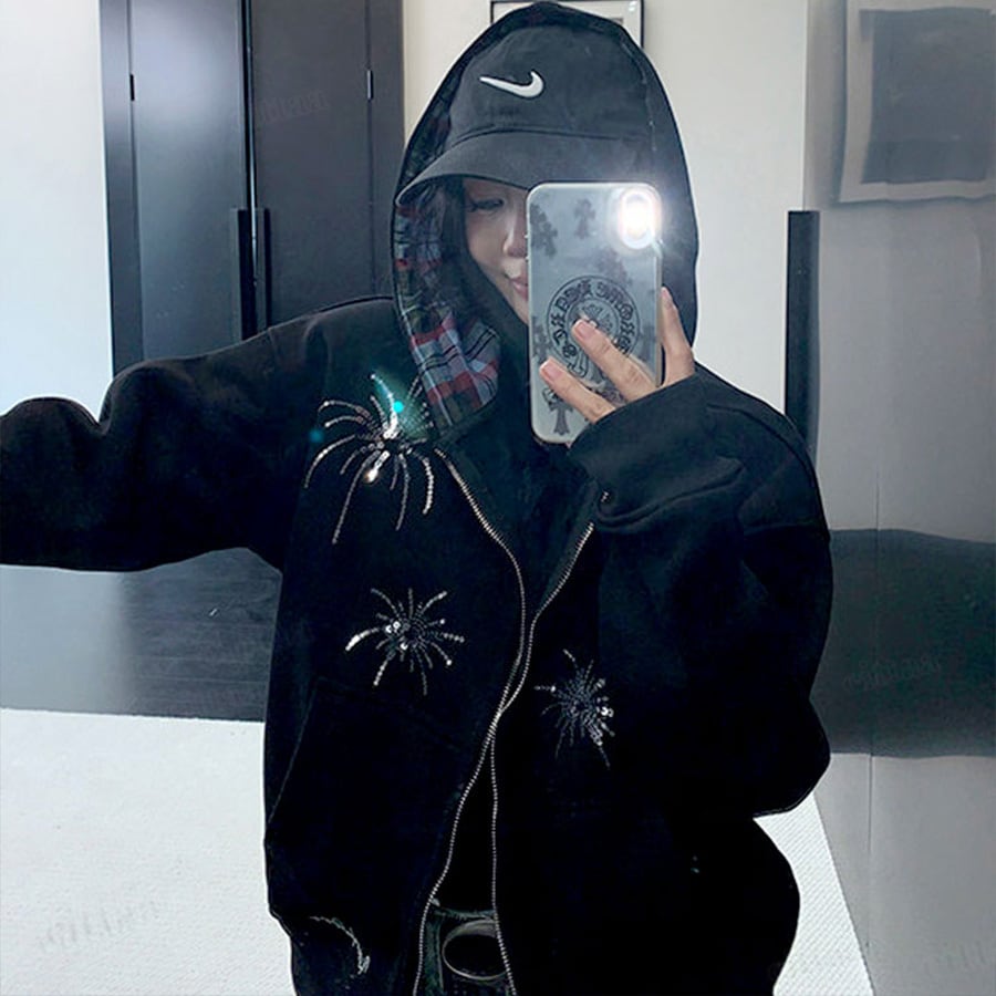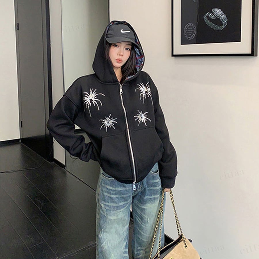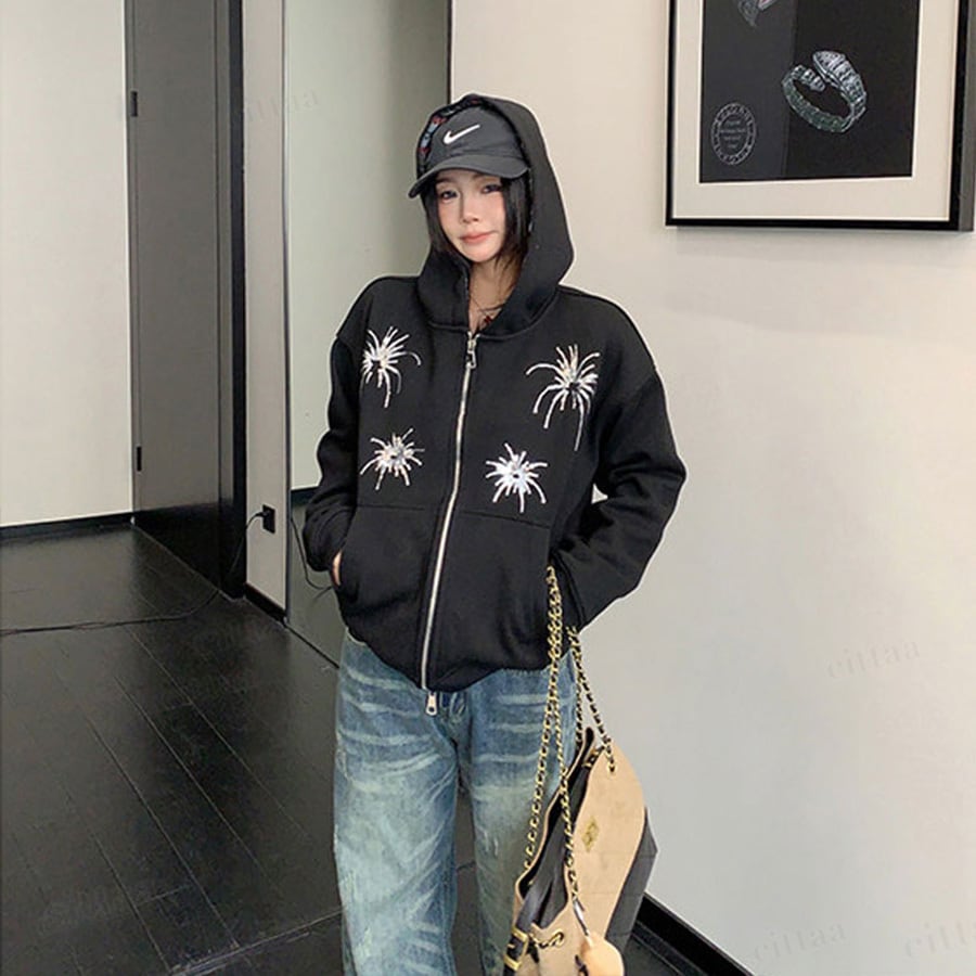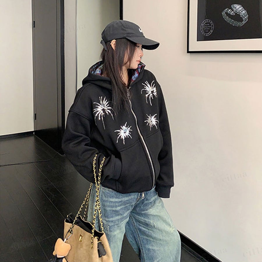 ★予約★D-909 2026新作♡Ricecakeスパンコールデザインダブルジップパーカー ブラック