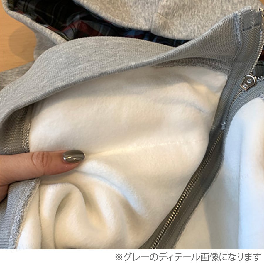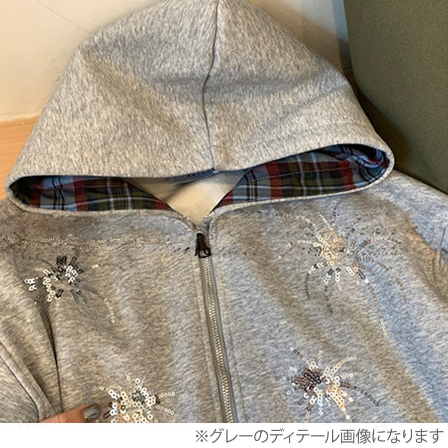 動くたびにキラッと光るスパンコールが、シンプルコーデのアクセントに。さらっと羽織るだけで、カジュアルすぎず女性らしい華やかさをプラスします。フード内側のチェック柄も、見えたときに気分が上がるさりげないポイント。
