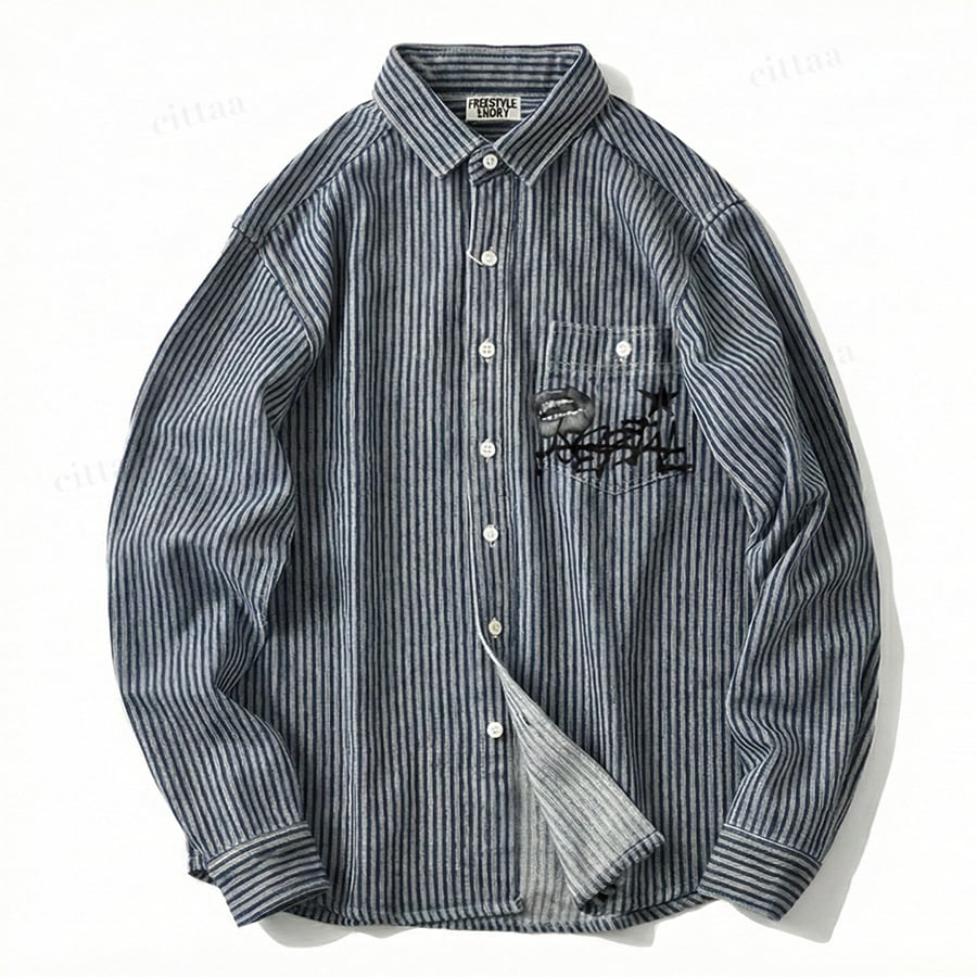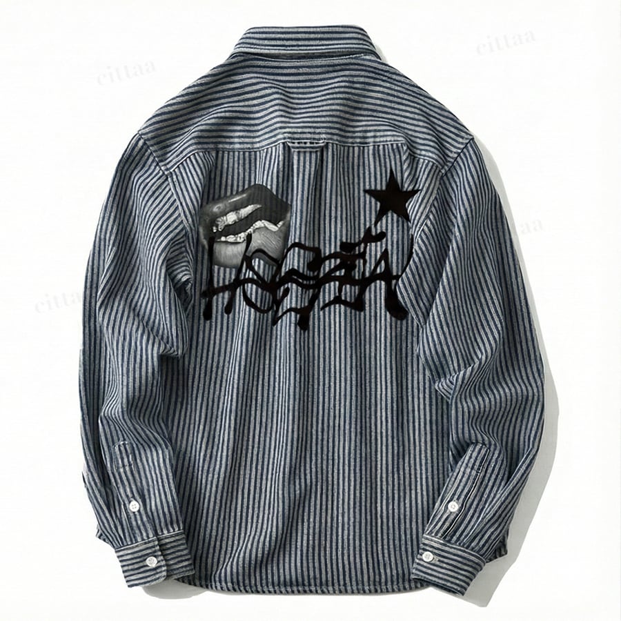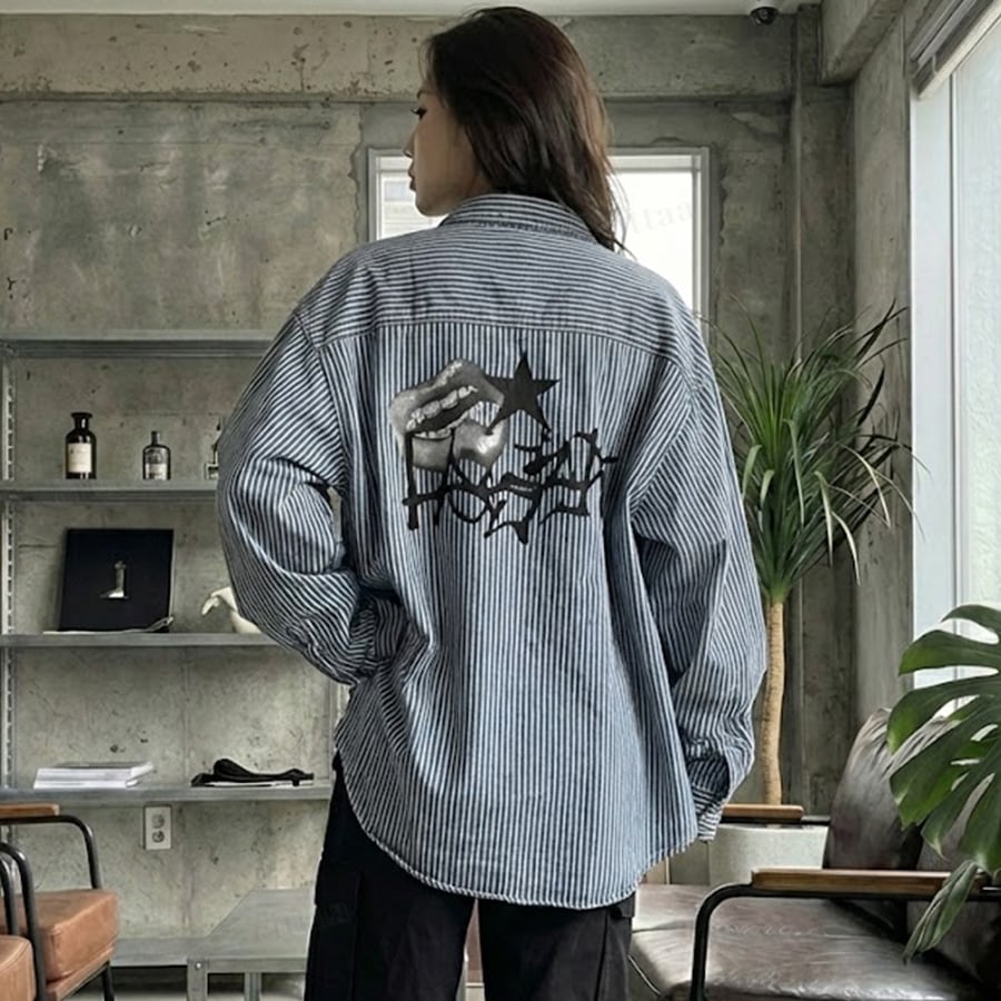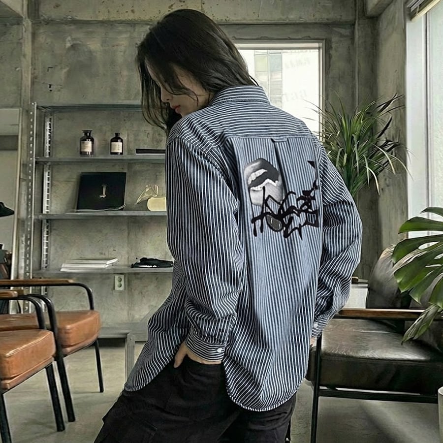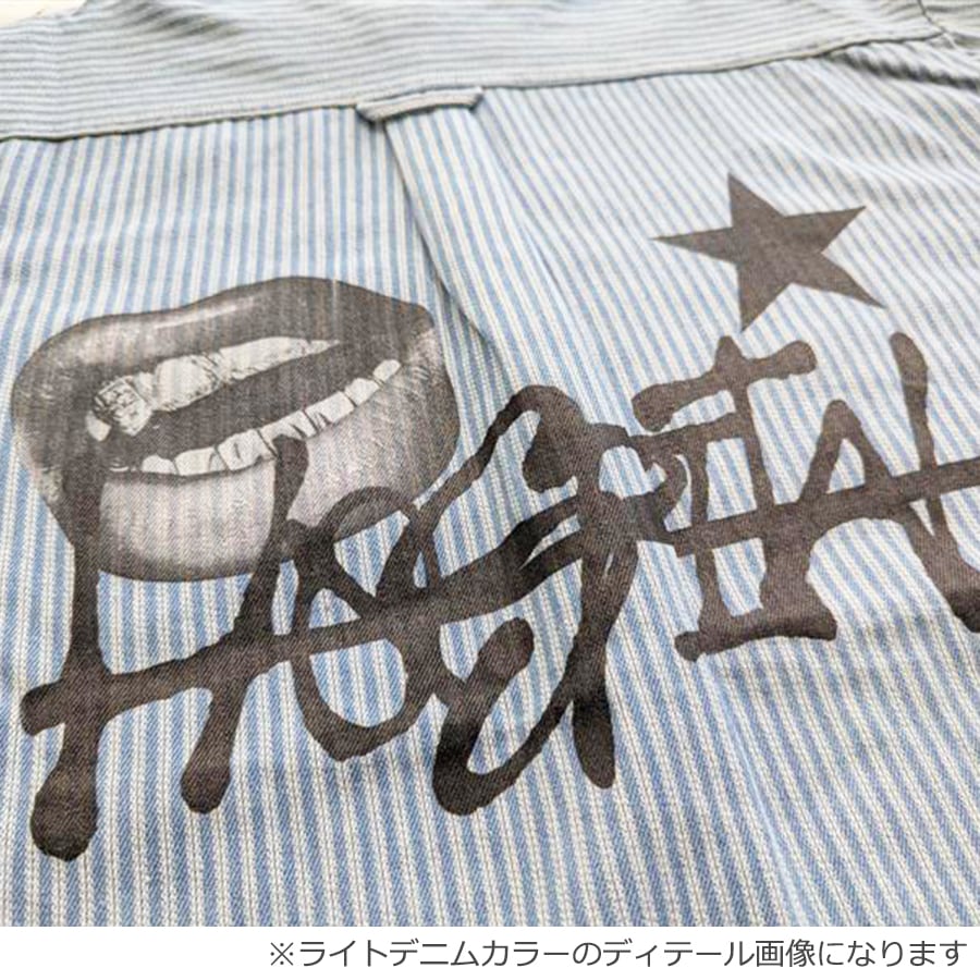 フロントとバックに施した辛口ロゴプリントが、シンプルなコーデのアクセントに。ストライプデニムで、さらっと羽織るだけでもお洒落に決まる着映えアイテムです。