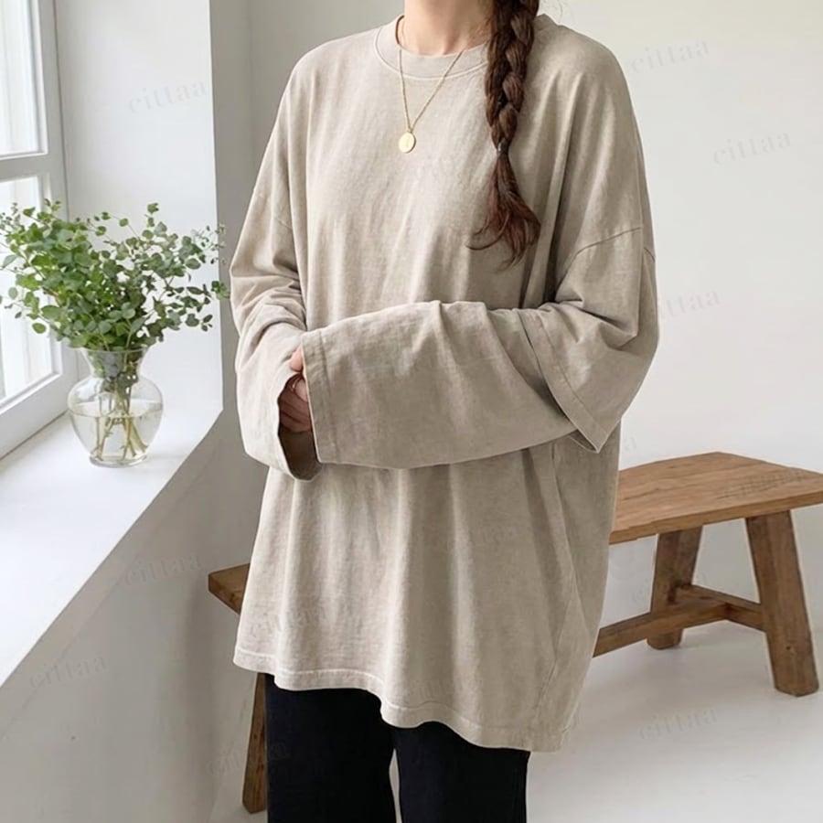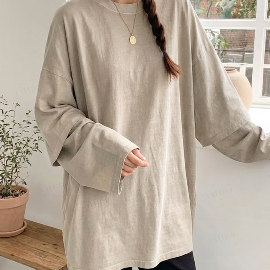 ズルっと着られるオーバーサイズが、ラフなのに今っぽいバランスに。ヒップが隠れる着丈で、自然に体型カバーも叶えます。リラックス感がありながら、だらしなく見えないのがポイント。