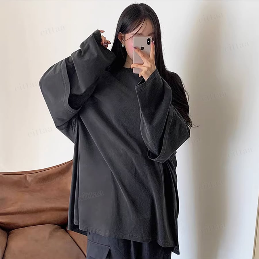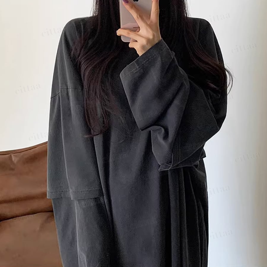 ズルっと着られるオーバーサイズが、ラフなのに今っぽいバランスに。ヒップが隠れる着丈で、自然に体型カバーも叶えます。リラックス感がありながら、だらしなく見えないのがポイント。
