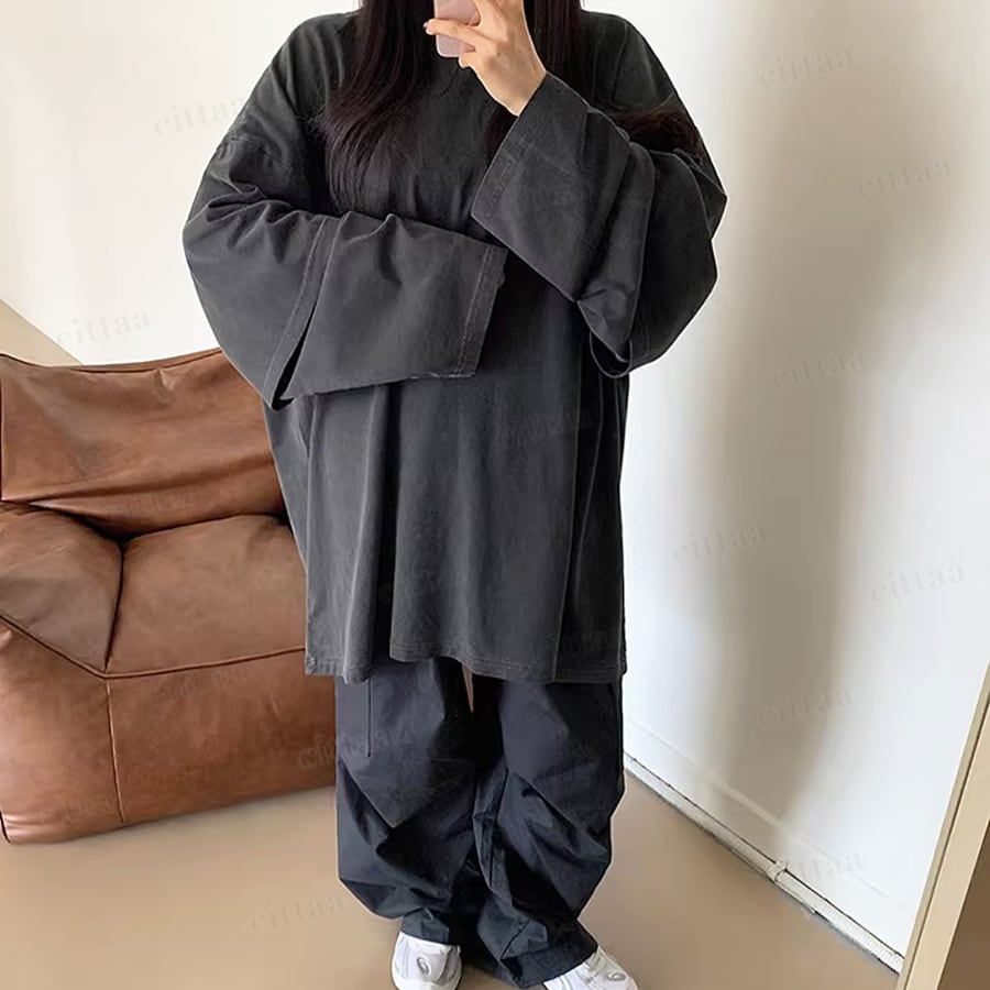 落ち着いたくすみカラー展開で、合わせるアイテムを選ばず着回し力も抜群。ビッグシルエットなので、タイトスカートやスキニーパンツなどすっきりしたボトムと合わせると、バランスよくまとまります。
