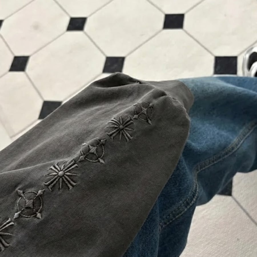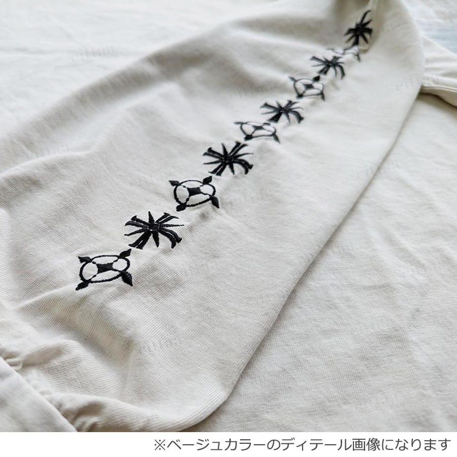 袖の刺繍デザインがポイントのピグメント加工Tシャツ