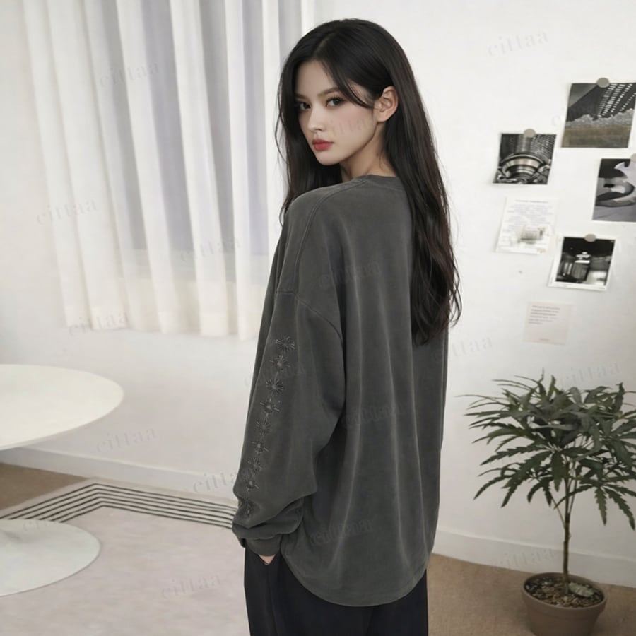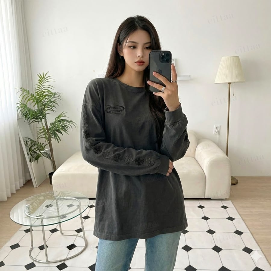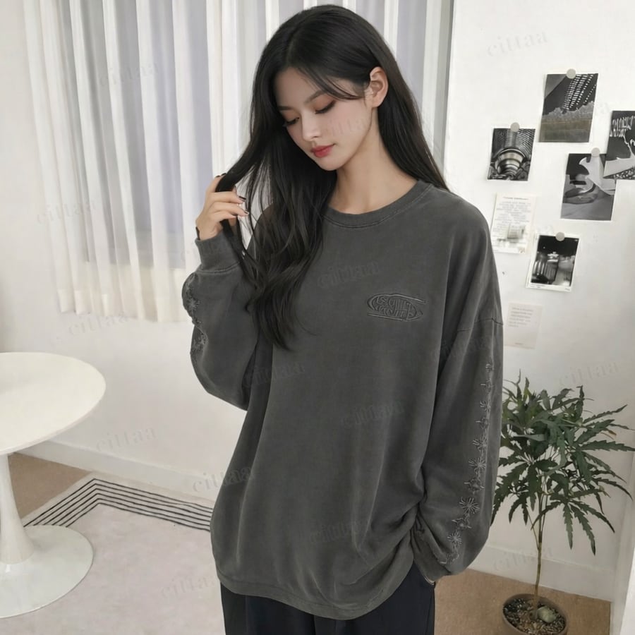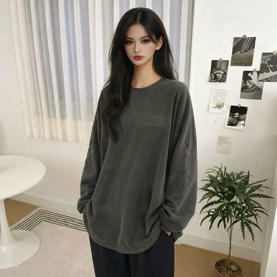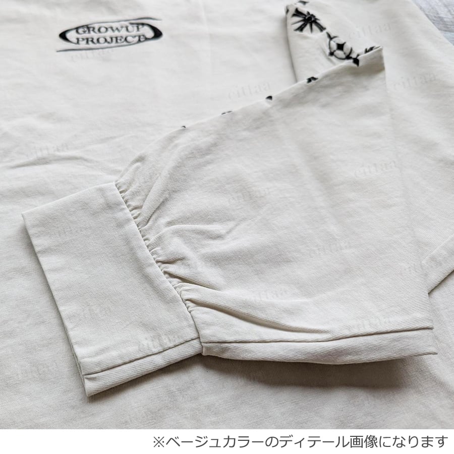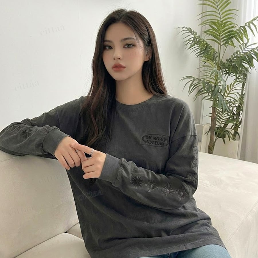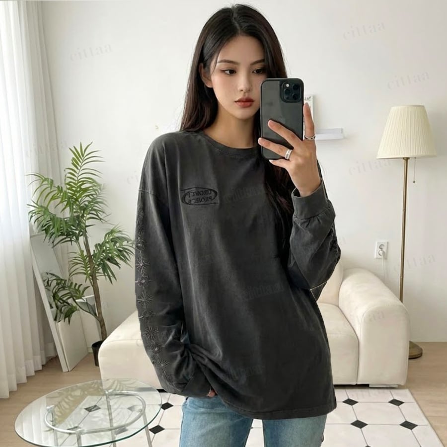 【即納】Y-4787 2026春新作♡GROW袖刺繍ピグメント加工長袖Tシャツ チャコール 0123