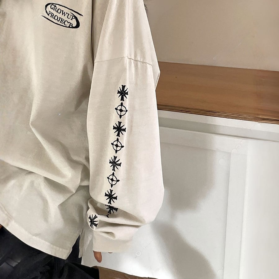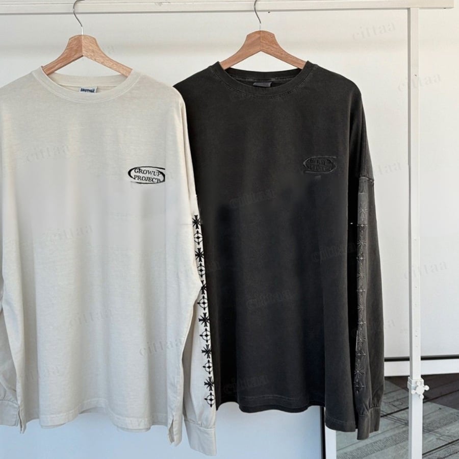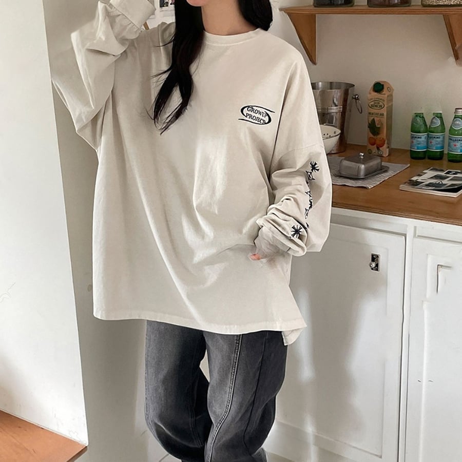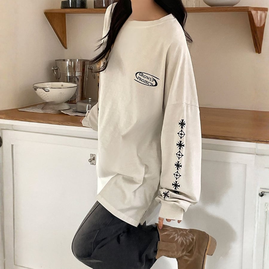【即納】Y-4787 2026春新作♡GROW袖刺繍ピグメント加工長袖Tシャツ ベージュ 0123