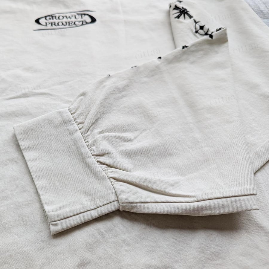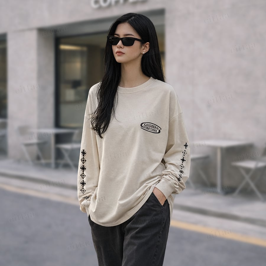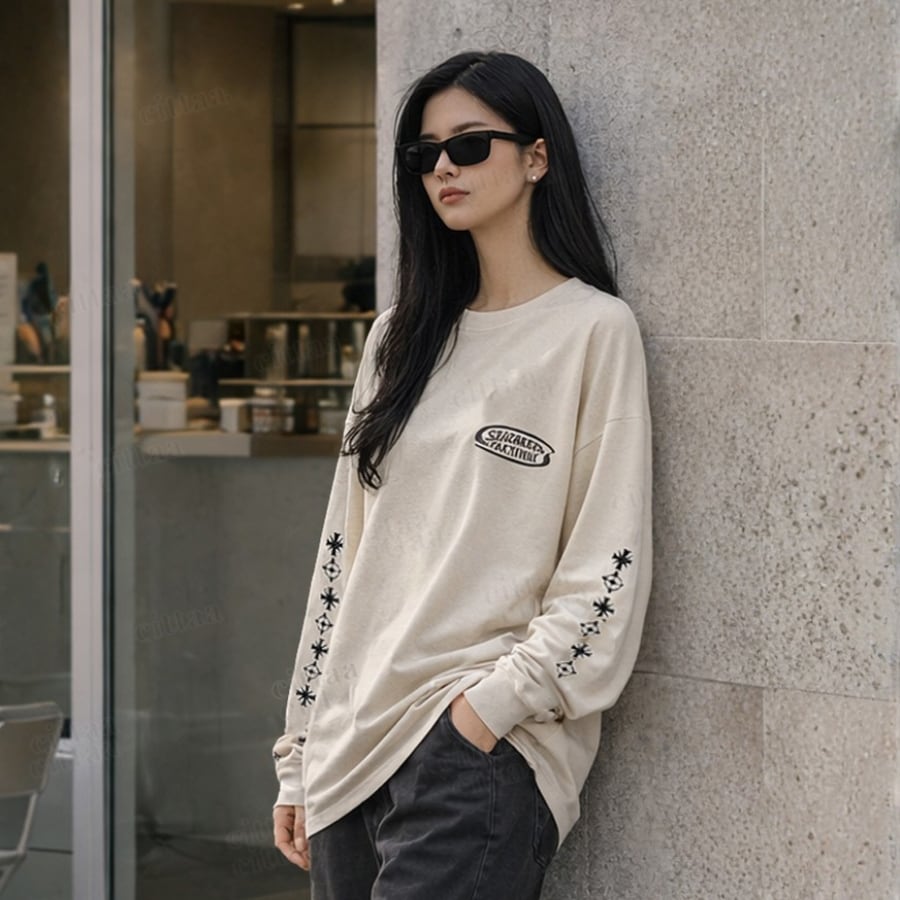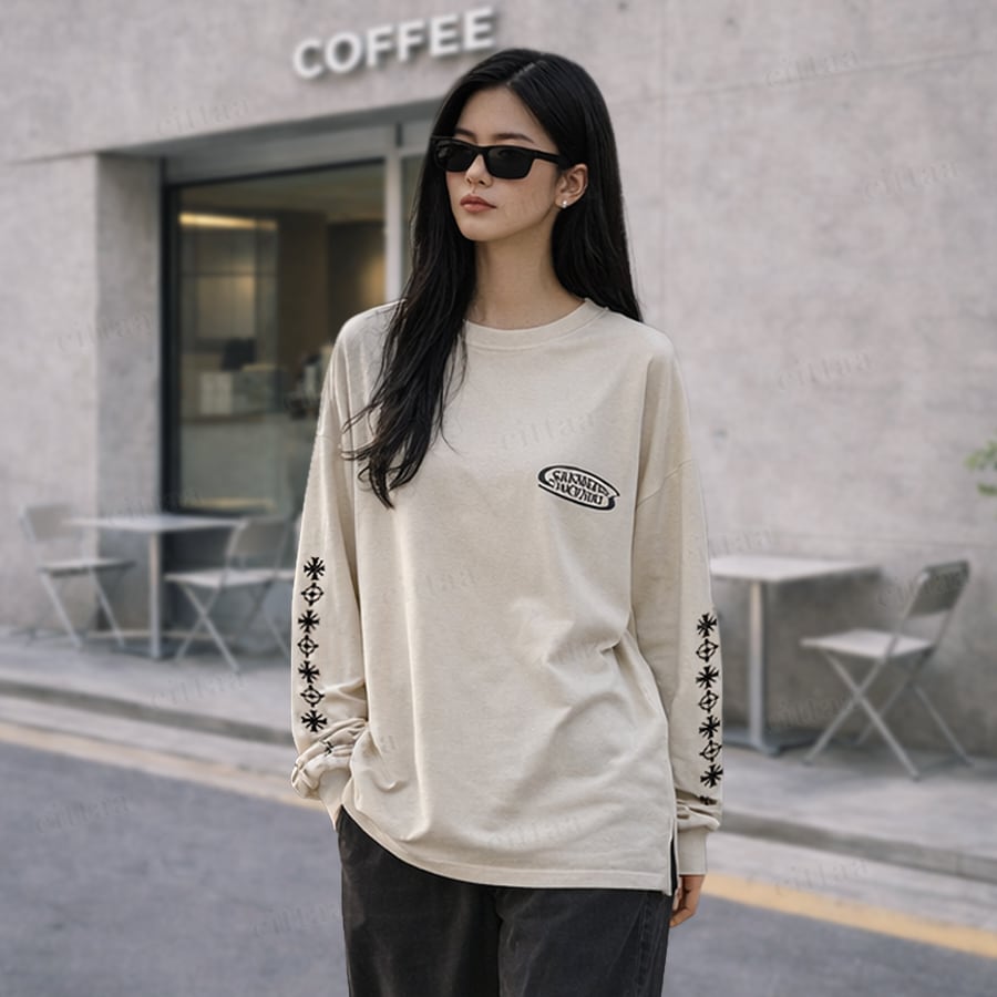 【即納】Y-4787 2026春新作♡GROW袖刺繍ピグメント加工長袖Tシャツ ベージュ 0123