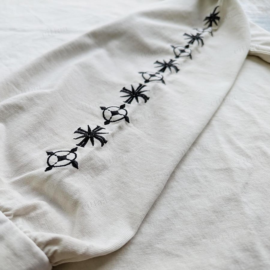 袖の刺繍デザインがポイントのピグメント加工Tシャツ