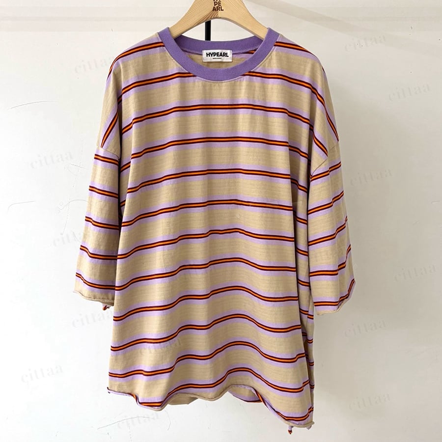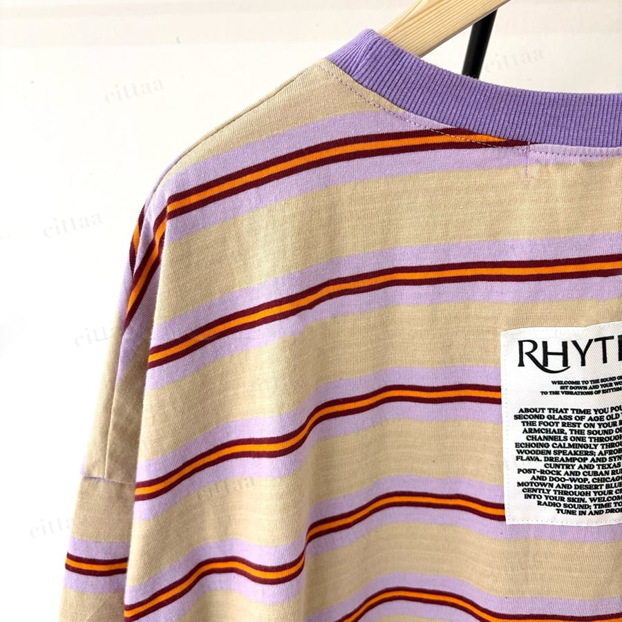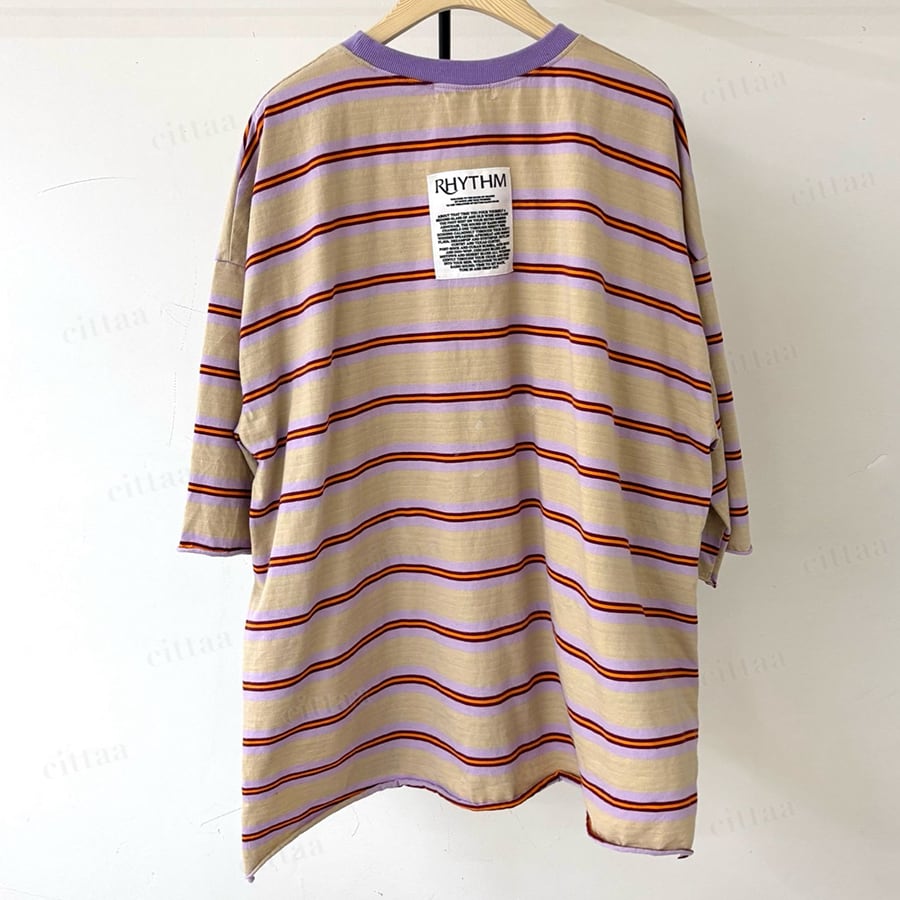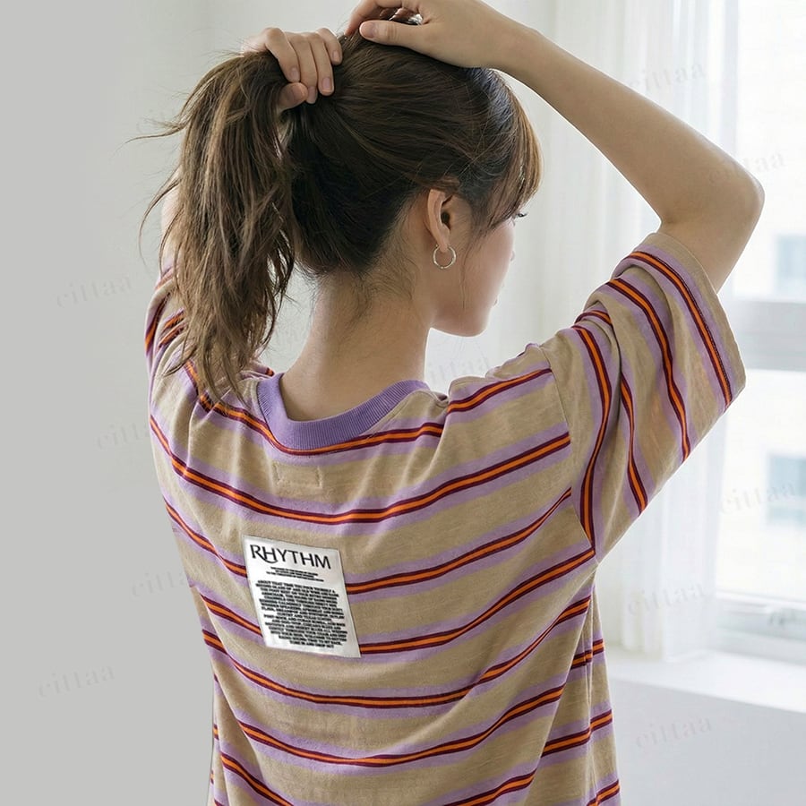 Y-4805 2026春新作♡RHYTHMバックラベルレトロボーダー柄半袖Tシャツ パープル 0206