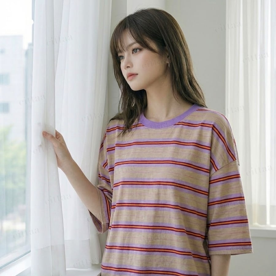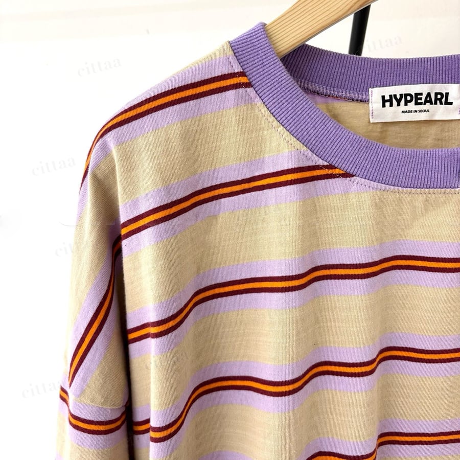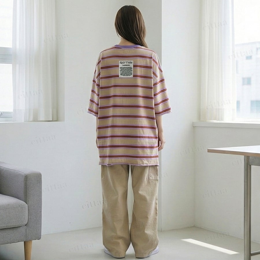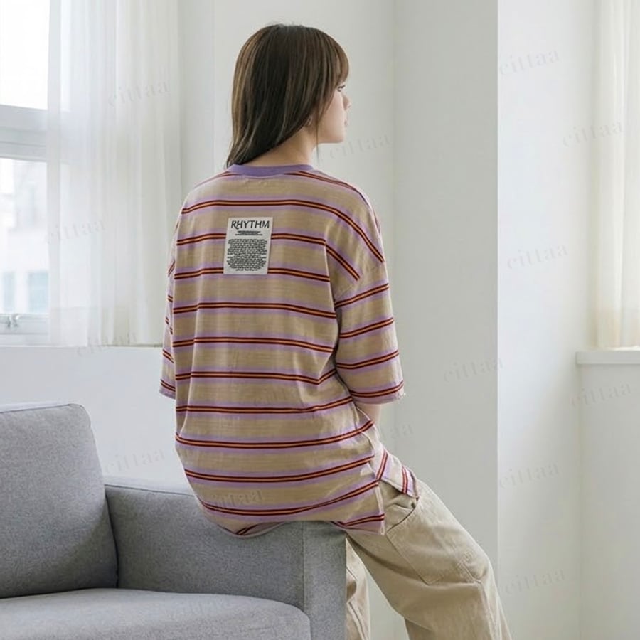 Y-4805 2026春新作♡RHYTHMバックラベルレトロボーダー柄半袖Tシャツ パープル 0206