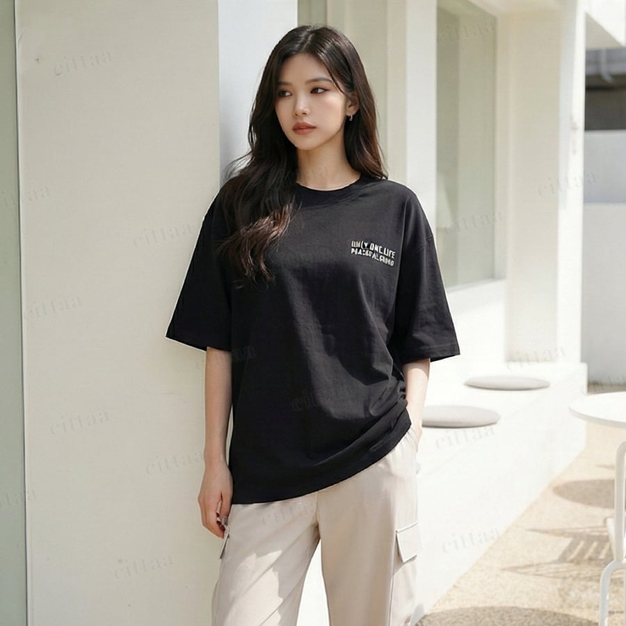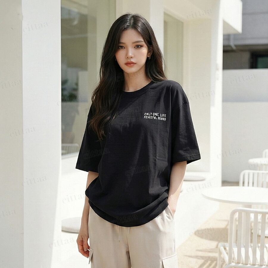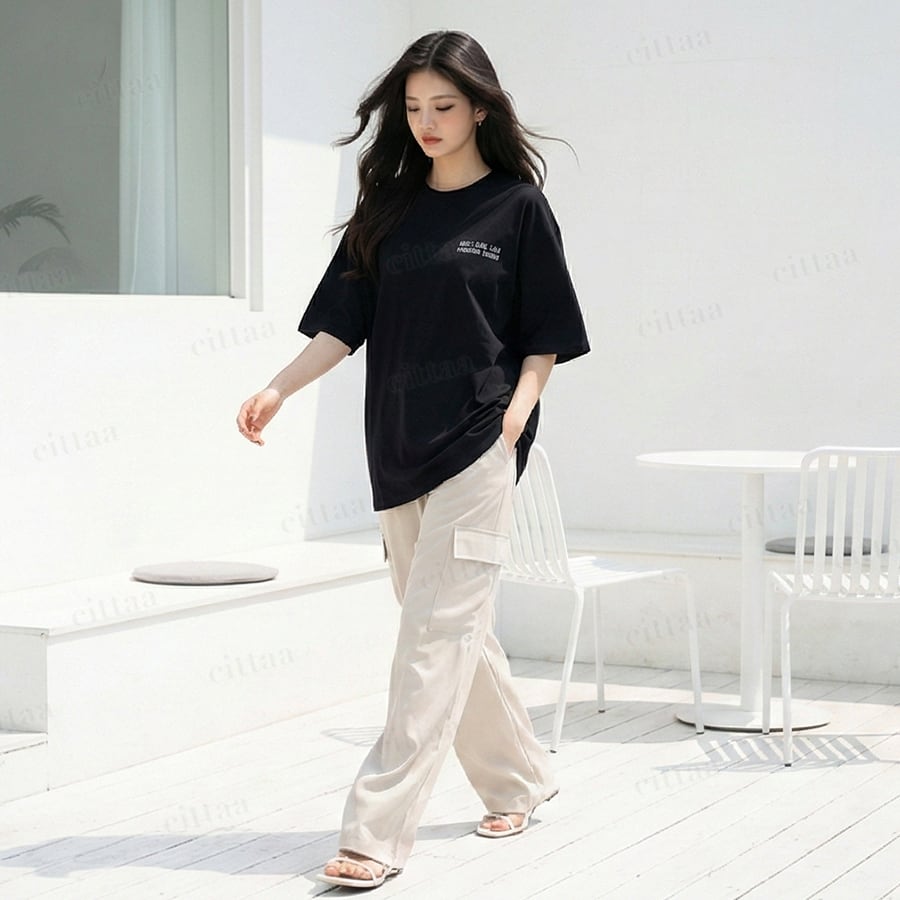 ゆるっとしたシルエットで、ラフなのに今っぽいバランスに。二の腕が隠れる袖丈で体型カバーも叶い、メンズライクな着こなしを楽しめます。