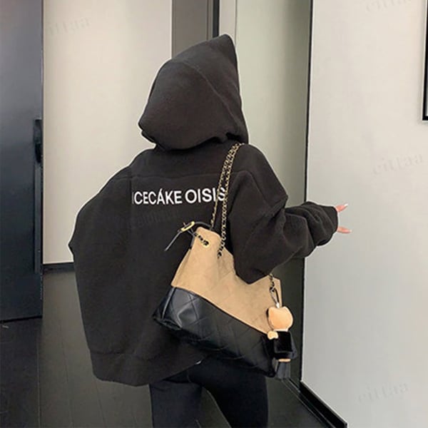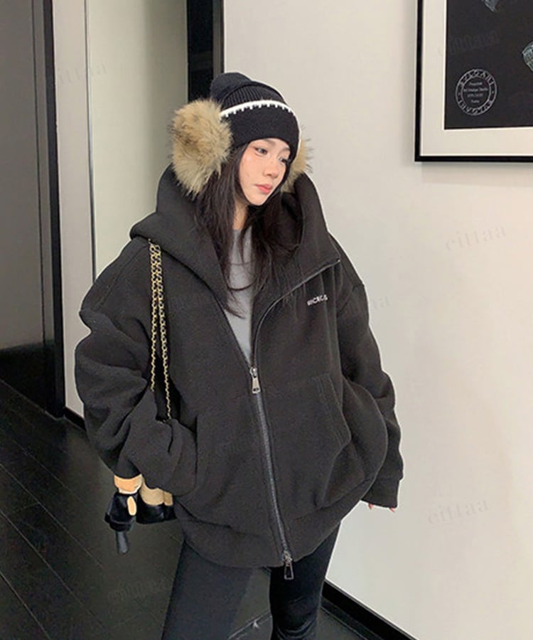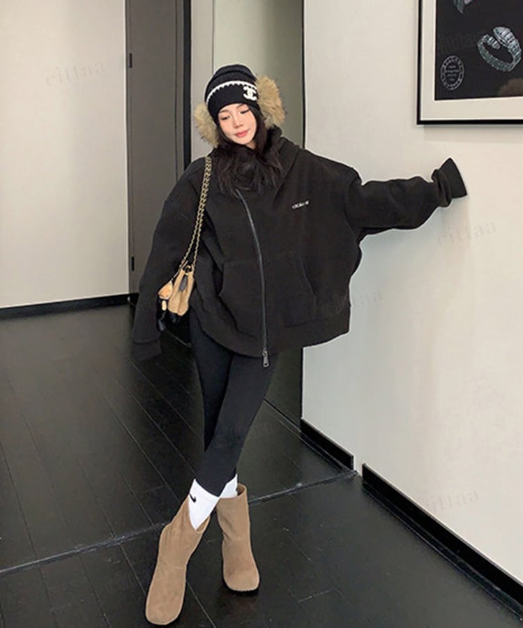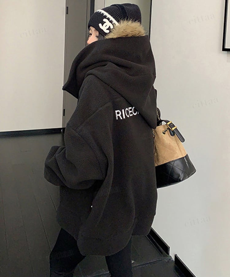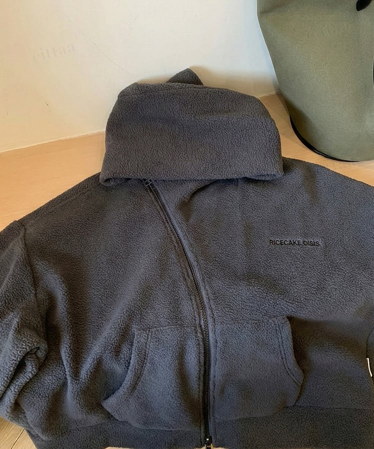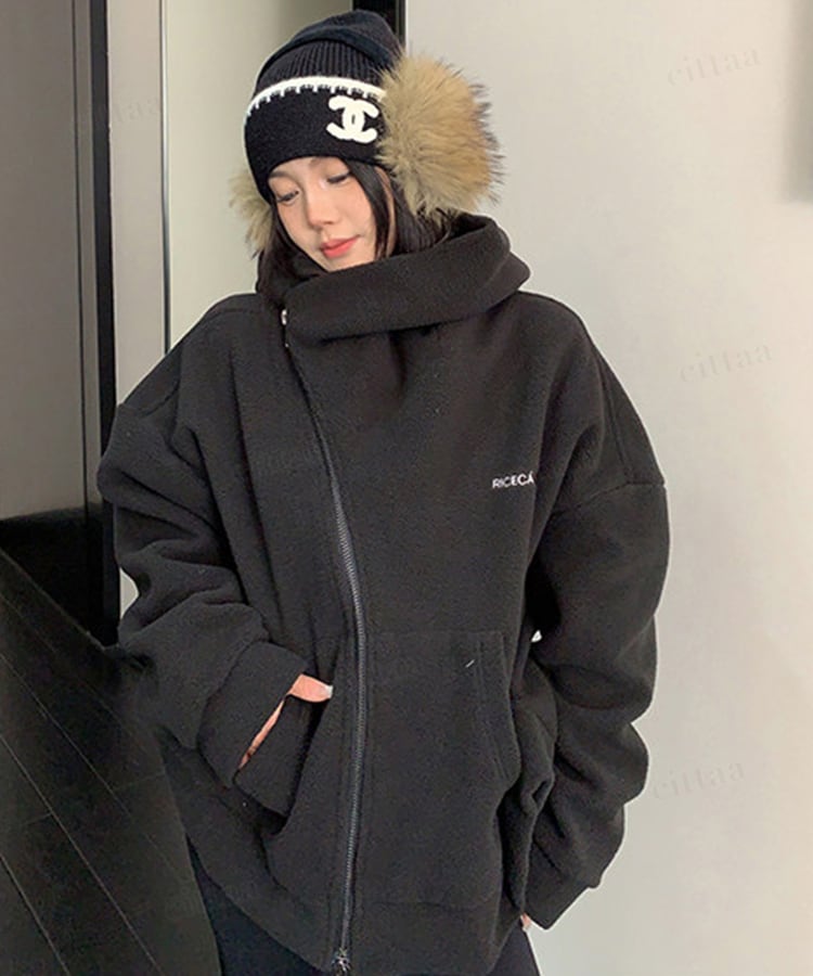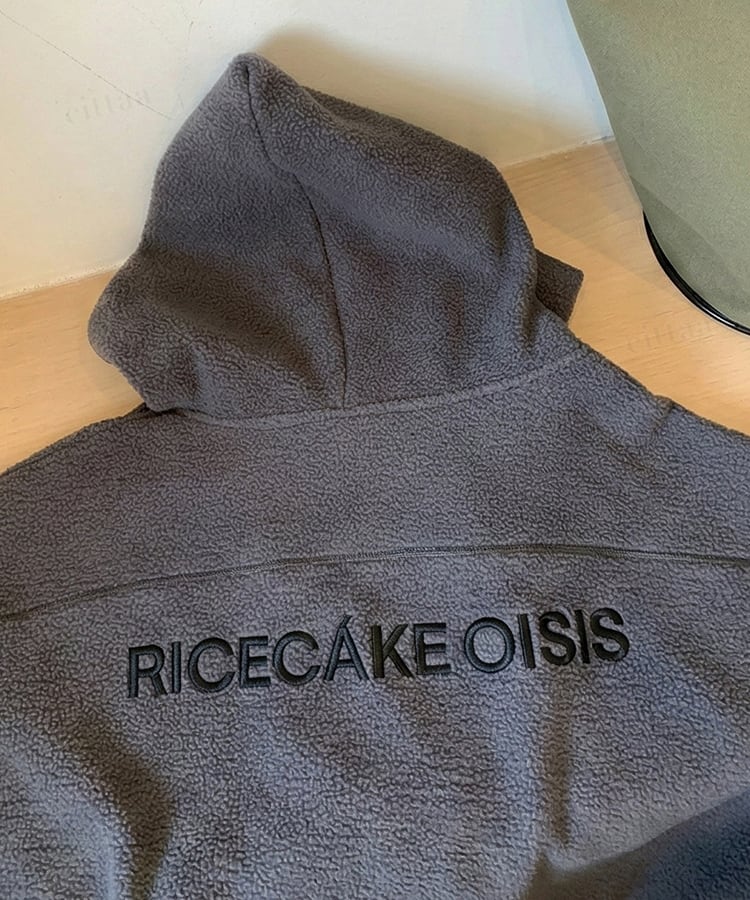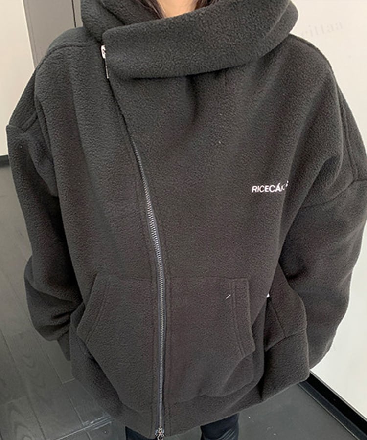 ★予約★D-926 2026新作♡RICECAKE刺繍ロゴ斜めダブルジップフリースパーカー ブラック