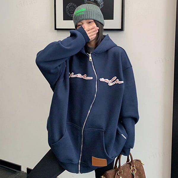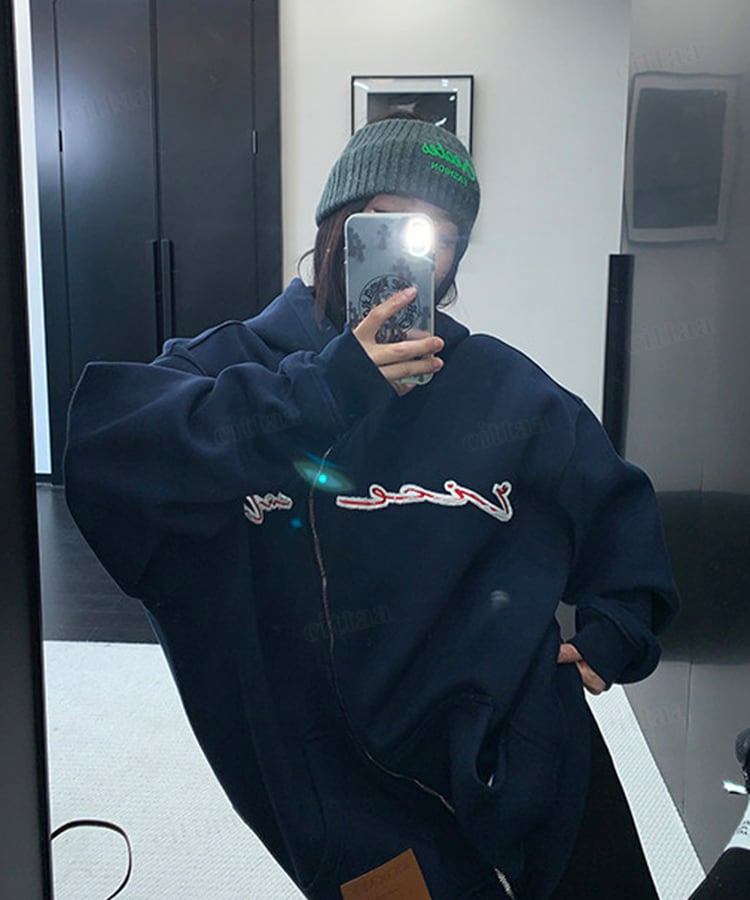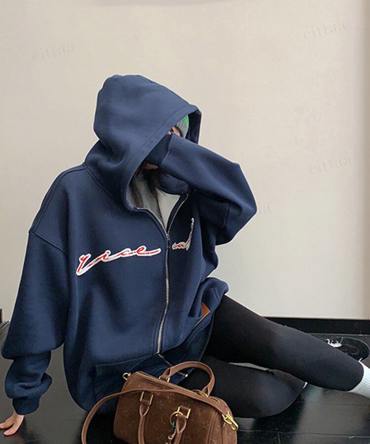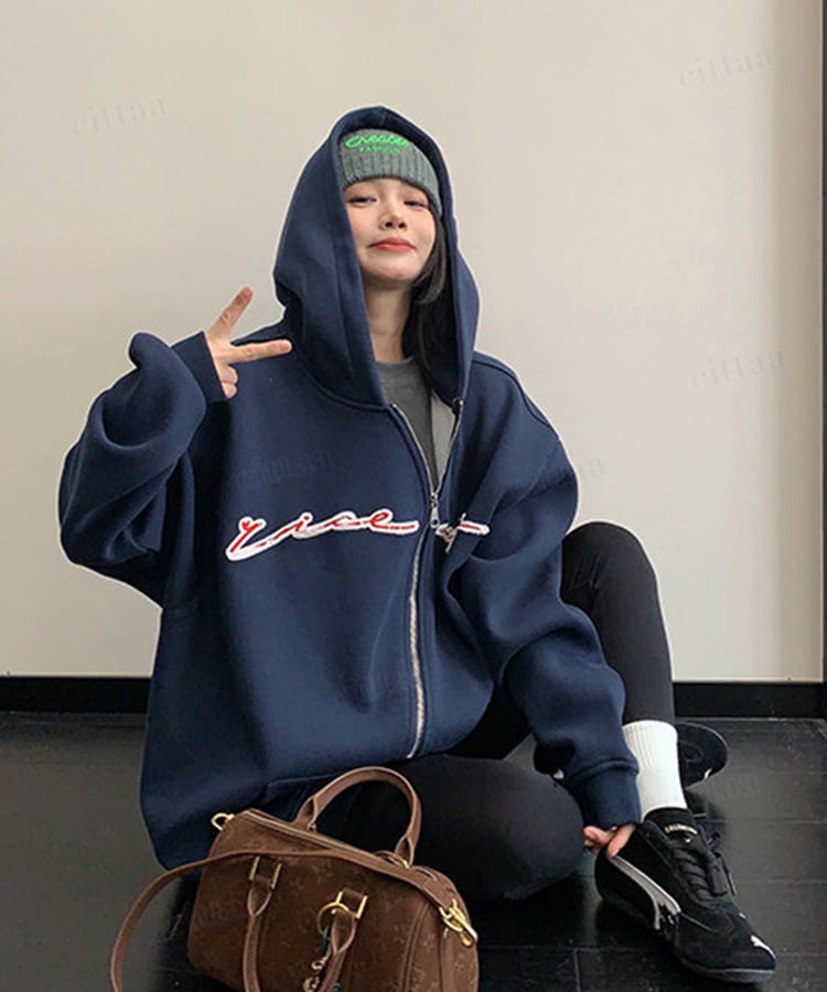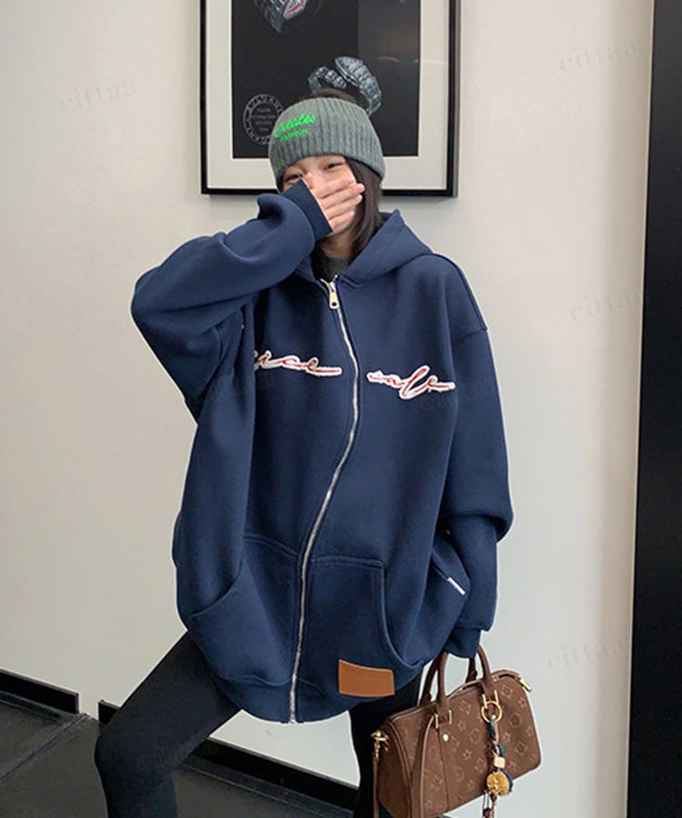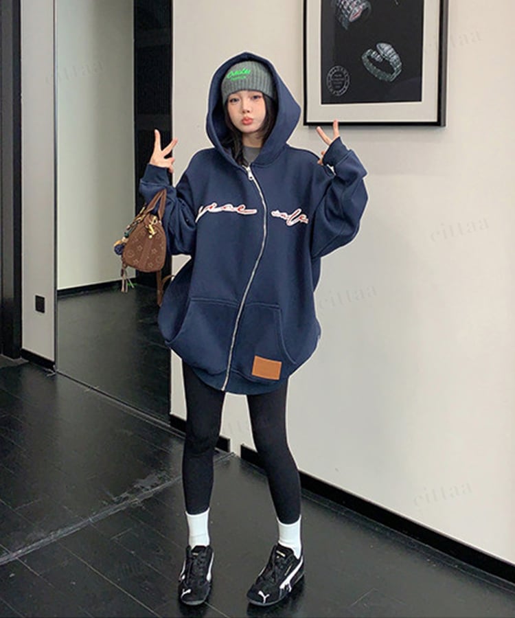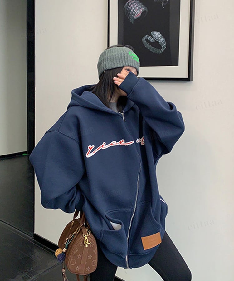 くねっと斜めにあしらわれたジップデザインが目を惹く一枚。フロントのアップリケ刺繍ロゴがアクセントになり、裾のフェイクレザーラベルでさりげなく高見え。さらっと羽織るだけでコーデが決まる主役級アイテムです。
