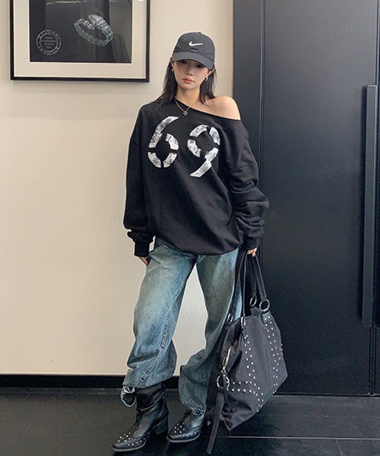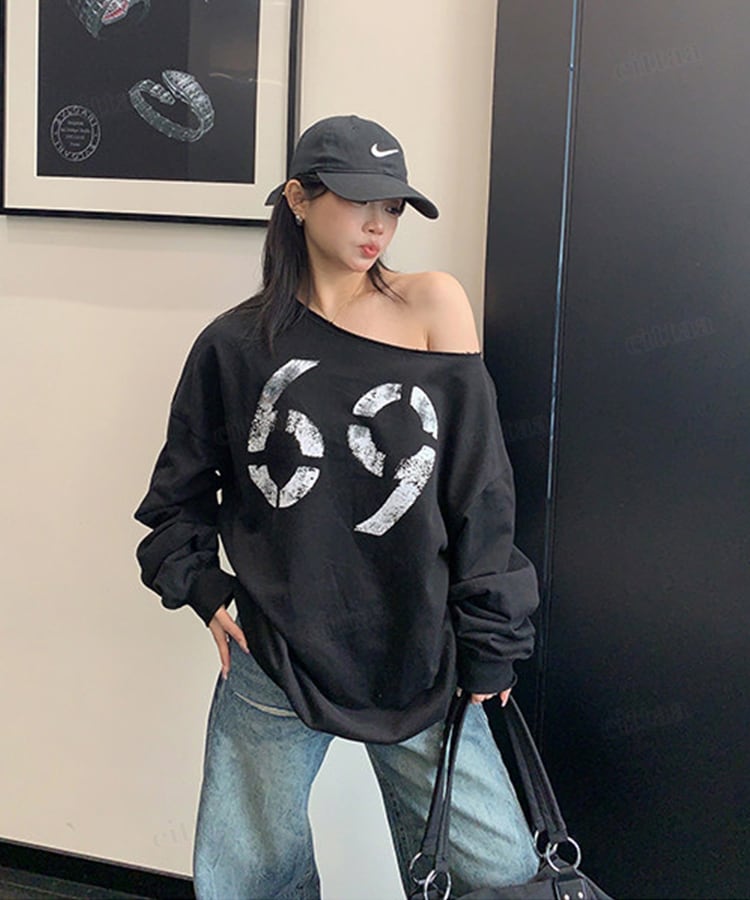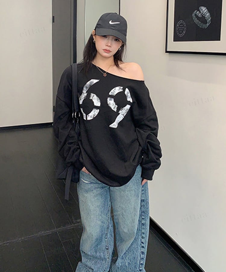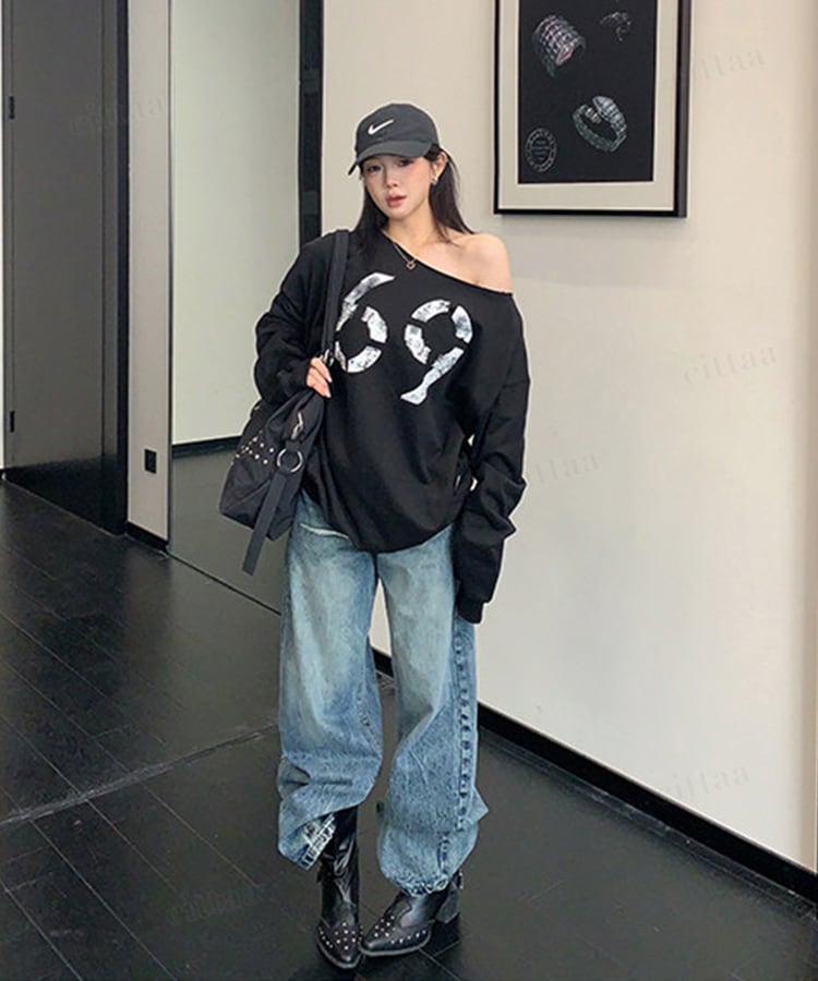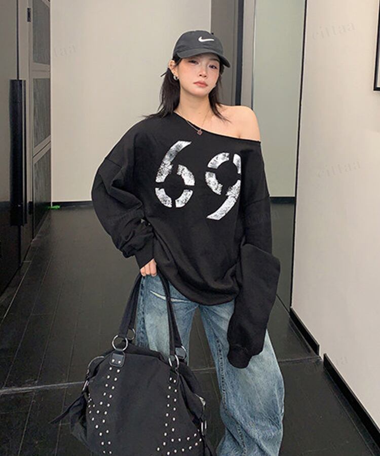 ★予約★D-933 2026新作♡69かすれロゴオフショルダー長袖Tシャツ ブラック