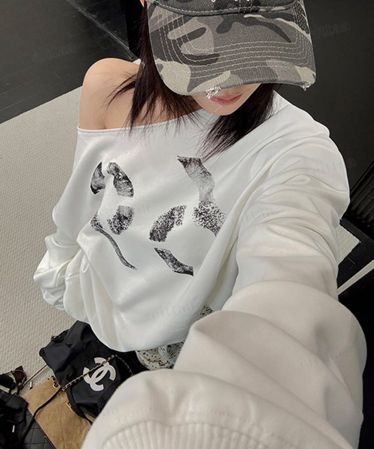 かすれロゴでこなれ感たっぷりオフショルダートップス