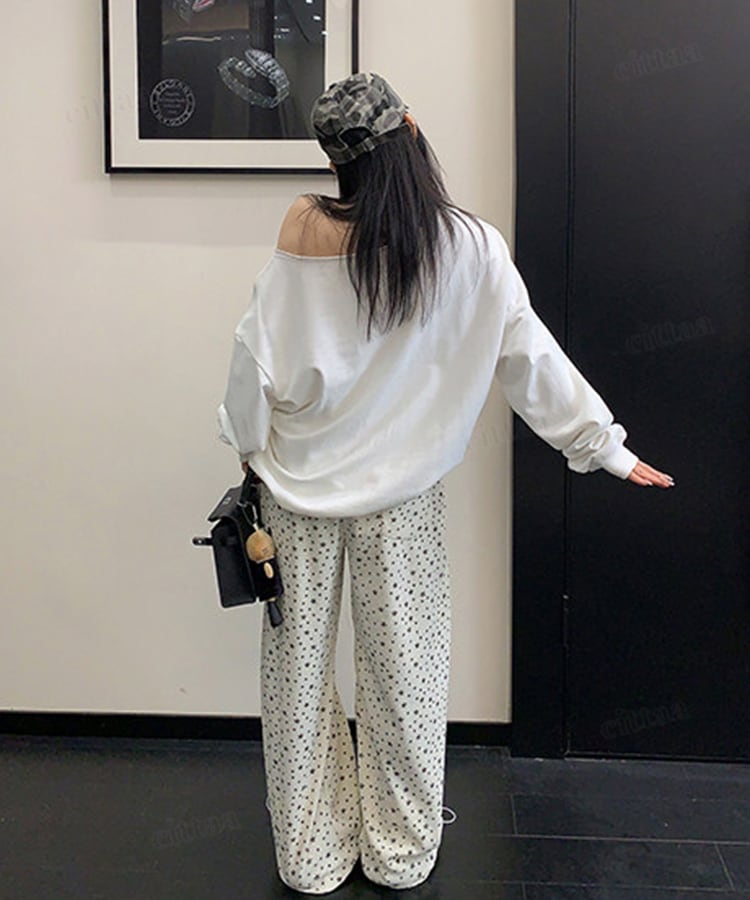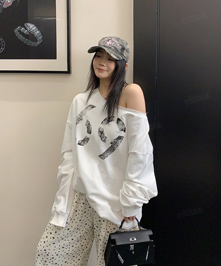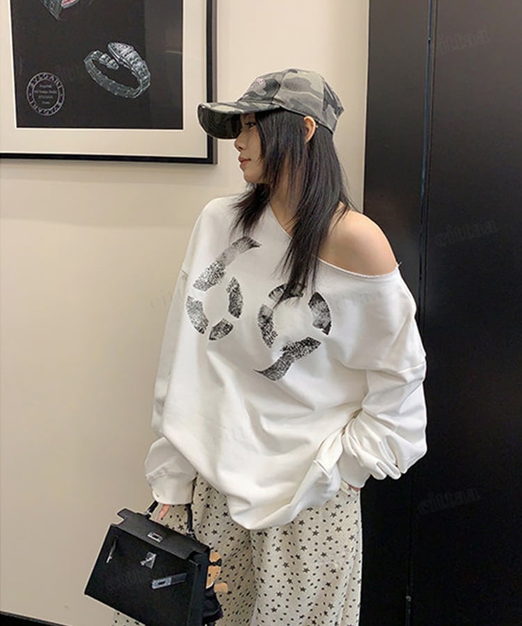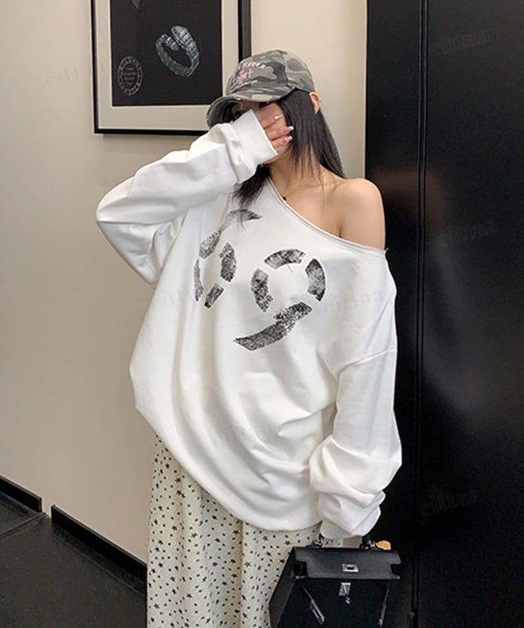 フロントに大胆に配置されたナンバーロゴが視線を引く一枚。かすれプリントがヴィンテージライクな雰囲気を演出します。切りっぱなし仕様のオフショルダーで、抜け感のある大人っぽい着こなしに。