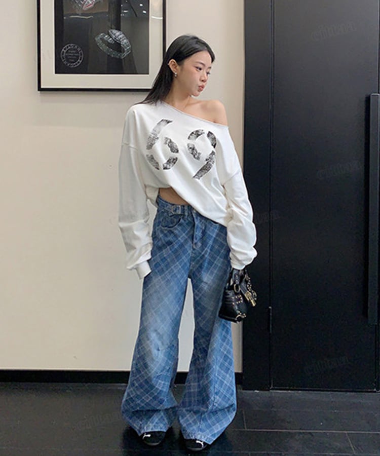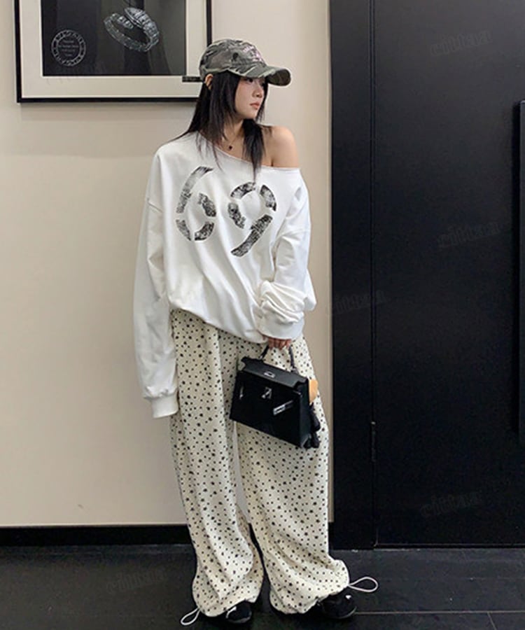 ★予約★D-933 2026新作♡69かすれロゴオフショルダー長袖Tシャツ ホワイト
