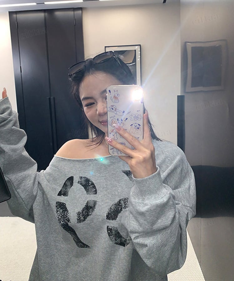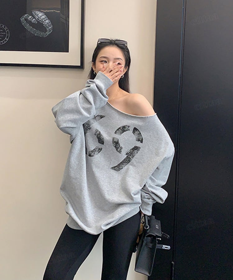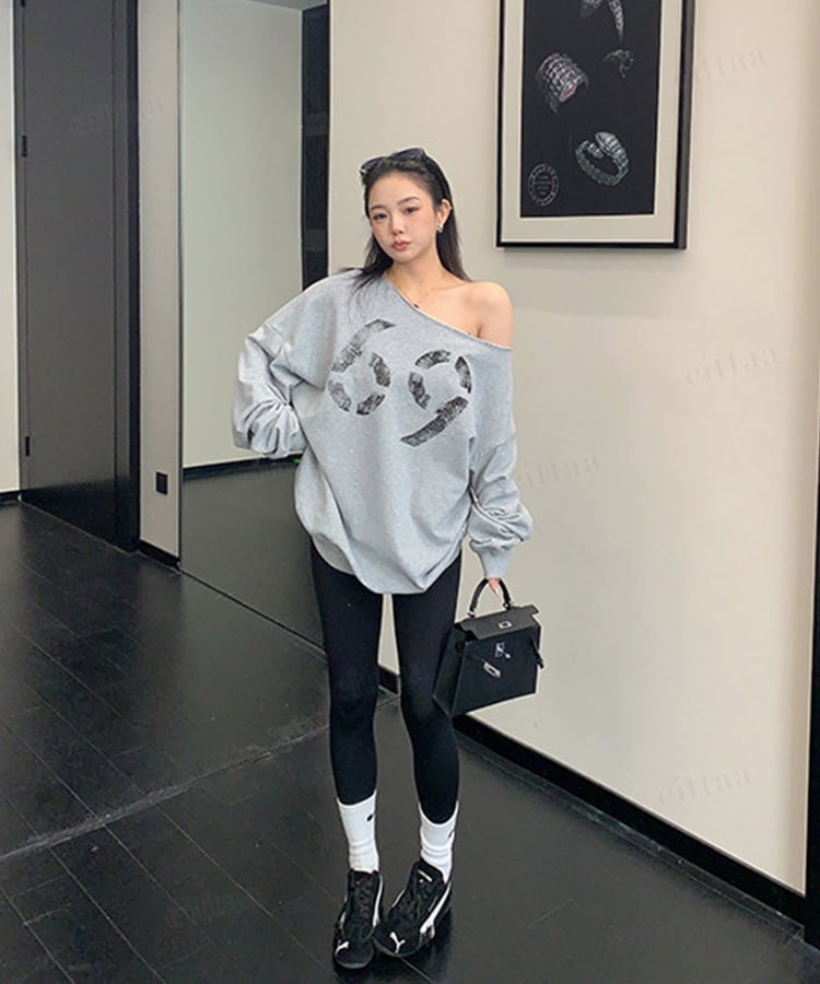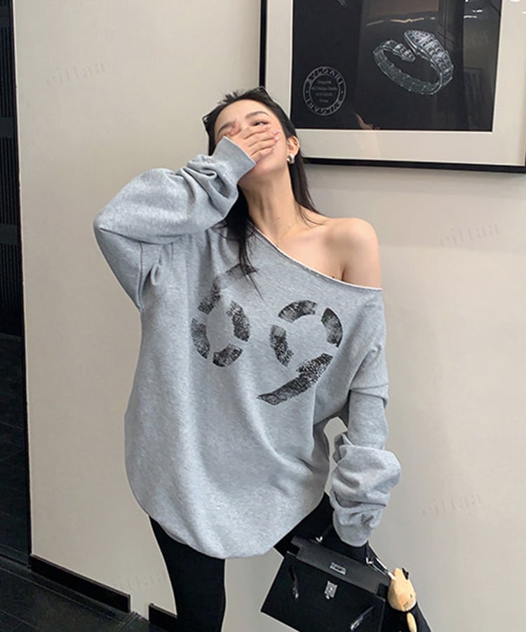 フロントに大胆に配置されたナンバーロゴが視線を引く一枚。かすれプリントがヴィンテージライクな雰囲気を演出します。切りっぱなし仕様のオフショルダーで、抜け感のある大人っぽい着こなしに。
