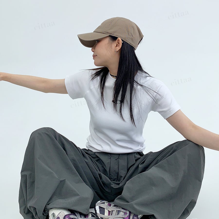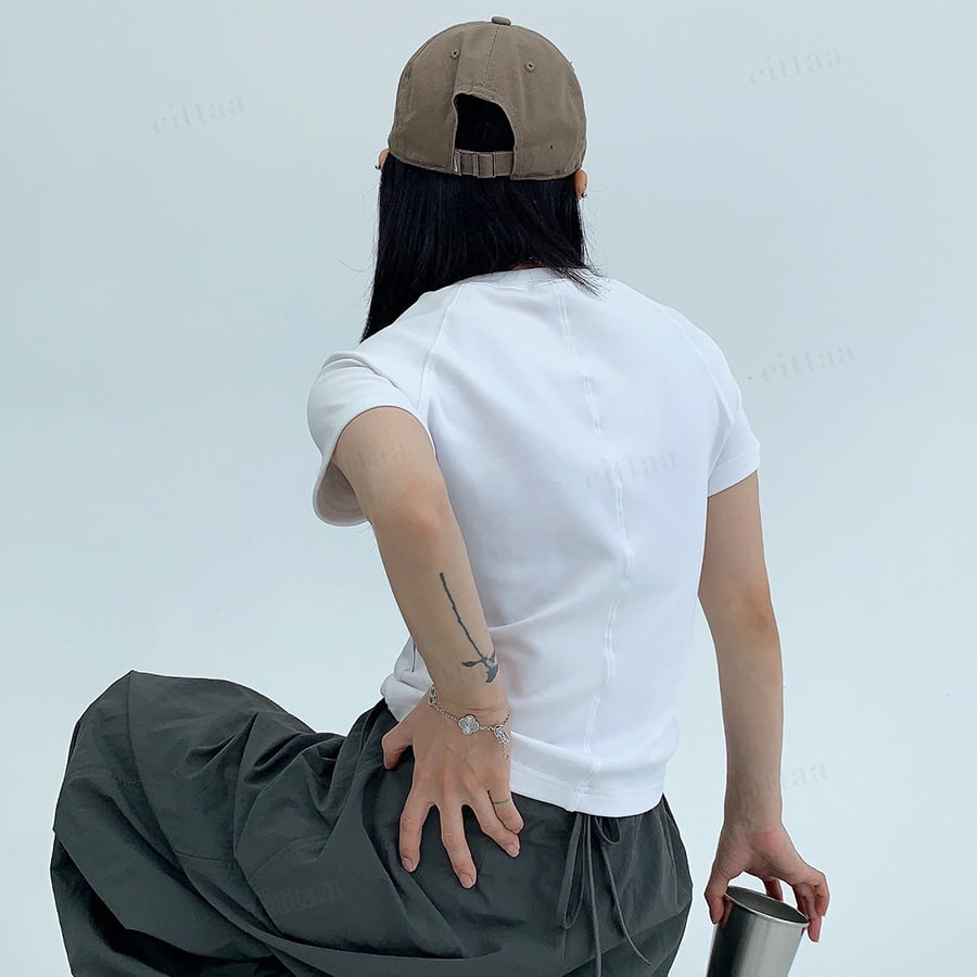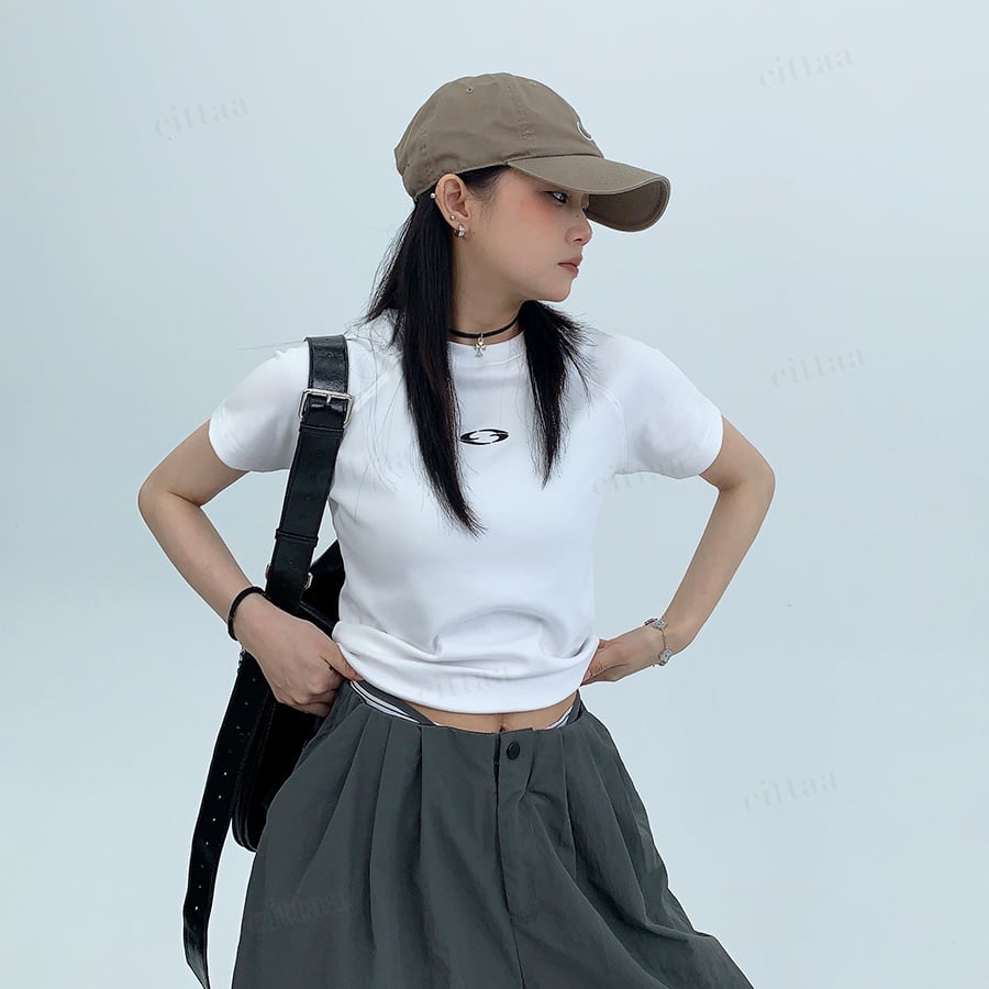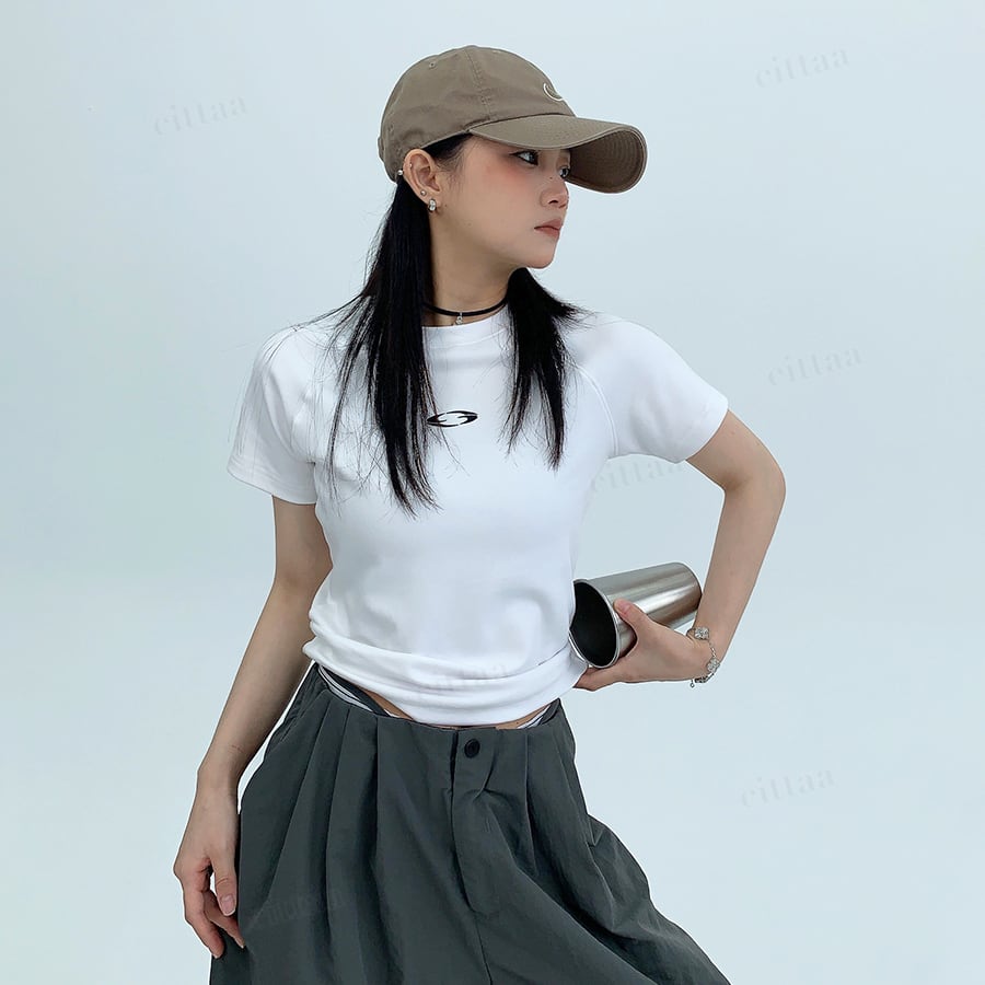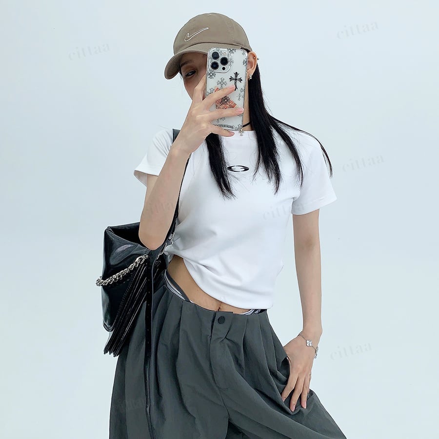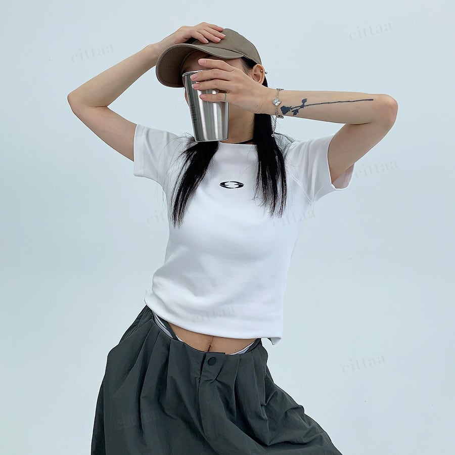 ★予約★D-940 2026春新作♡ワンポイント刺繍ショート丈スリムフィットTシャツ ホワイト
