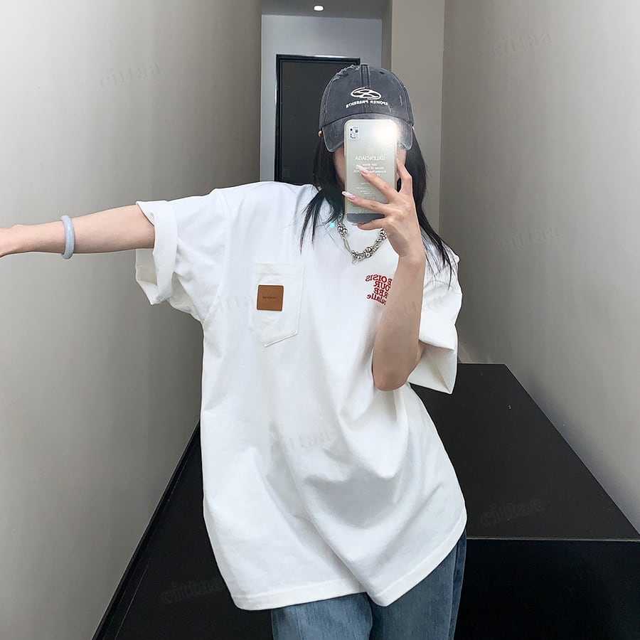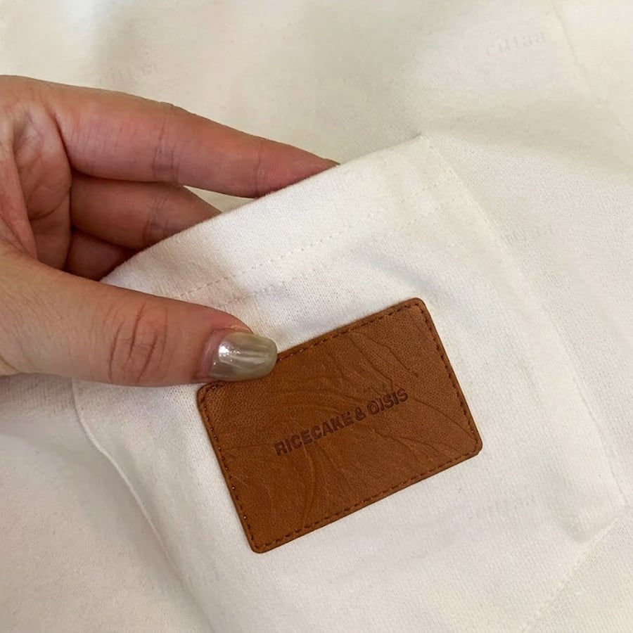 着映え感抜群フェイクレザーラベル×赤ロゴTシャツ