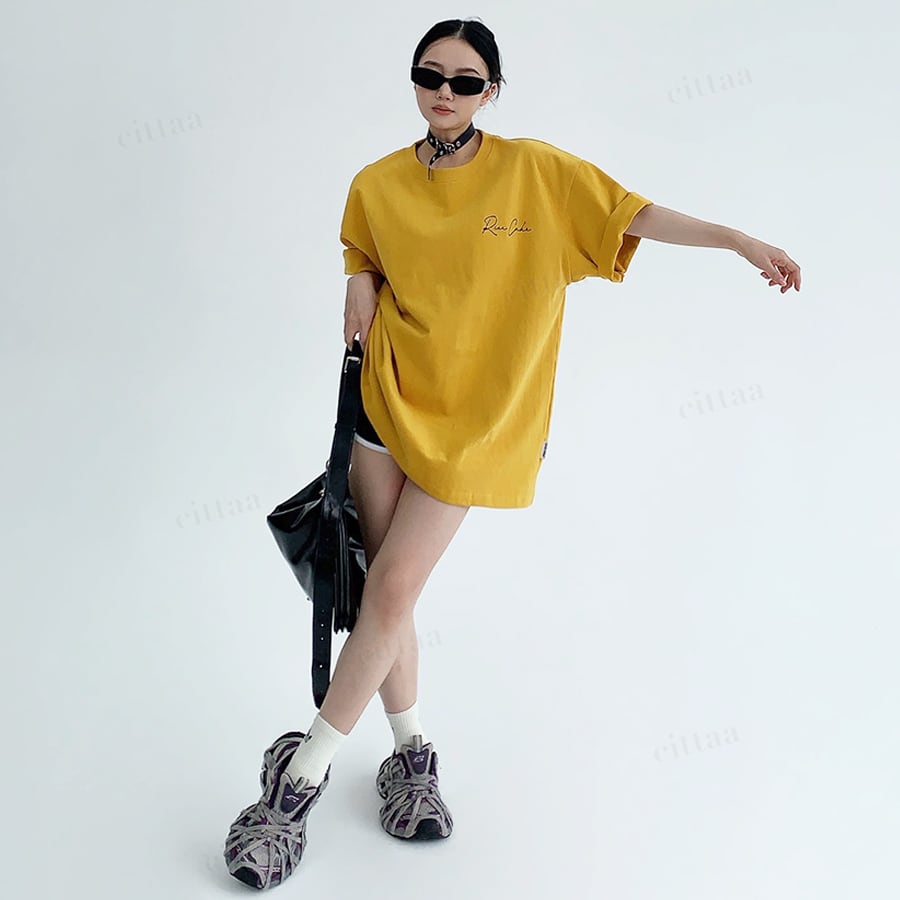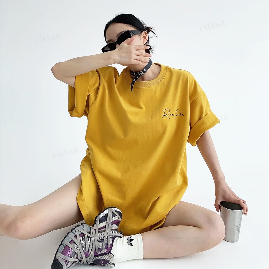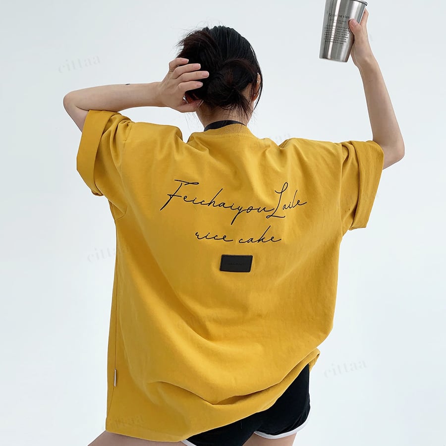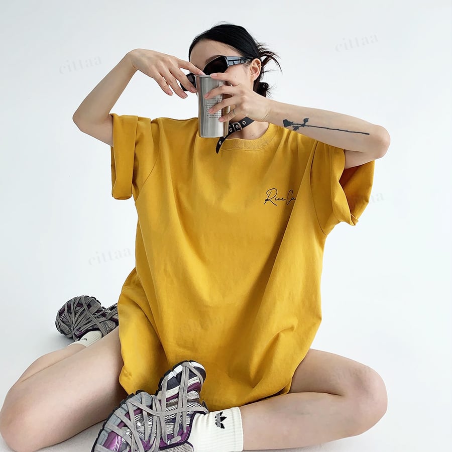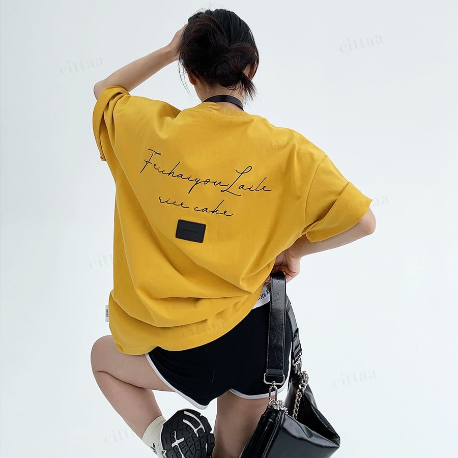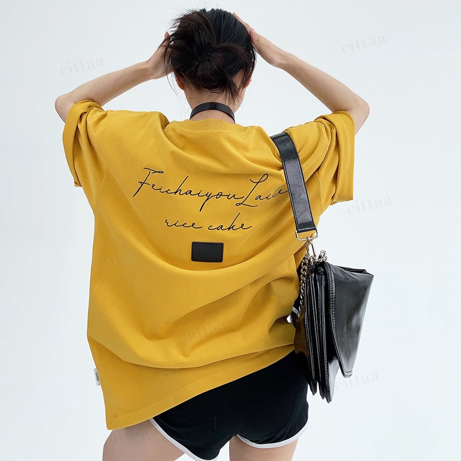 ★予約★D-943 2026春新作♡RICECAKEフェイクレザーラベル付き筆記体ロゴ半袖Tシャツ イエロー