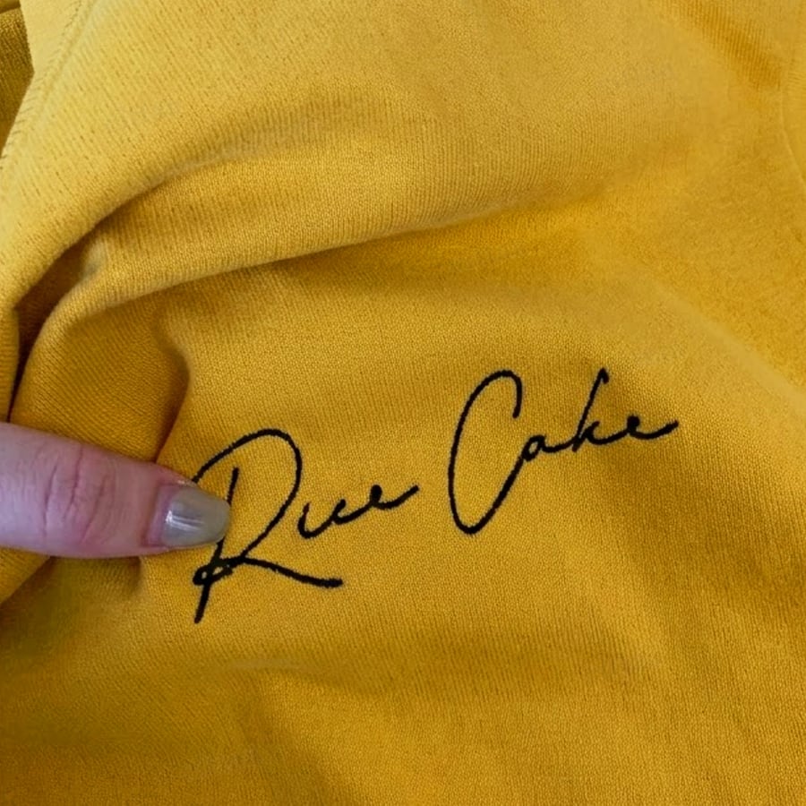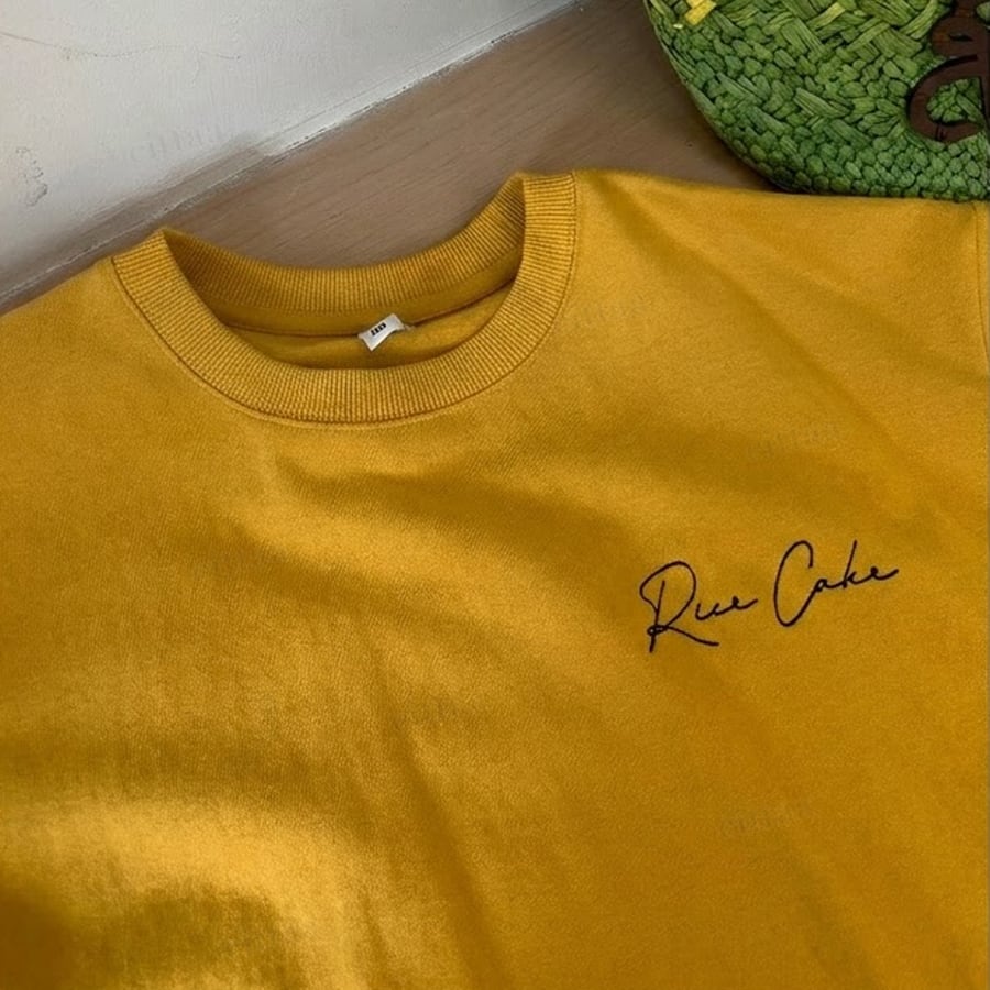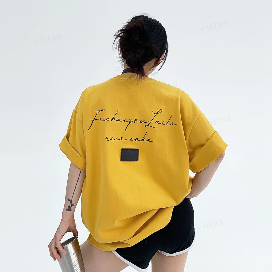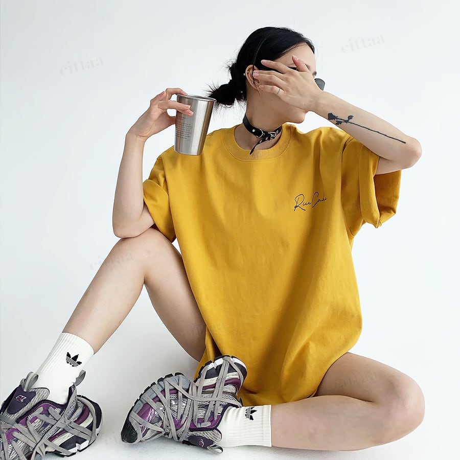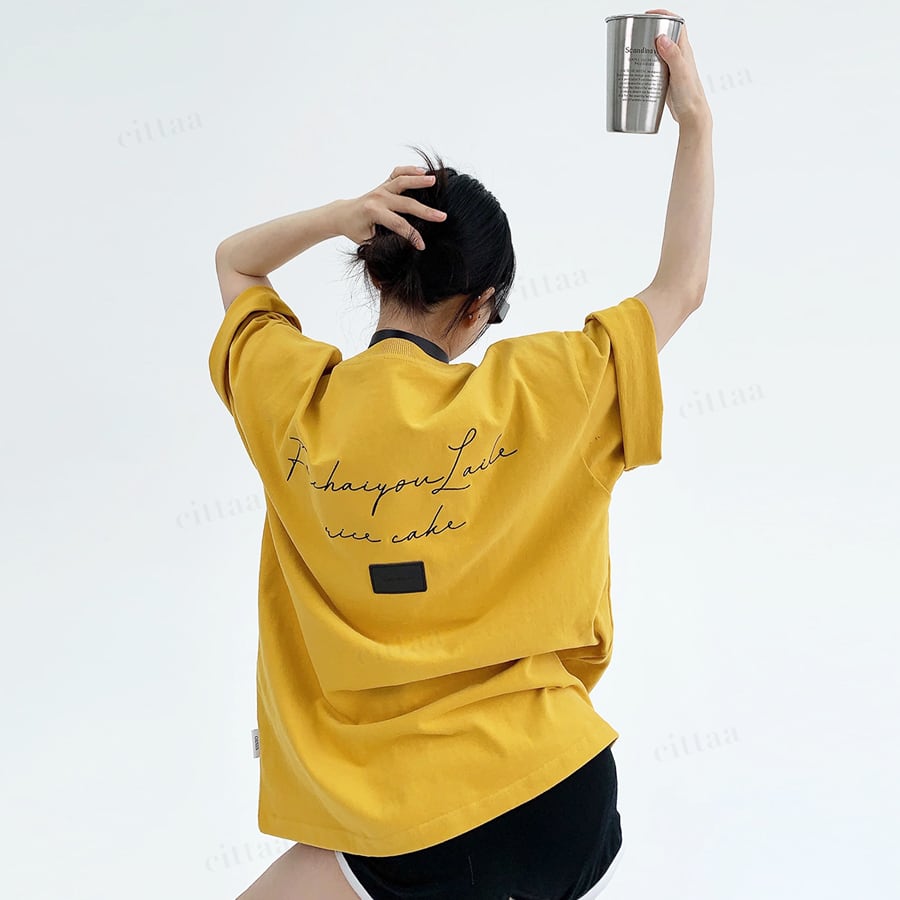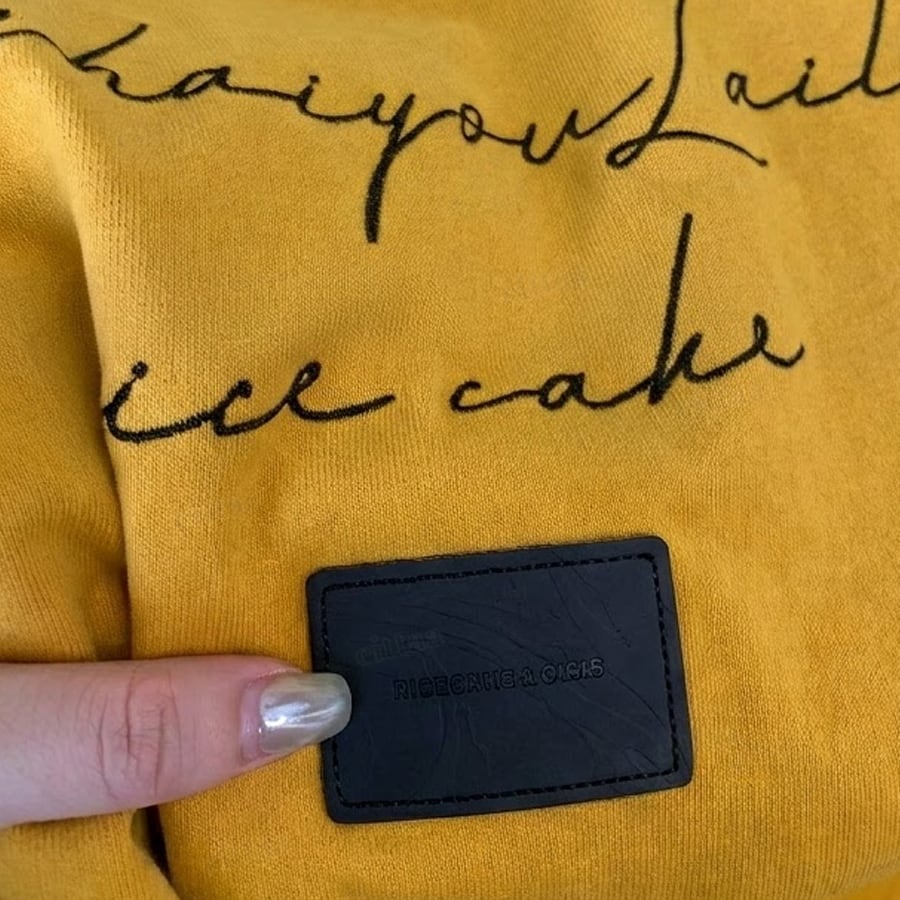 ★予約★D-943 2026春新作♡RICECAKEフェイクレザーラベル付き筆記体ロゴ半袖Tシャツ イエロー