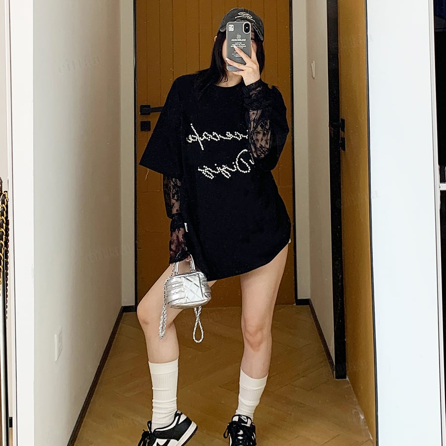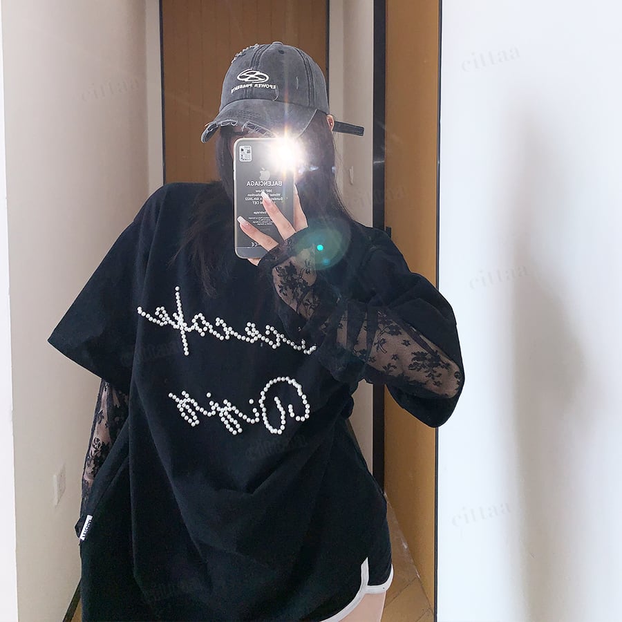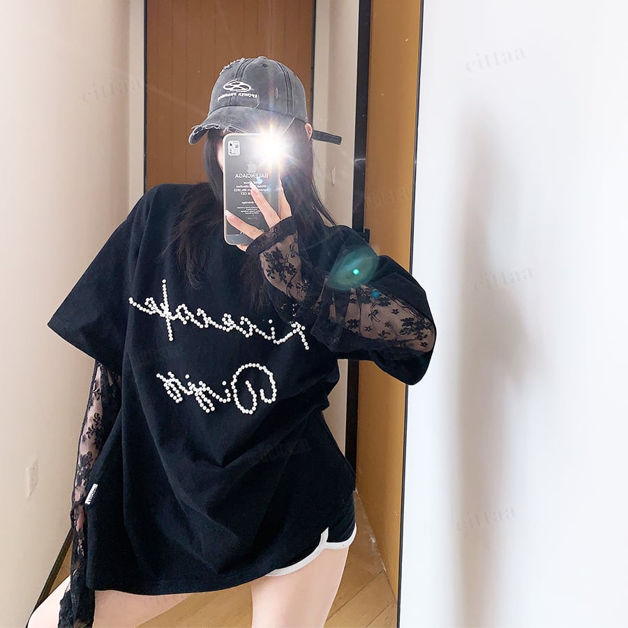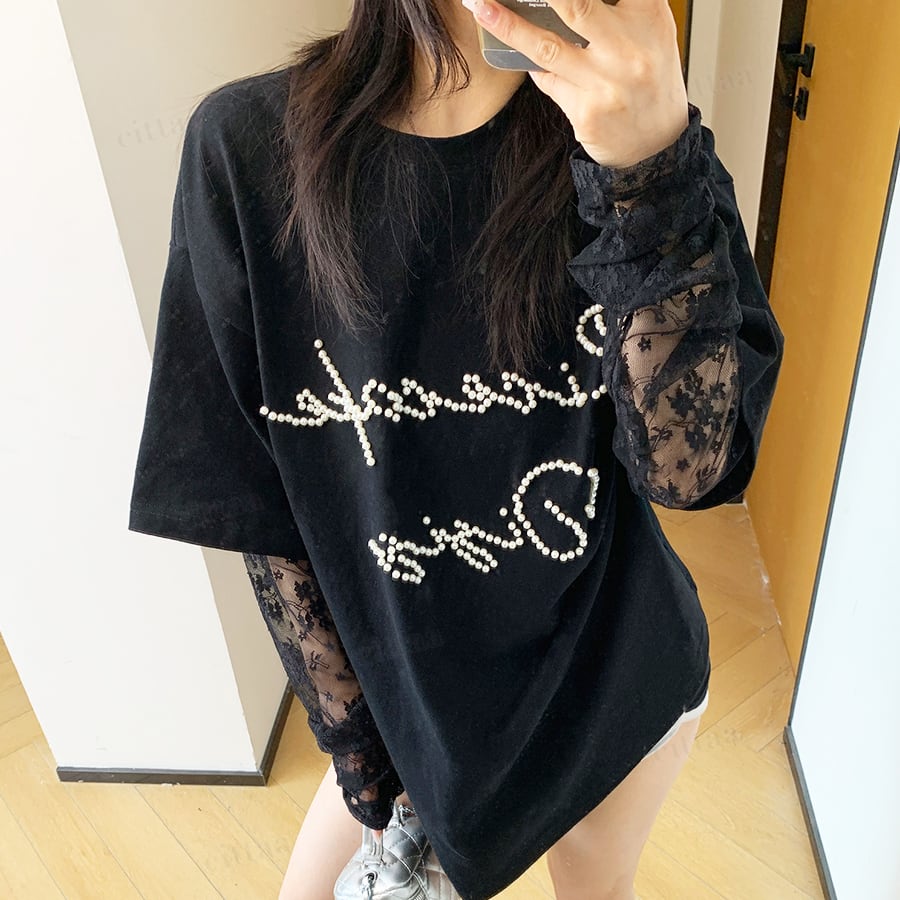 袖がレース生地になったレイヤード風デザインで、着るだけでトレンド感のあるスタイリングが完成。フロントのビーズロゴがさりげなく輝き、周りと差がつくアクセントに。