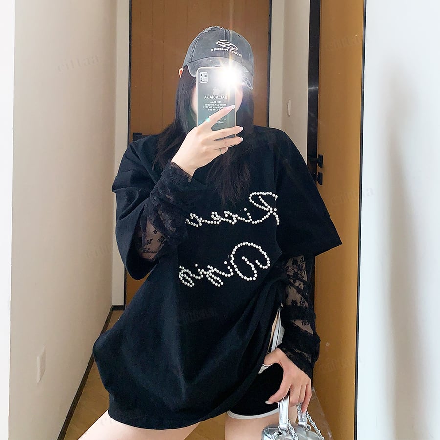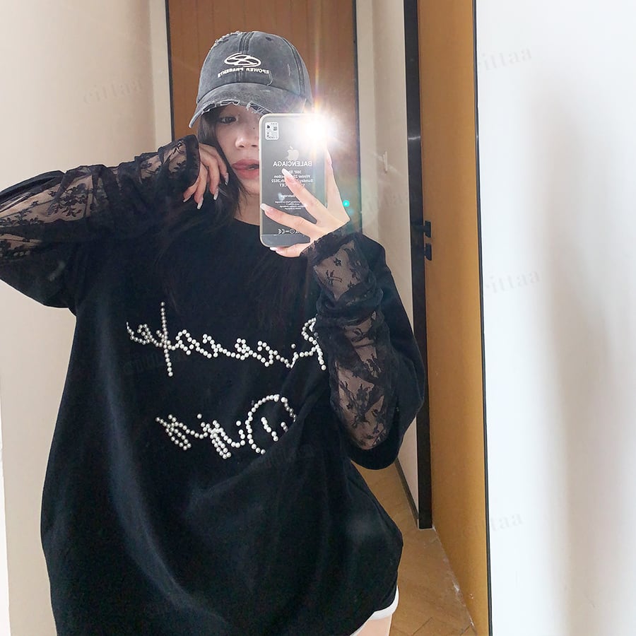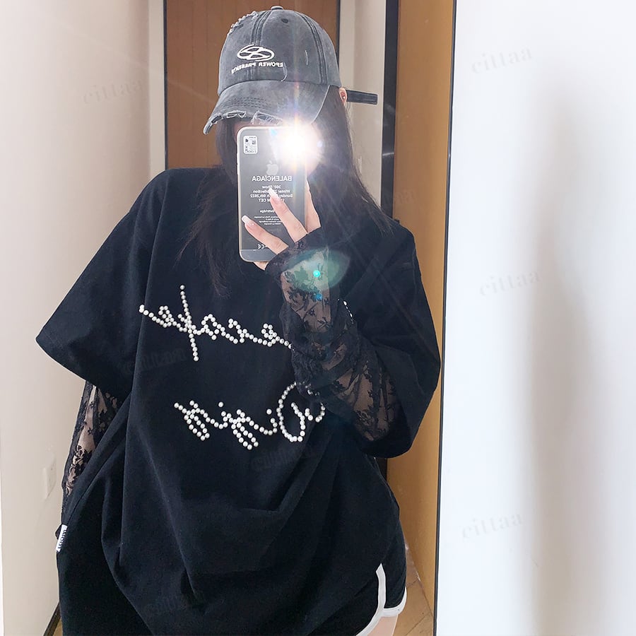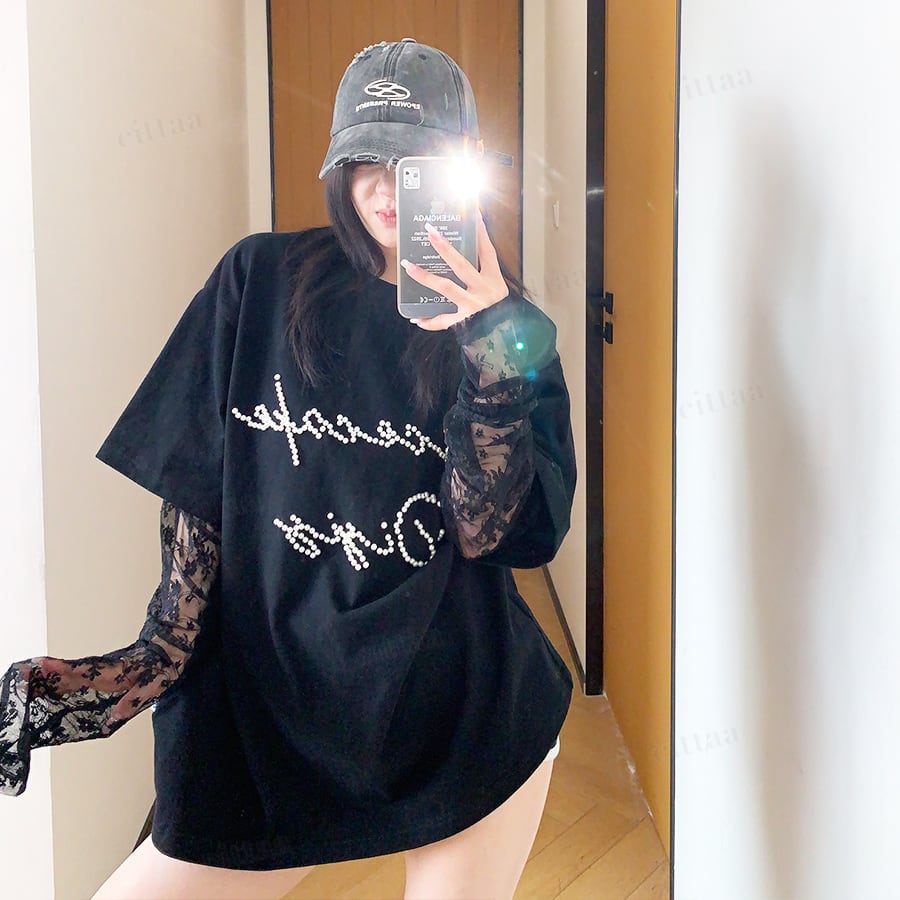 袖がレース生地になったレイヤード風デザインで、着るだけでトレンド感のあるスタイリングが完成。フロントのビーズロゴがさりげなく輝き、周りと差がつくアクセントに。