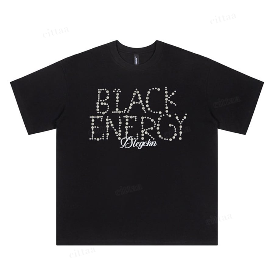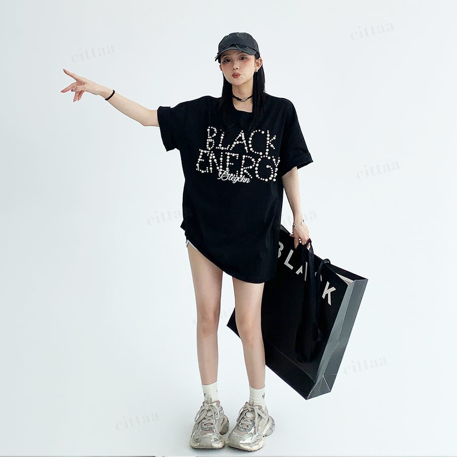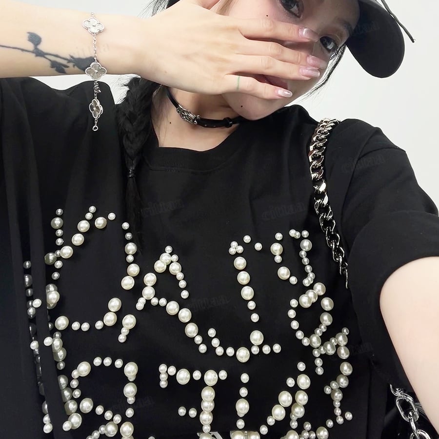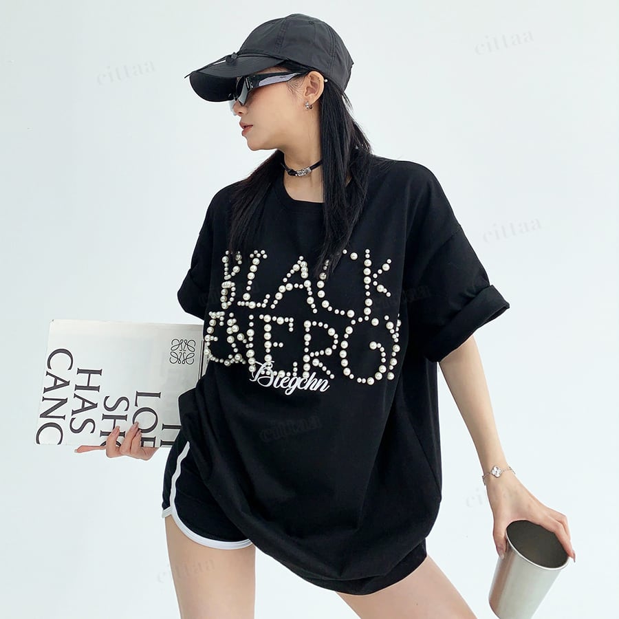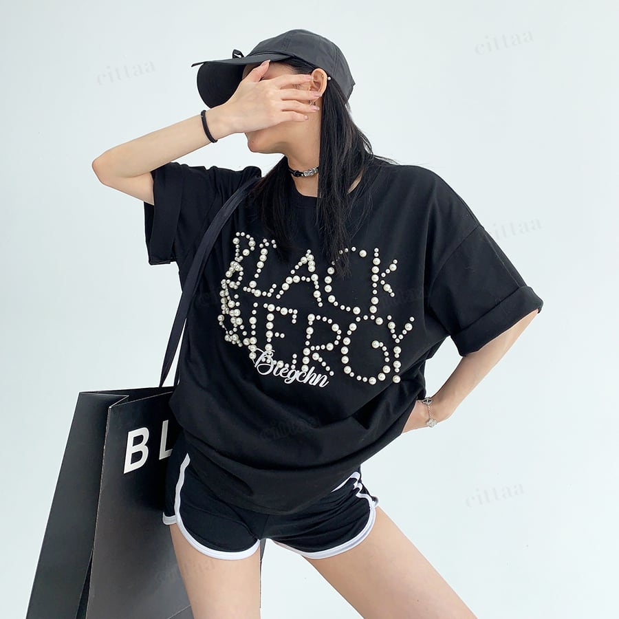 ★予約★D-947 2026春新作♡BLACKランダムパールビーズロゴ半袖Tシャツ ブラック