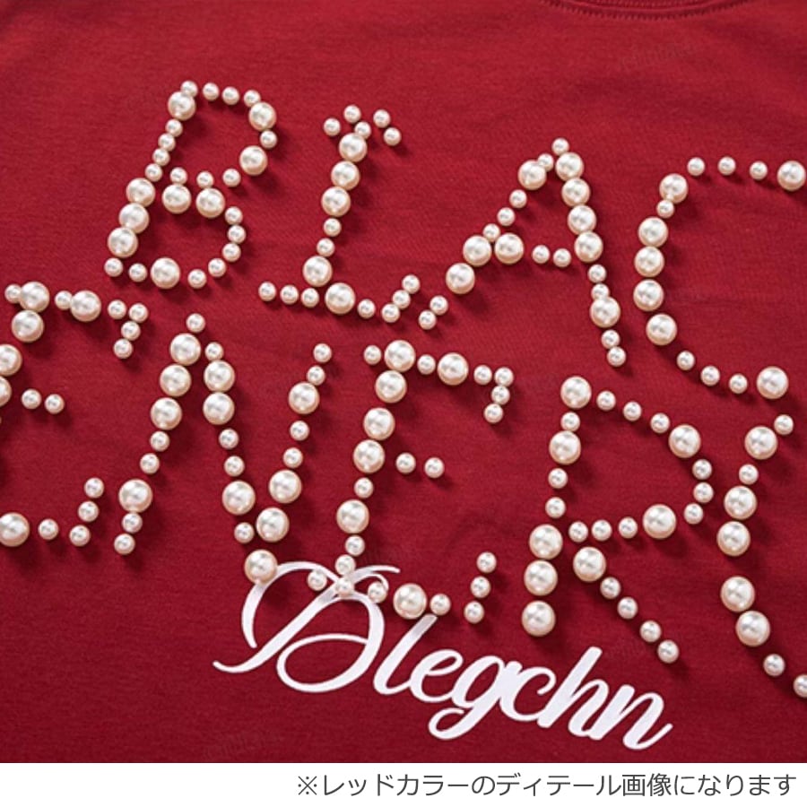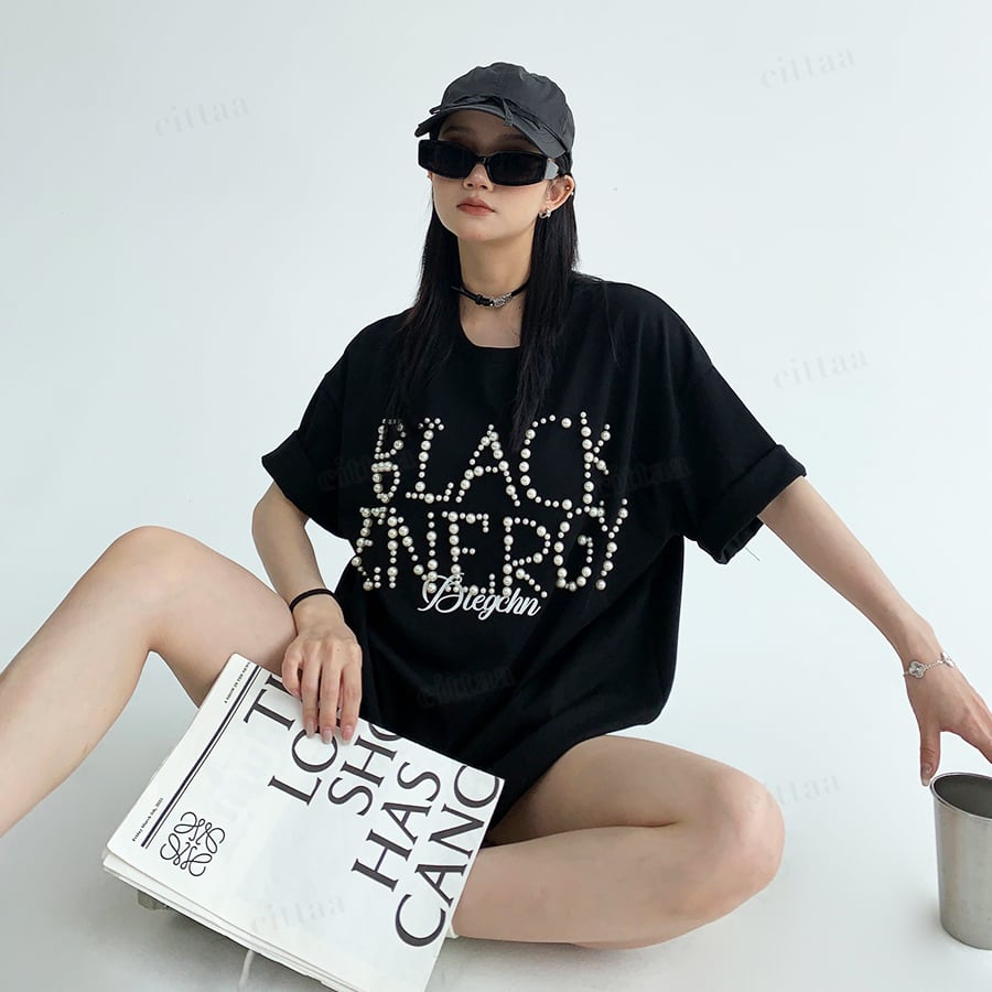 フロントに大胆に配置されたロゴデザインが主役。パールビーズが立体感をプラスし、カジュアルながら大人っぽい雰囲気に仕上げます。シンプルなのに高見えする一枚。