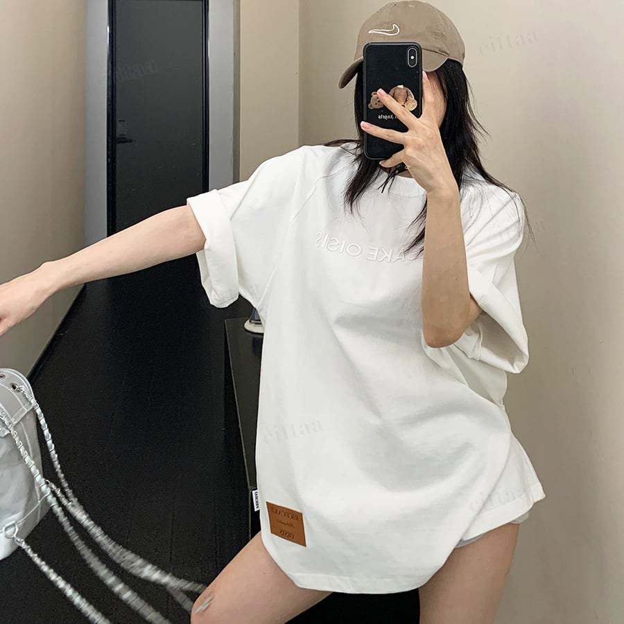 フロントとバックにあしらわれた立体ロゴがさりげないアクセントに。Tシャツと同色でまとめることで主張しすぎず、大人っぽく洗練された印象に仕上がります。裾のフェイクレザーラベルも高見えポイント。